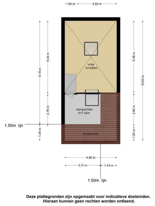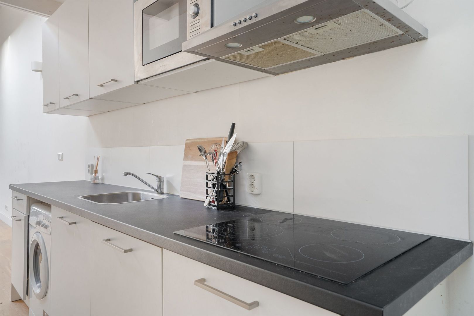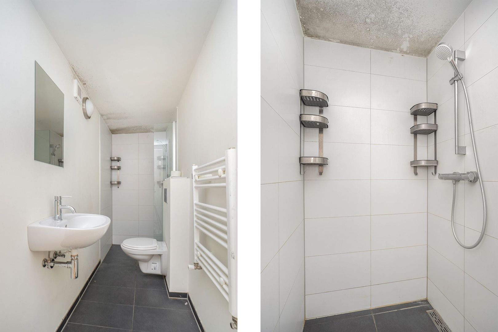 trap naar bovengelegen bergruimte; open keuken met apparatuur; wasruimte met toilet/douche en wastafel.