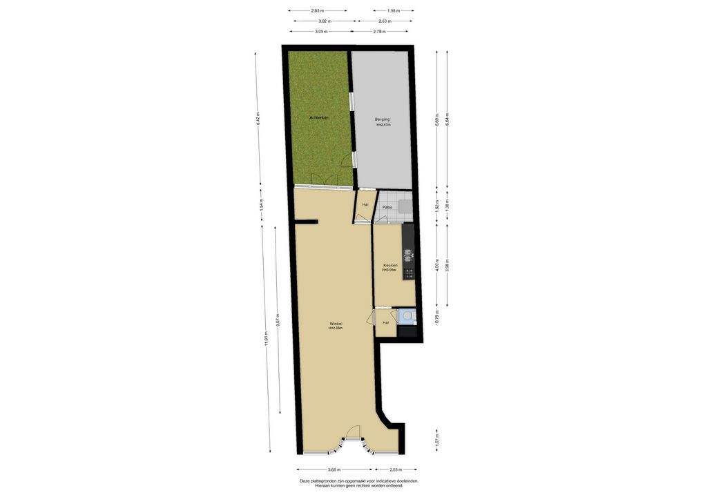 Winkelruimte ca 11(12.5)x3.05; tussenhalletje met toilet en toegang keukengedeelte ca. 4x3.6, patio achter keuken. Halletje naar achterruimte ca 6.7x2.75. Achtertuin ca 6.4x3.(evt. met goedkeuring bovenburen bij winkelruimte te trekken mits vergunning verstrekt wordt. Hierddor wordt de winkelruimte met ca. 20m2 vergroot).