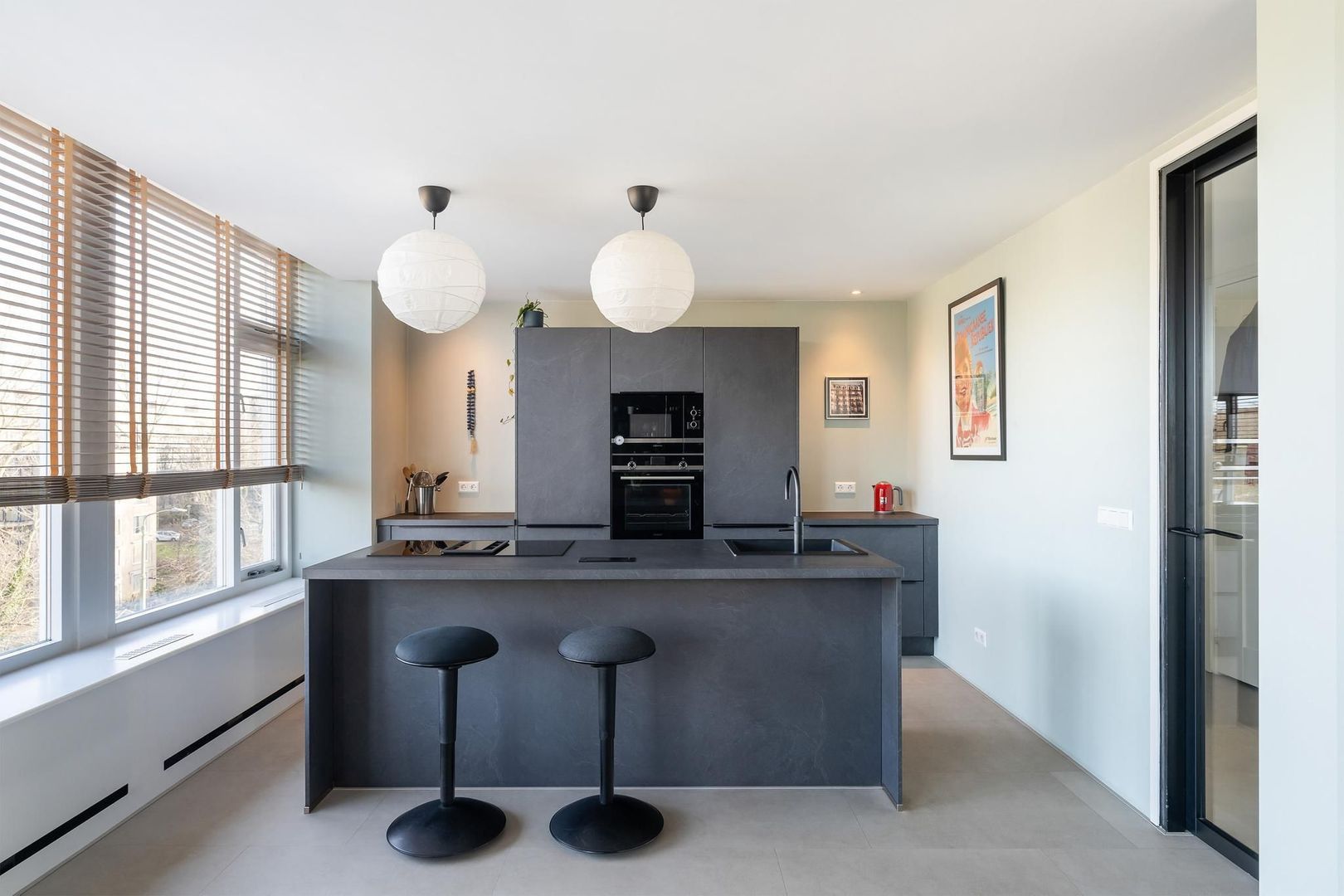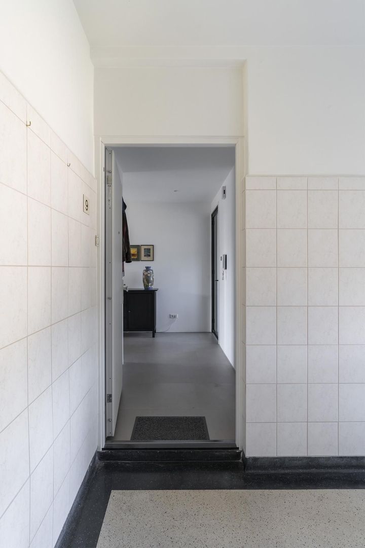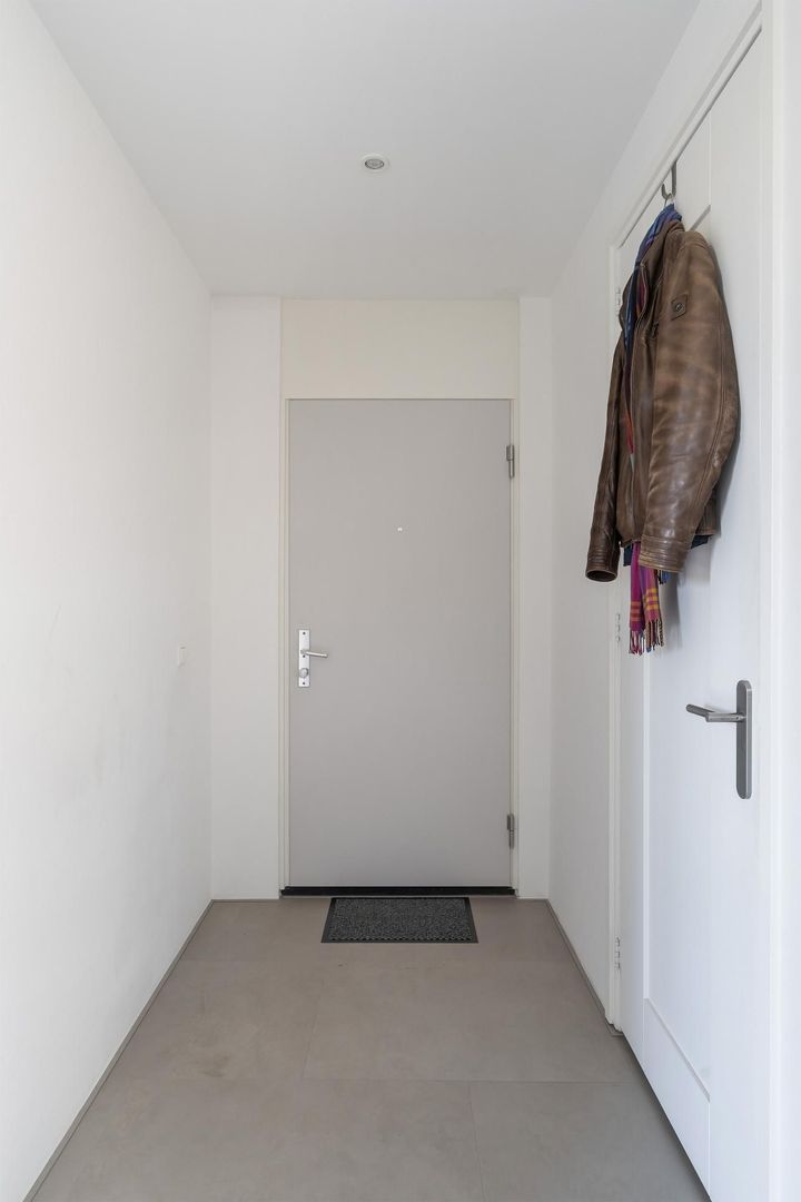 Via een kleine verhoging (2 treden) toegang tot een afgesloten entree met brievenbussen- en bellentableau. Portiek met trap naar berging in de onderbouw. Via het trappenhuis toegang tot het appartement op de 4e woonlaag. Entree, ruime hal met meterkast (10 groepen), vaste kast met opstelplaats voor een wasmachine. Modern toilet met een hangcloset, inbouwreservoir en een fonteintje. Zeer ruimtelijke en lichte woonkamer in L-vorm en met deur naar klein balkon aan de voorzijde. De woonkamer loopt door in de fraaie open woonkeuken met een kookeiland met een inductiekookplaat met geïntegreerde afzuigunit, Quooker, vaatwasser en een ontbijtbar. Daarbij een strakke rechte wandopstelling met o.a. een oven, magnetron, koel-/vriescombinatie en een 2e werkblad.