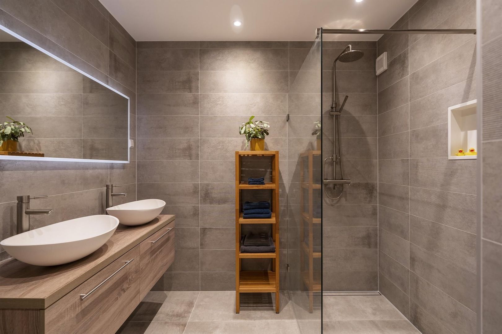 Via hal toegang tot de luxe volledig betegelde (Porcelanosa) badkamer met een inloopdouche, breed wastafelmeubel met verwarmde spiegel en dubbele waskom en een designradiator.