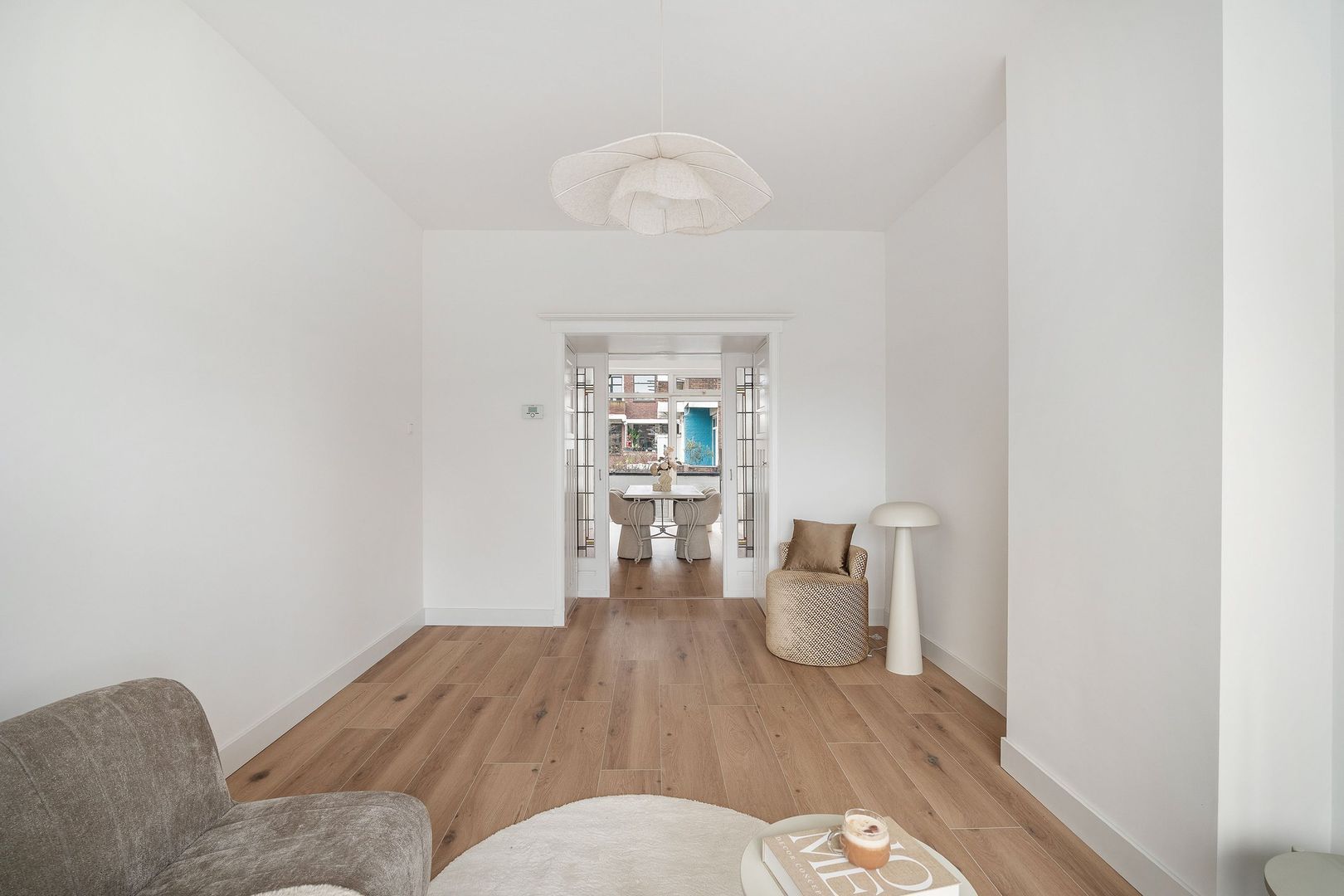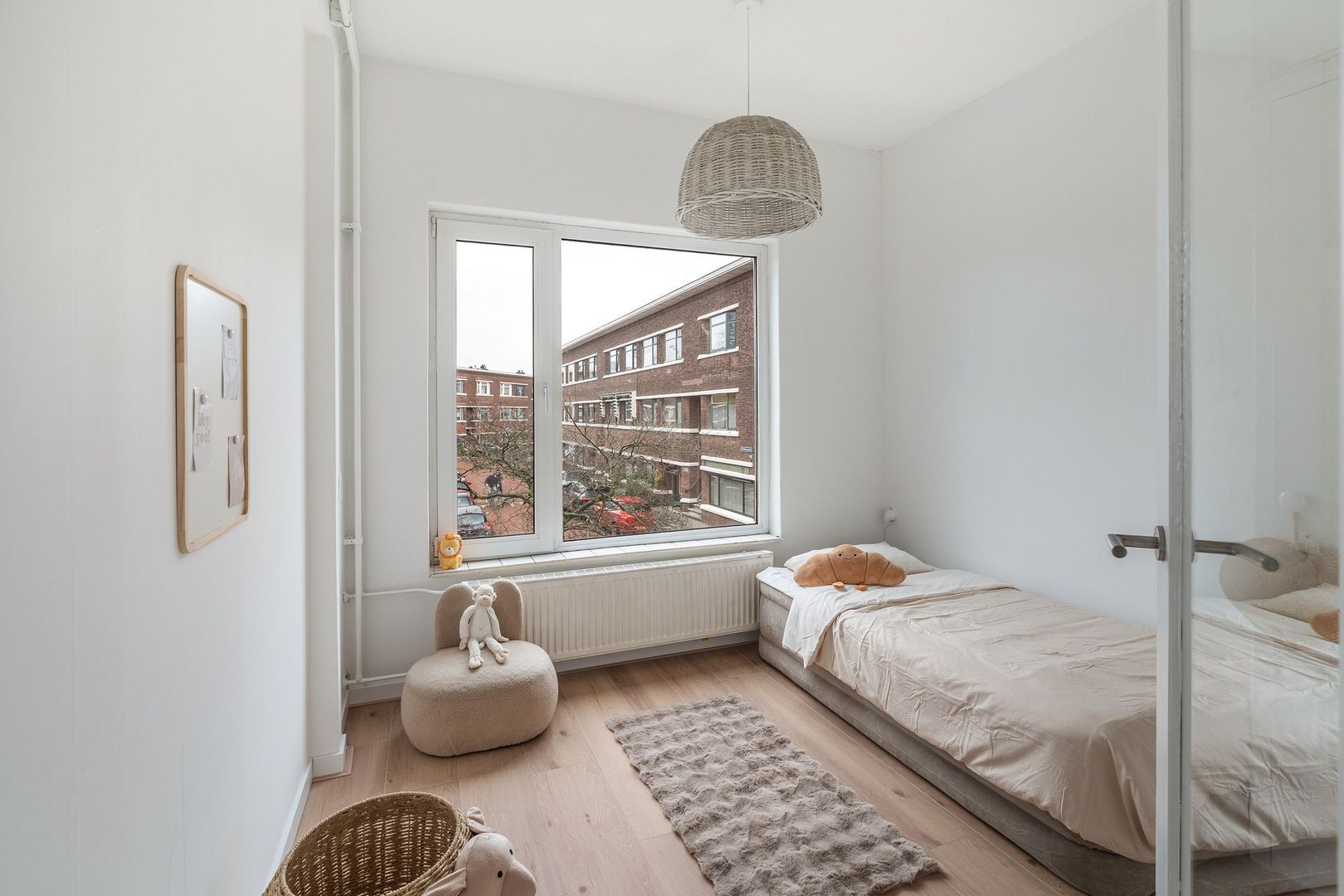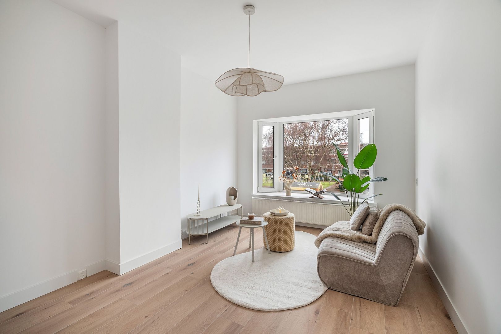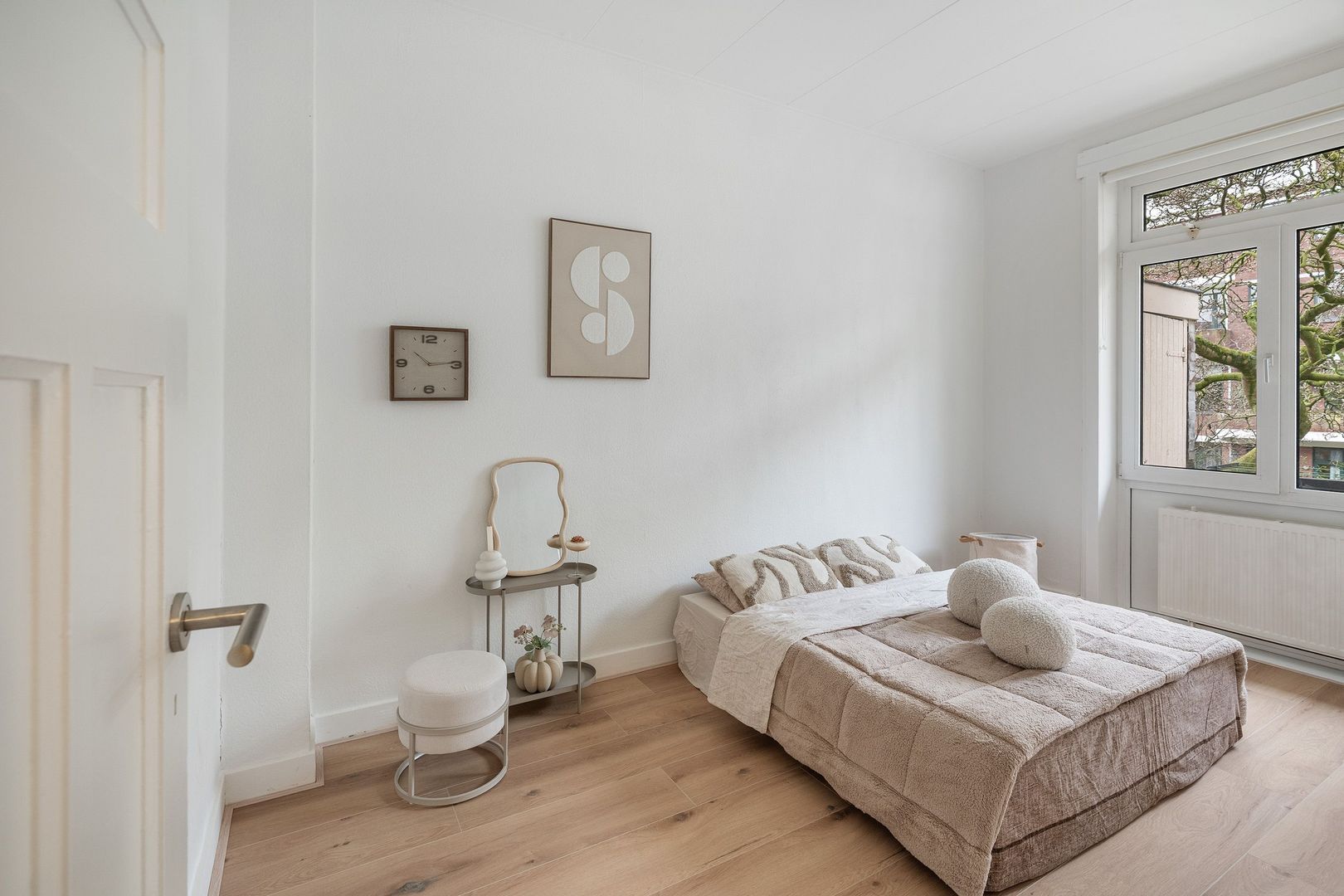 Vruchtenbuurt. Riant 4 kamer appartement (79m²) op de 1e etage met 2 achterbalkons, een riante woonkamer ensuite met een sfeervolle erker, 2 slaapkamers, een nette badkamer en kozijnen met dubbel glas.