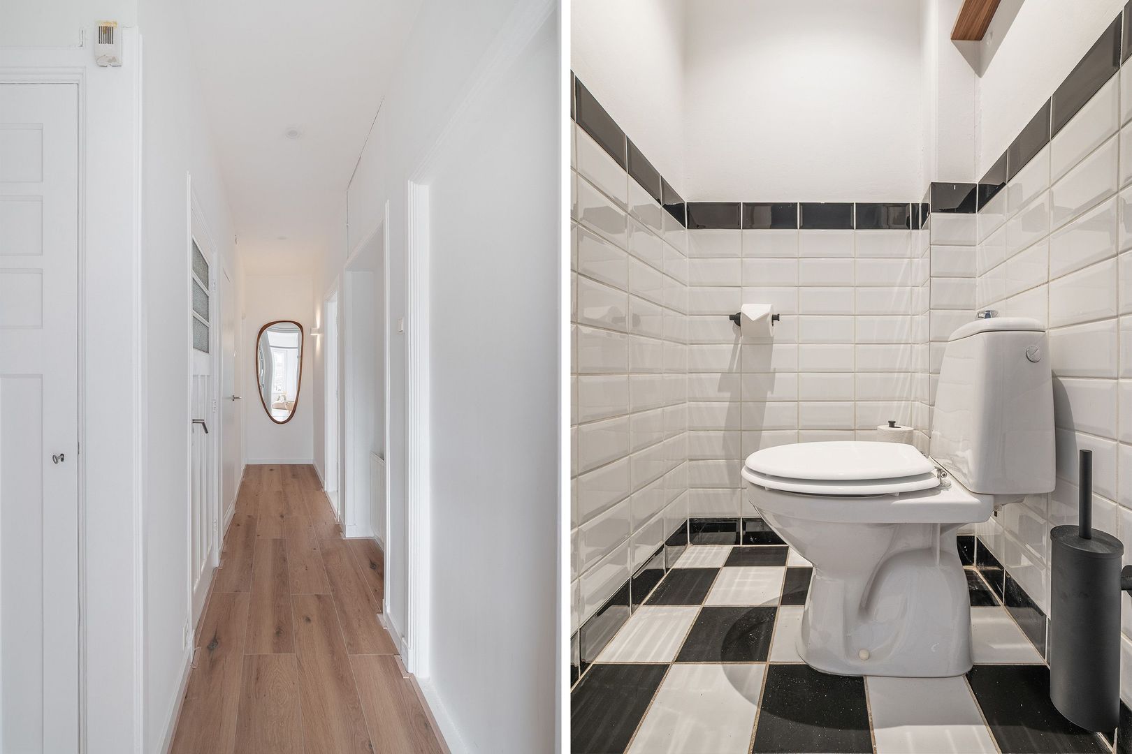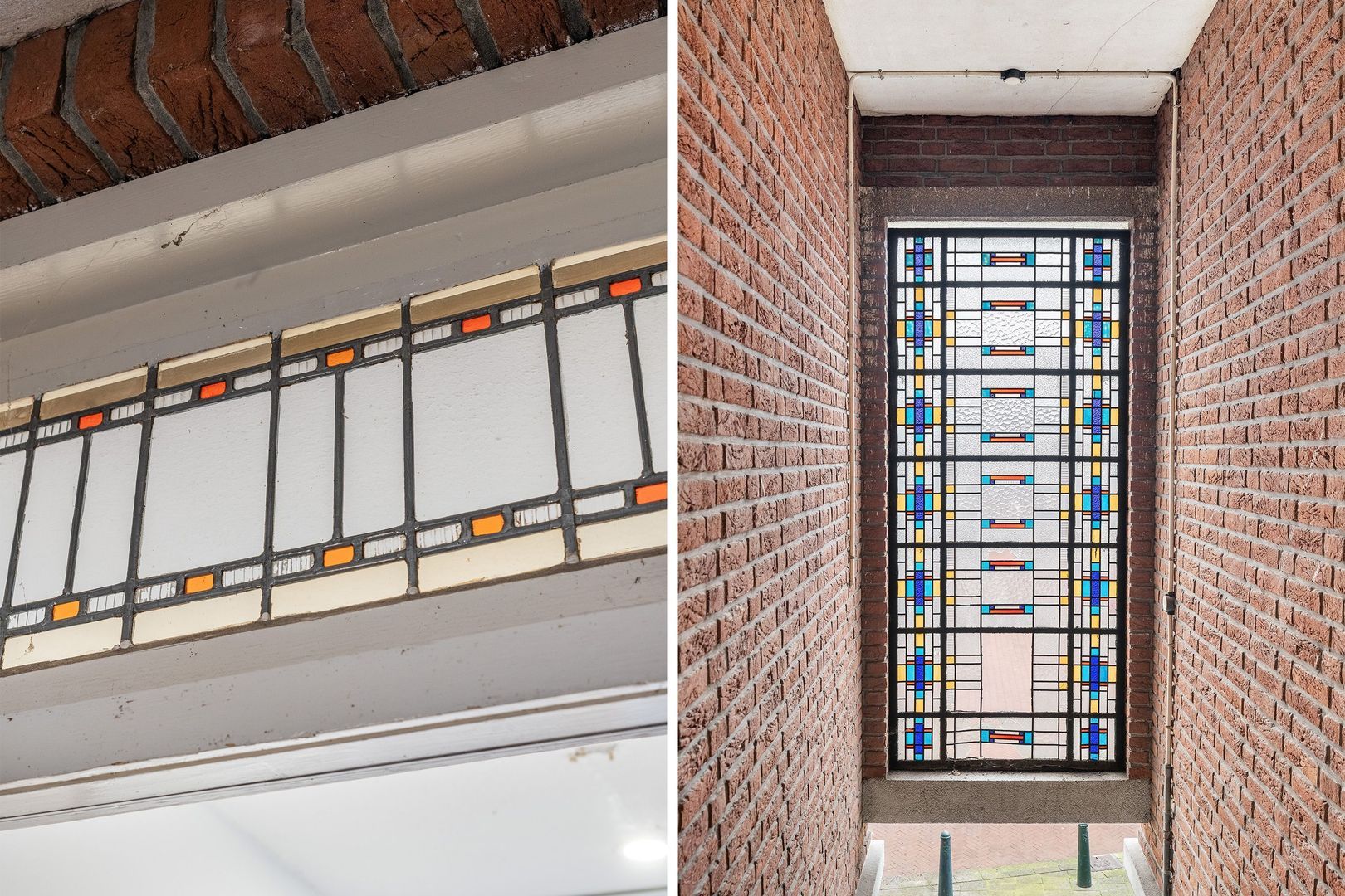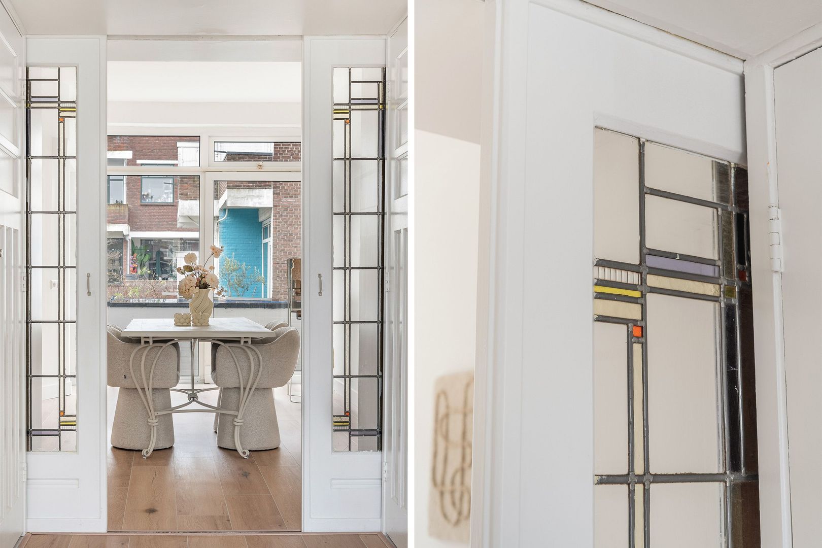 Woningentree via open portiek; entree op 1e etage: hal met vaste kast en electrameter; riante woonkamer en suite met sfeervolle erker, suite kasten, schuifseparatie naar achterkamer met schuifpui naar het 1e balkon, half open keuken met 4 pits-gaskookplaat, afzuigkap en oven en toegang tot het 2e balkon met balkonkast; 1e slaapkamer aan de voorzijde met vaste kast; 2e slaapkamer aan de achterzijde; nette badkamer met douche en een wastafelmeubel; separaat toilet.
