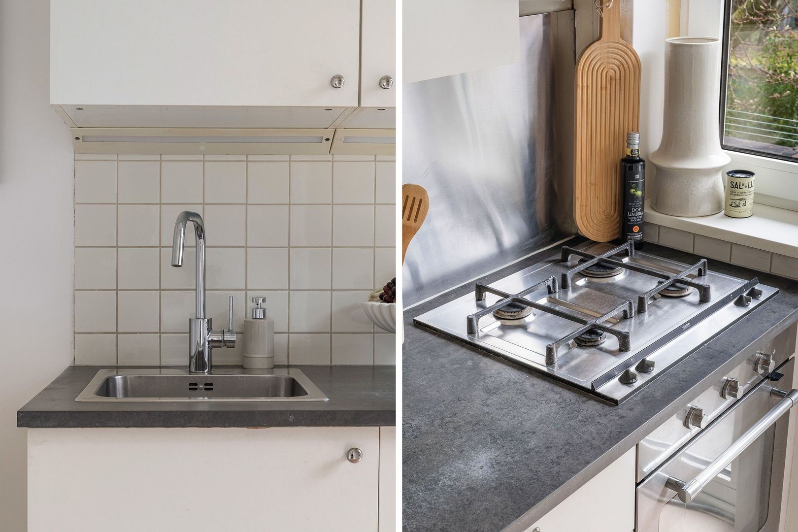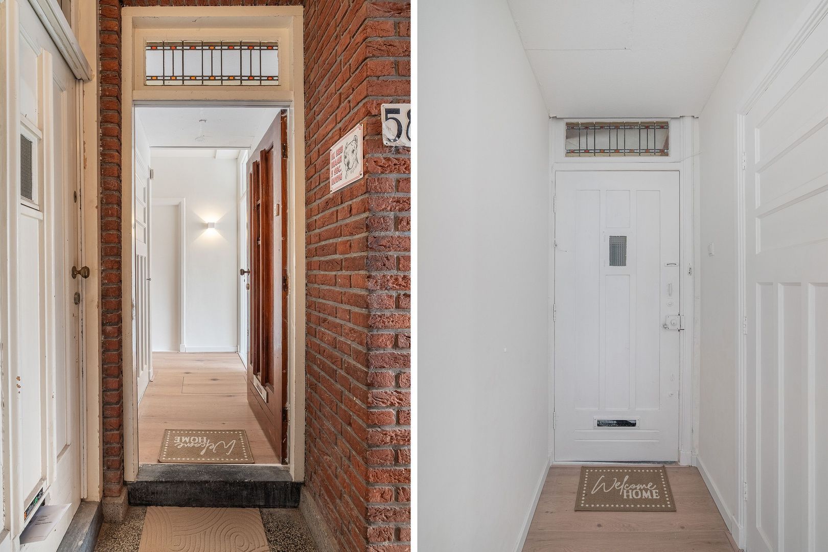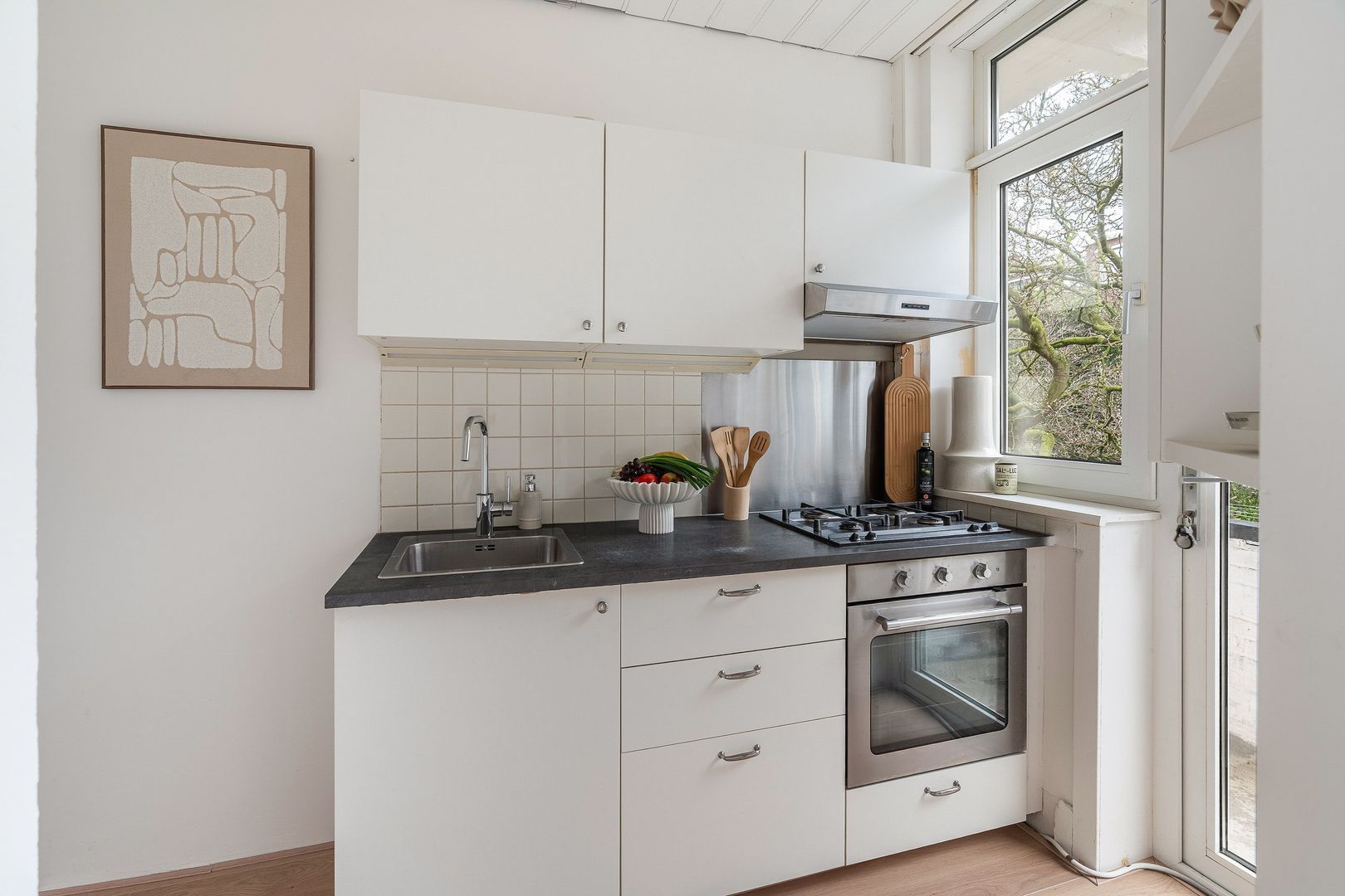 Woningentree via open portiek; entree op 1e etage: hal met vaste kast en electrameter; riante woonkamer en suite met sfeervolle erker, suite kasten, schuifseparatie naar achterkamer met schuifpui naar het 1e balkon, half open keuken met 4 pits-gaskookplaat, afzuigkap en oven en toegang tot het 2e balkon met balkonkast; 1e slaapkamer aan de voorzijde met vaste kast; 2e slaapkamer aan de achterzijde; nette badkamer met douche en een wastafelmeubel; separaat toilet.