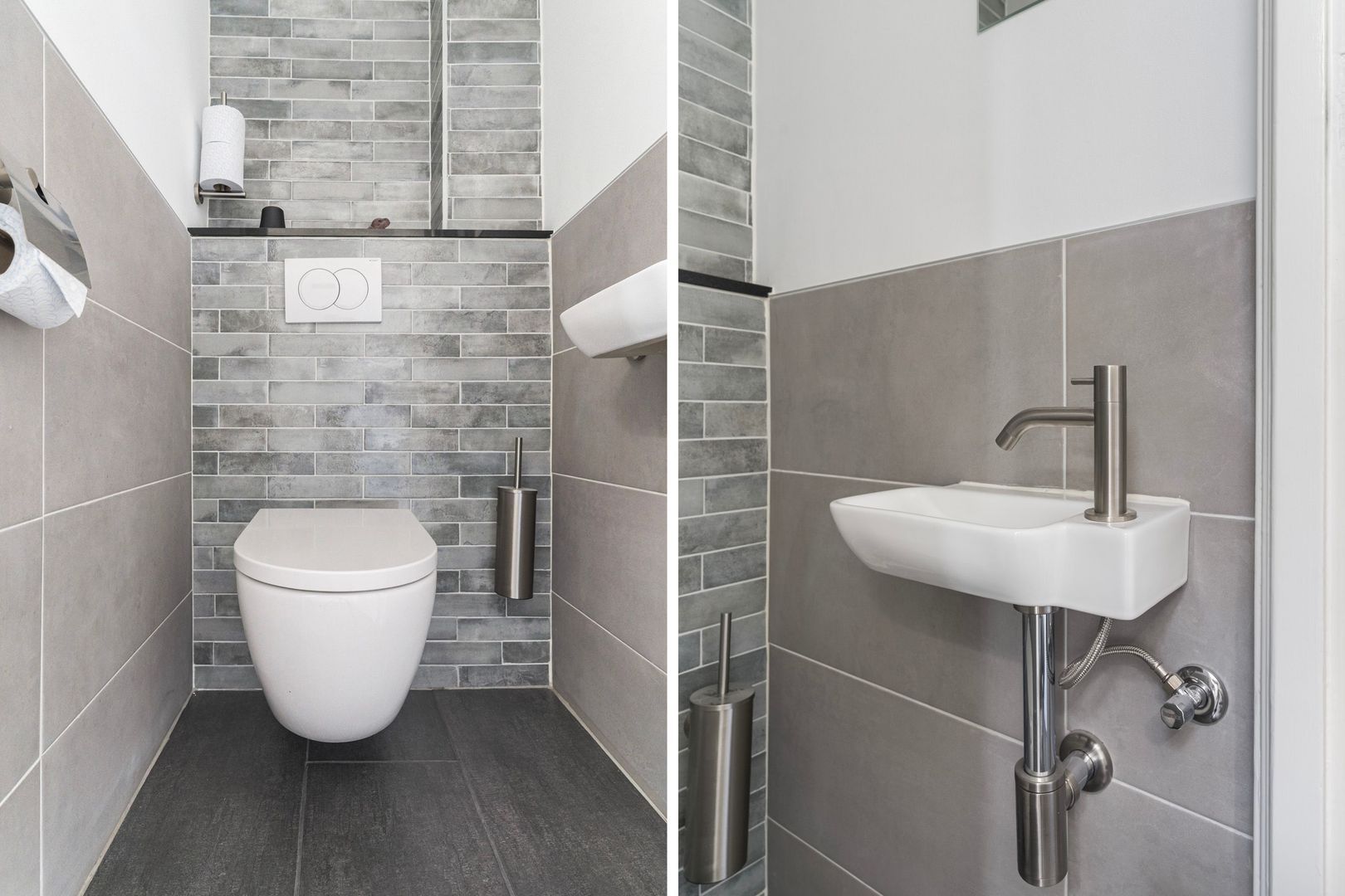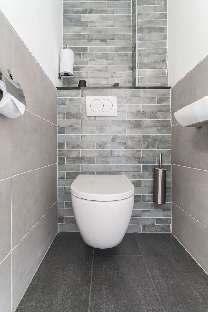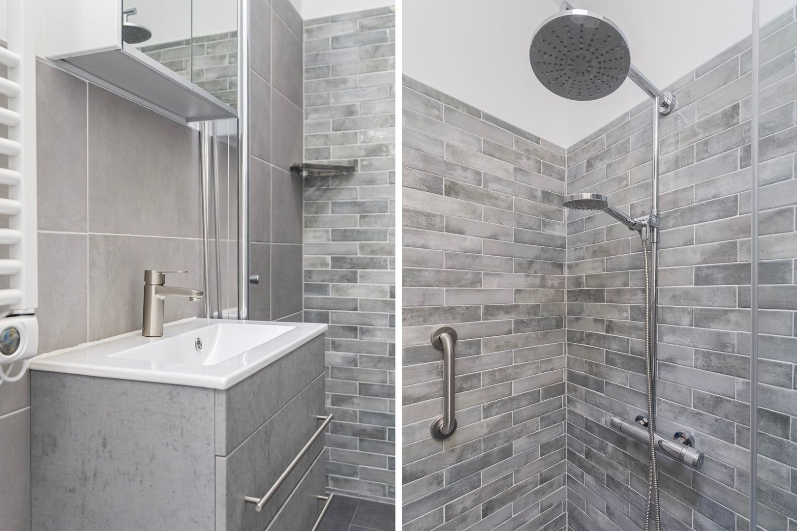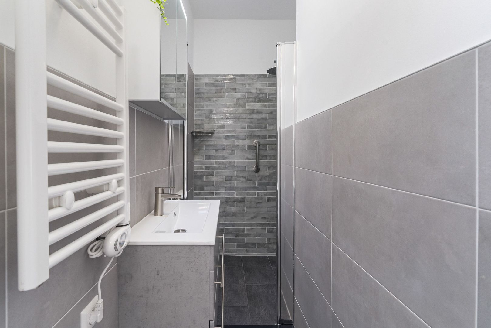 moderne badkamer inloopdouche, wastafelmeubel en handdoekradiator; separaat toilet (wandcloset) met fonteintje.