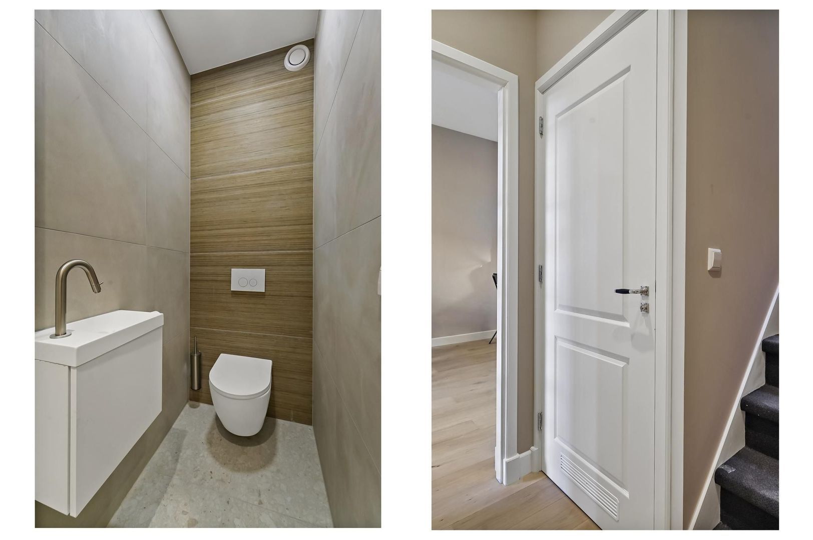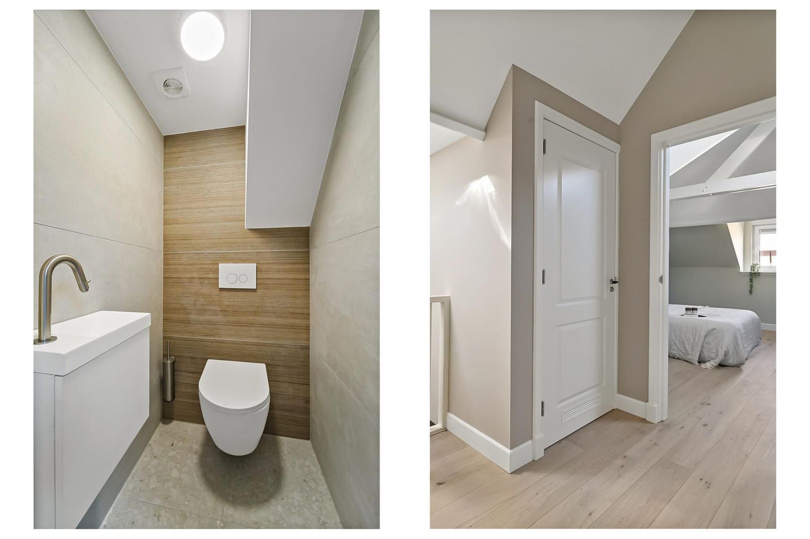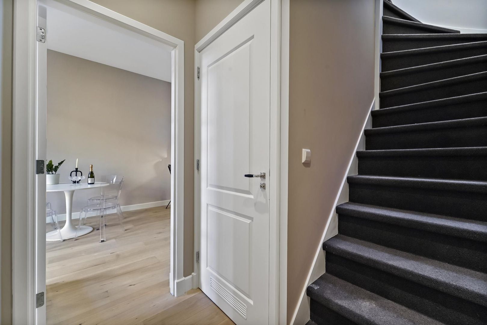 Woningentree op de begane grond met meterkast en binnentrap naar de overloop op de 1e etage; royale overloop ; modern toilet (wandcloset) met fontein; riante woonkamer ca. 4.17x9.95 met een luxe open keuken in voorzien van een natuurstenen aanrechtblad, inductiekookplaat met afzuigkap, oven, magnetron, koelkast, vriezer en vaatwasser en bovendien toegang tot het royale dakterras; 1e slaapkamer een de achterzijde ca. 5.90x1.75 met toegang tot het Terras