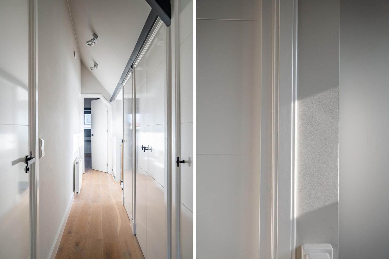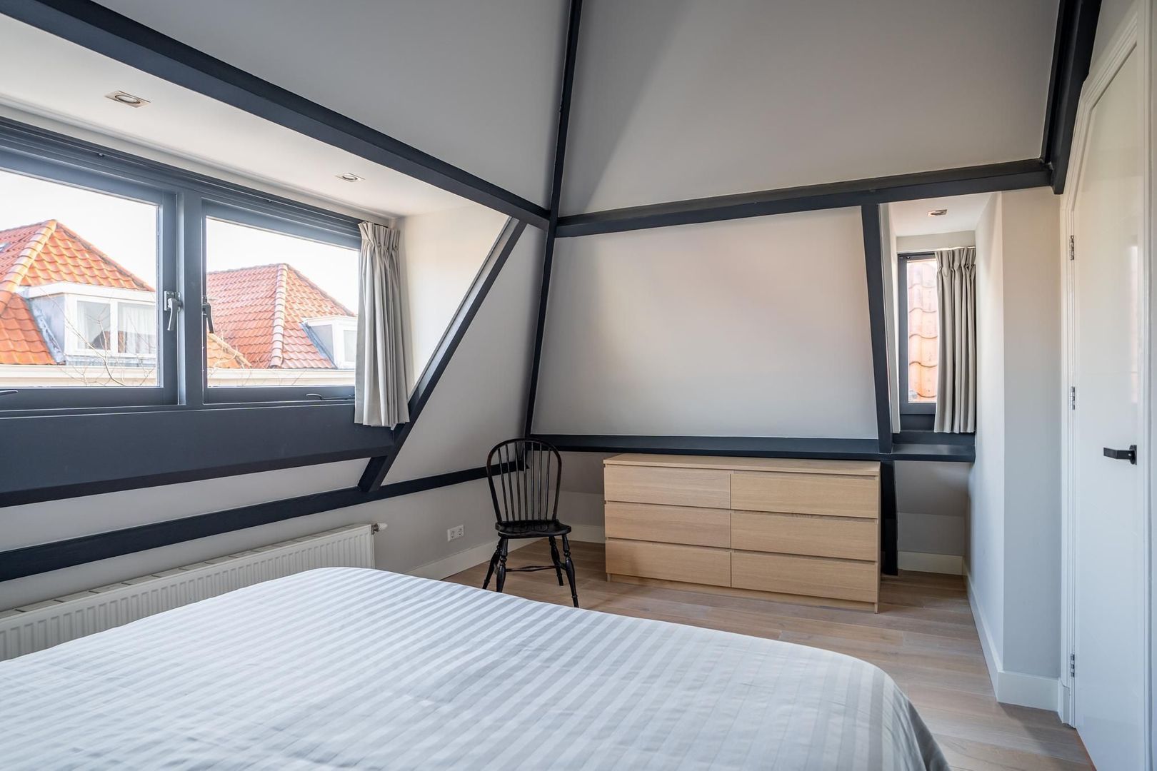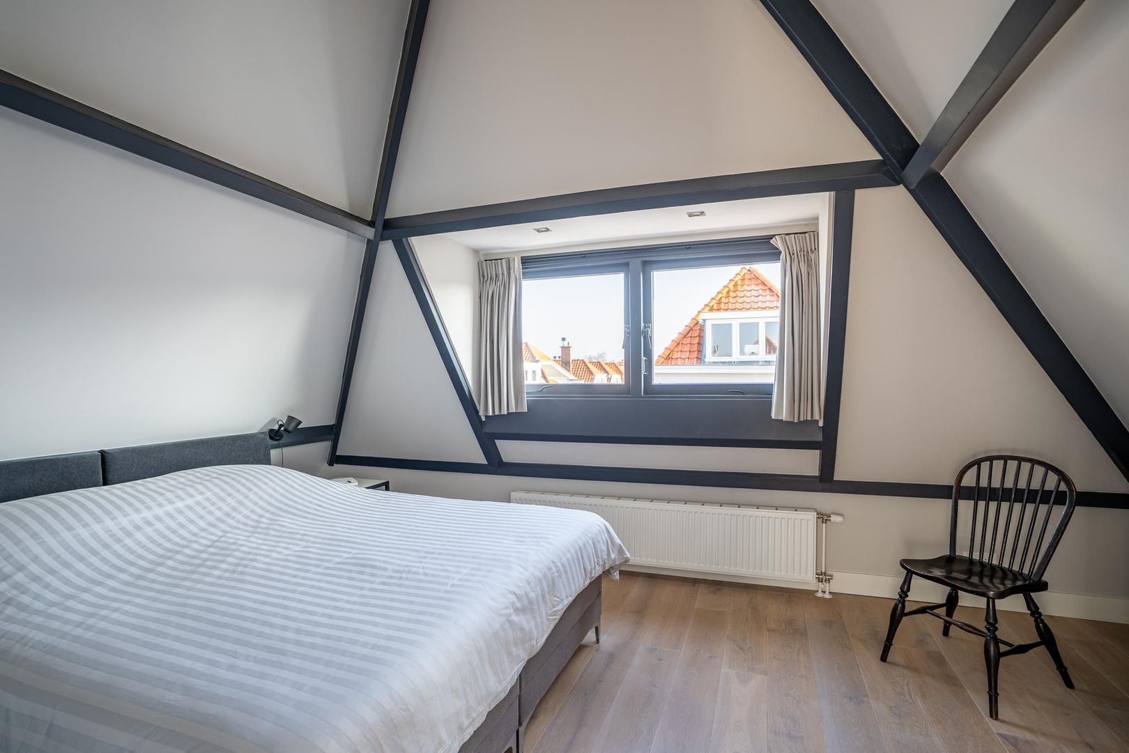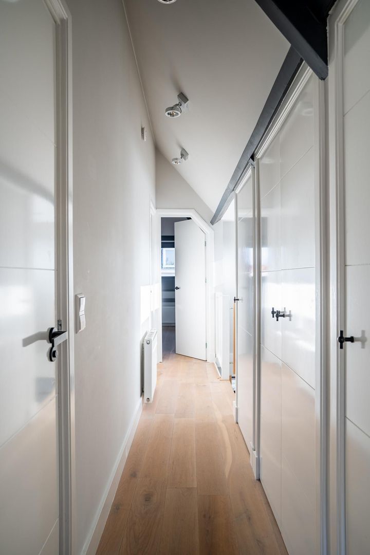Overloop met bergruimte en keurig weggewerkte wasruimte met aansluitingen voor wasmachine en droger. Sfeervolle 1e slaapkamer aan de voorzijde met dakkapel, fraai de plafondbalken in het zicht en een nokhoogte van 3.25; 2e goede slaapkamer met dakkapel; 3e goede slaapkamer aan de achterzijde met eveneens de plafondbalken in het zicht, dakraam en een fraai rond raam. Luxe badkamer met inloopdouche, 2e toilet, massiefhouten meubel met 2 waskommen en gestucte wanden. De etage is voorzien van lamelparket met eiken toplaag.