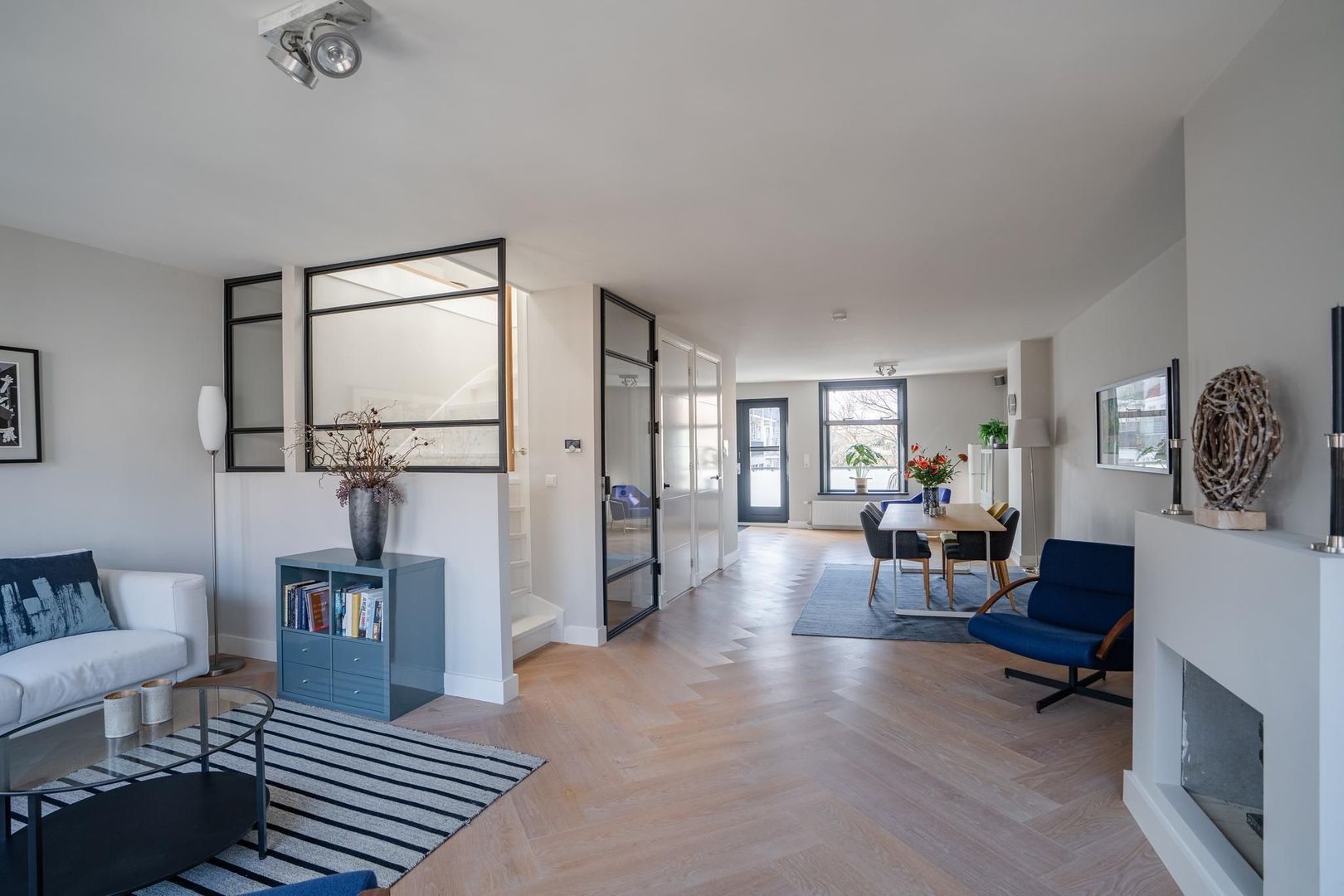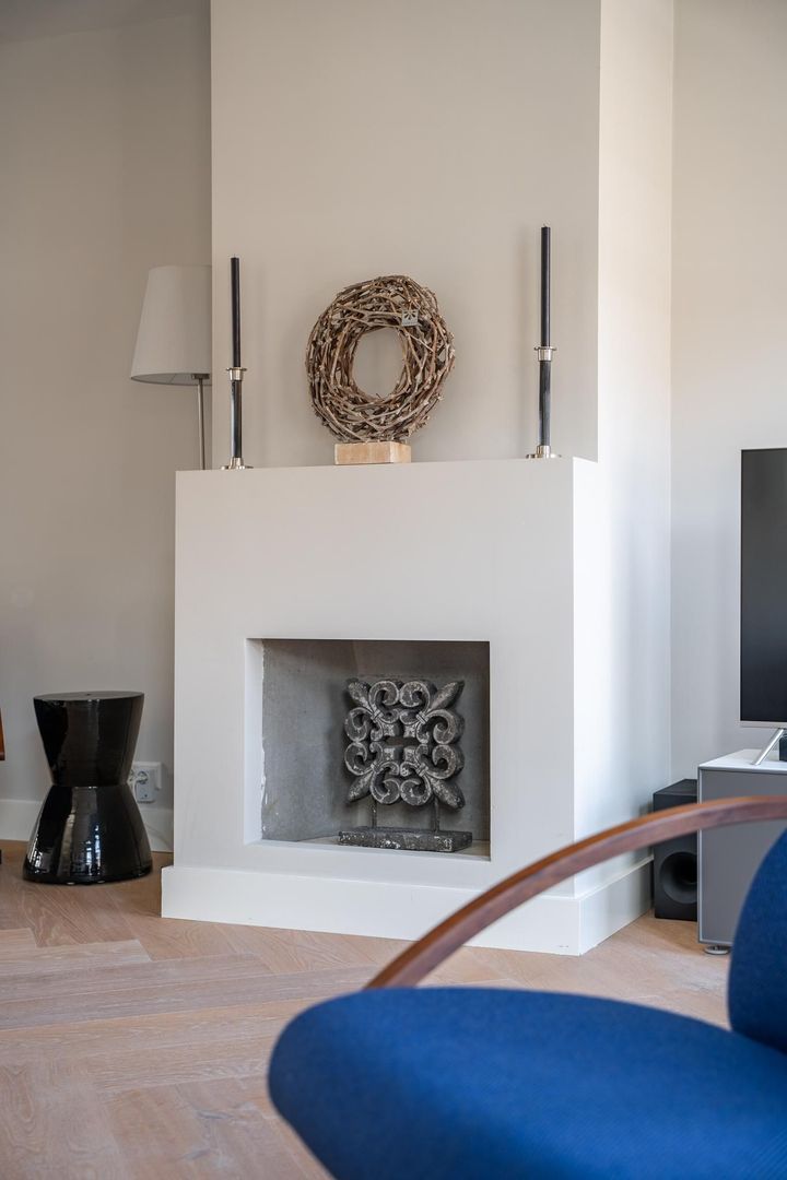 Stalen tochtdeur naar de royale en lichte woonkamer met in visgraat gelegde eiken parketvloer. Royaal zitgedeelte aan de voorzijde met sfeervolle schouw. Via het tussenliggende eetgedeelte naar de achterzijde met een fraaie open keuken met ingebouwde 5 pits gaskookplaat met in het plafond geïntegreerde afzuiging, oven, magnetron, vaatwasser, koelkast, vriezer en toegang via openslaande deuren naar het perfect op de zon liggende balkon en met goed vrij uitzicht over de tuinen van de achterliggende woningen. Fraai toilet met fonteintje. Berg-/voorraadkast met eveneens de opstelplaats voor de cv ketel. Trap naar de 3e etage.