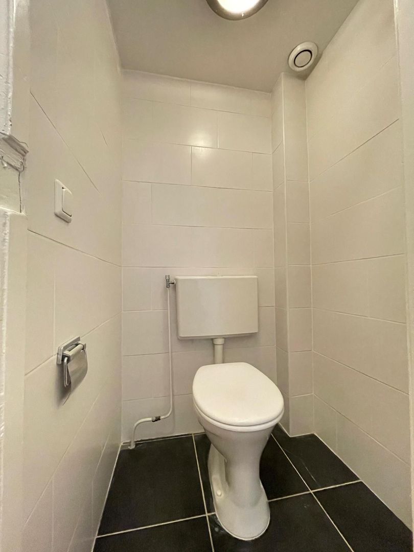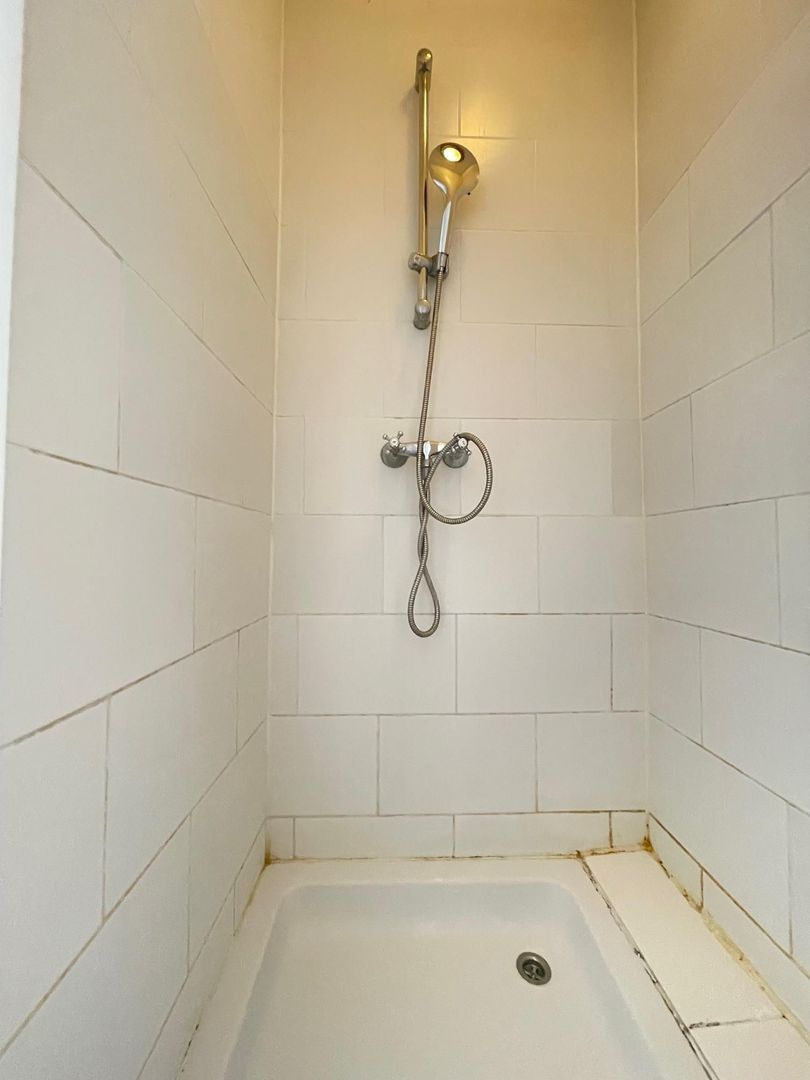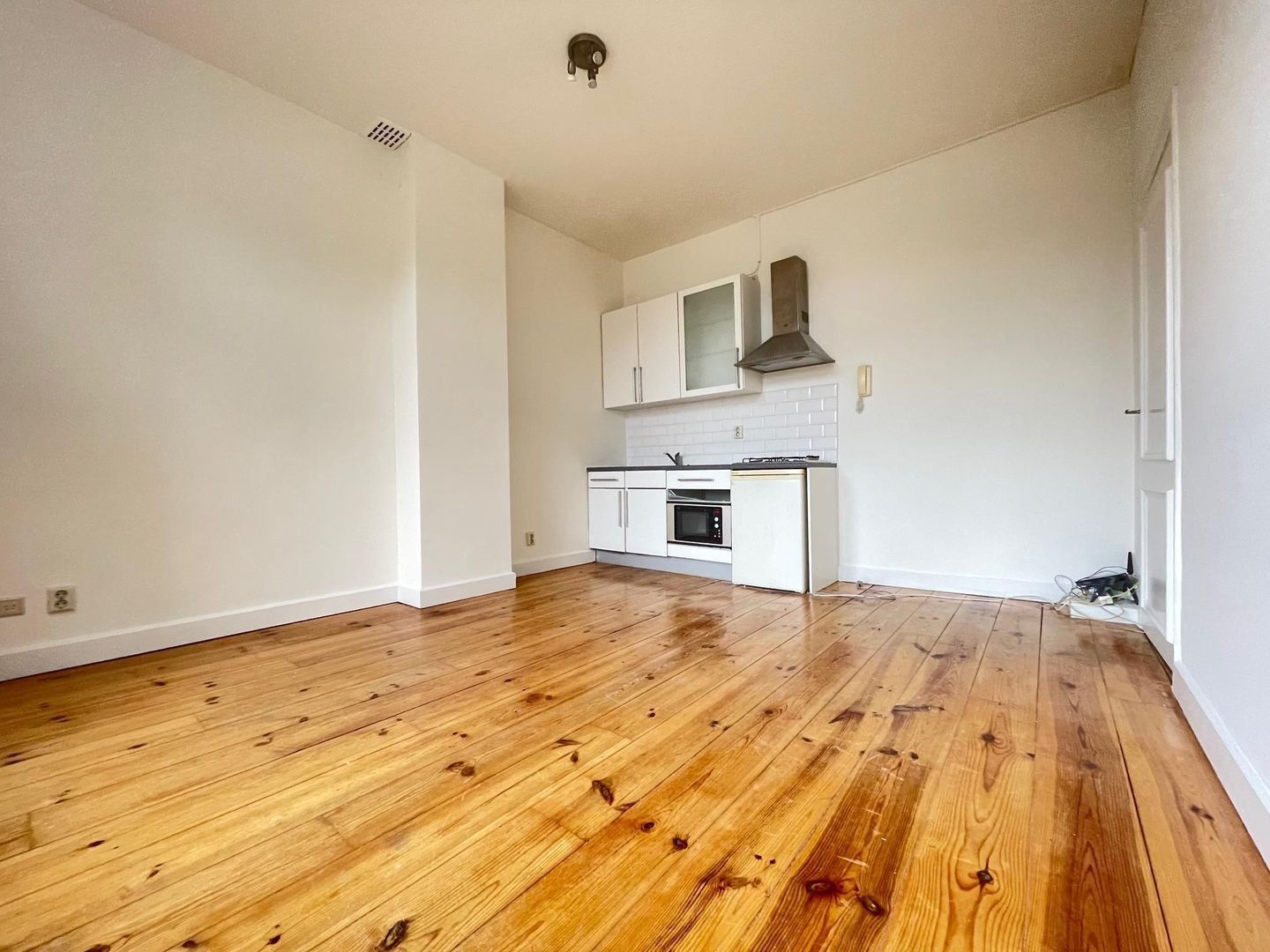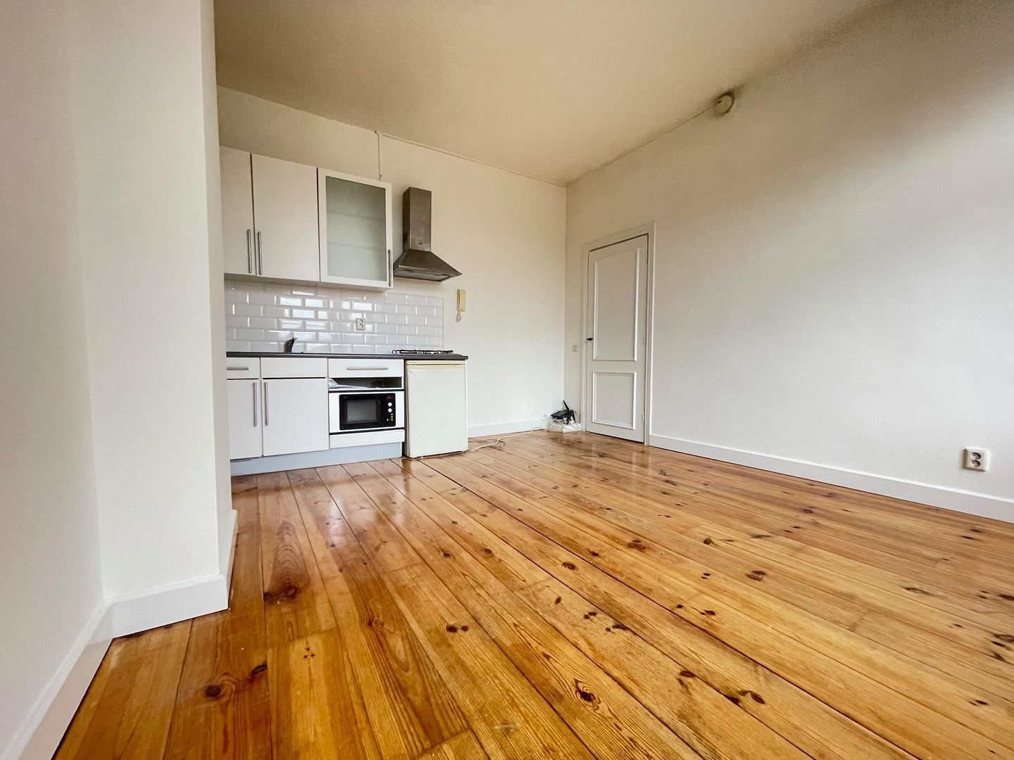 Gedeelde entree op straatniveau en trap naar dd tweede verdieping alwaar entree van het appartement. Halletje met toegang toilet; Lichte woonkamer met grote raampartij en met een eenvoudige open keuken met ingebouwde apparatuur zoals kookplaat, afzuigkap, losse onderbouw koelkast, oven; via de woonkamer toegang tot het terras op het Oosten (ochtend begin middag zon); via gang toegang tot de achterzijkamer waar ook de deur zit naar de douche.