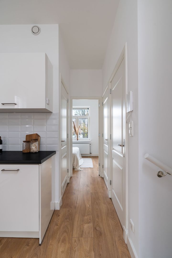 Entree via gesloten portiek; trap naar woning op de eerste verdieping; vaste kast met cv opstelling; ruime diepe woonkamer met grote raampartijen; open moderne keuken met inbouwappratuur, koelkast, oven- magnetroncombi, inductieplaat en afzuigkap; slaapkamer gelegen aan de achterzijde; moderne badkamer met inloopdouche, wastafelmeubel en handdoekradiator; separaat toilet met fonteintje; trap in de woonkamer naar dakterras.