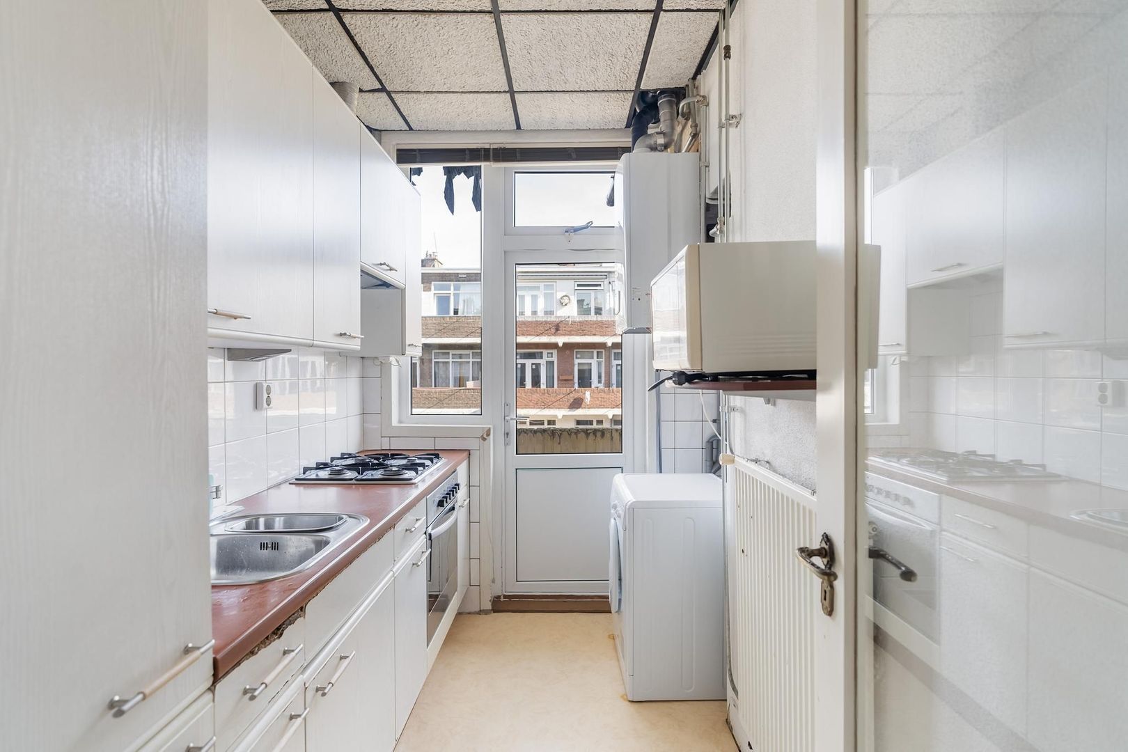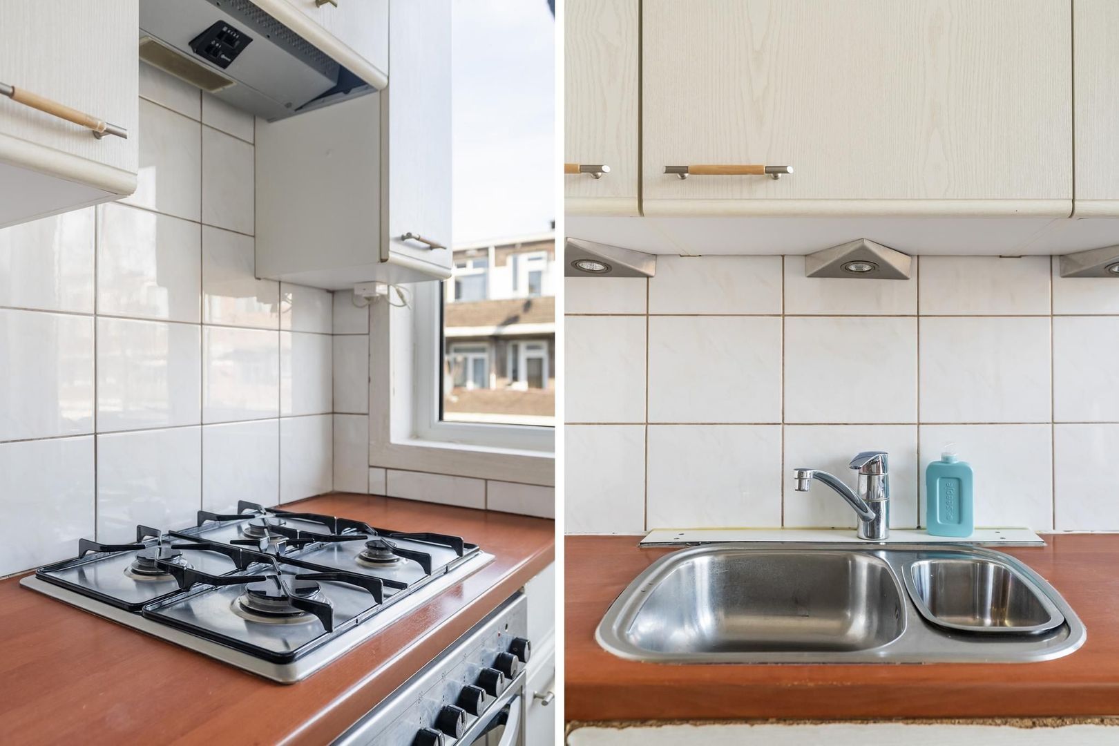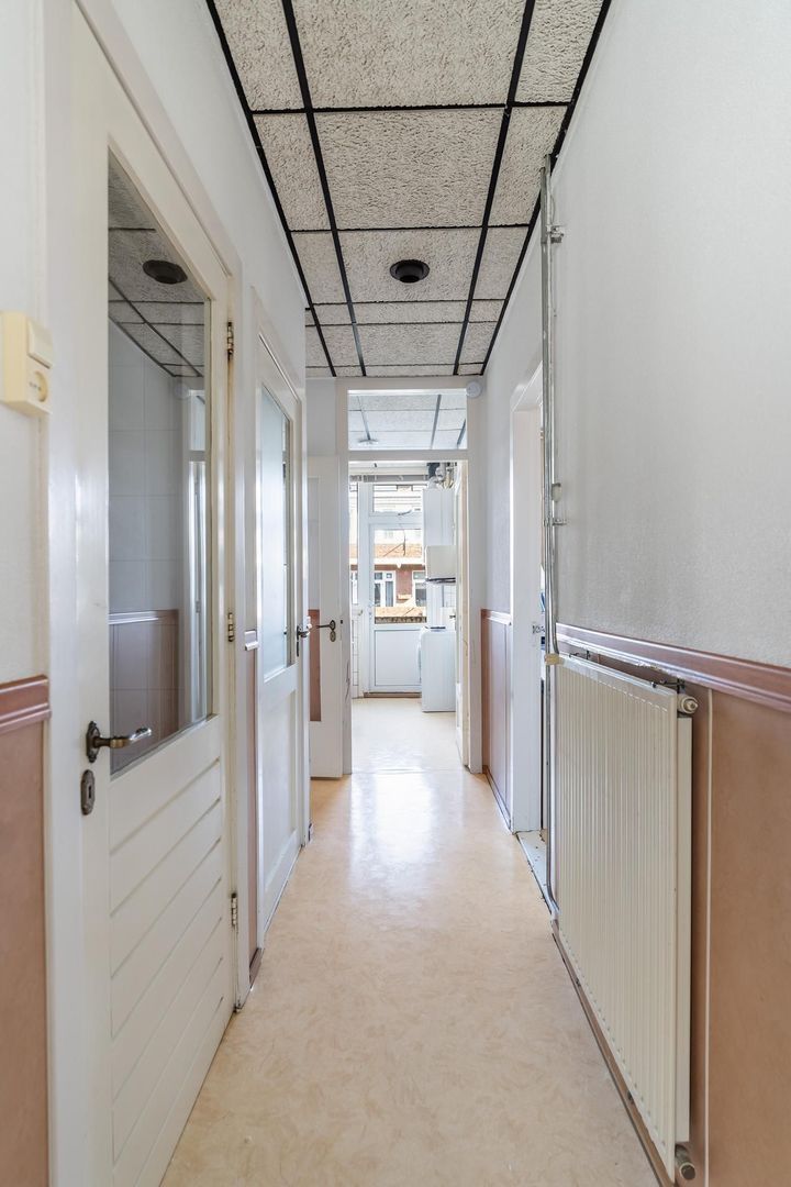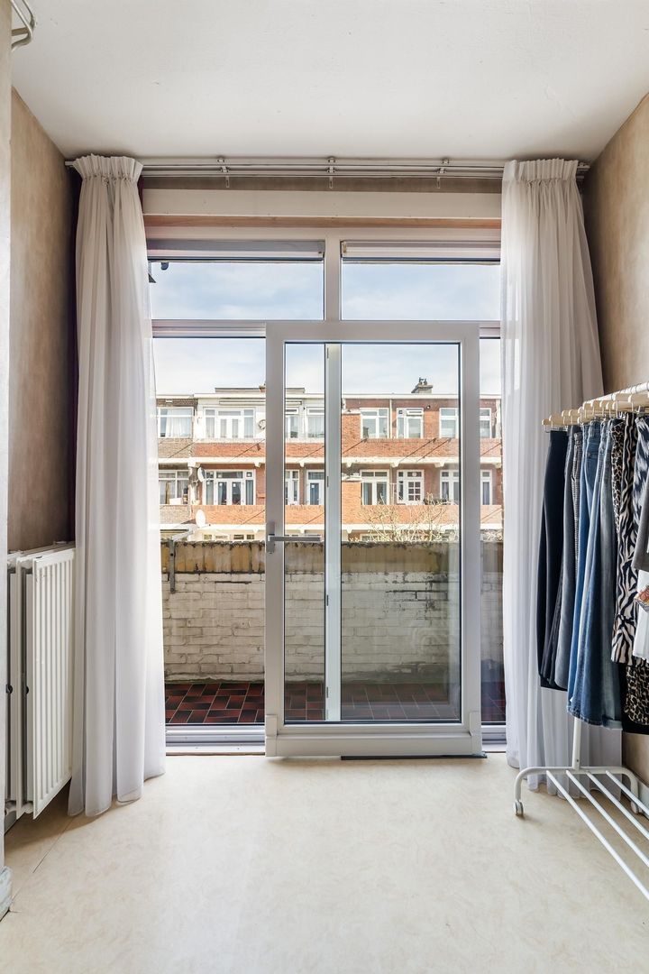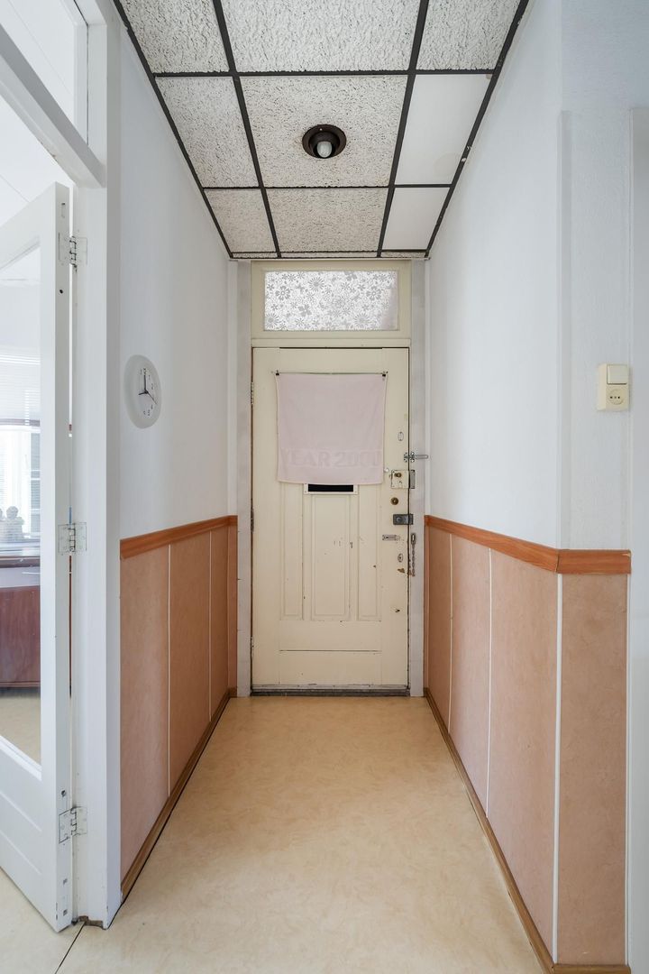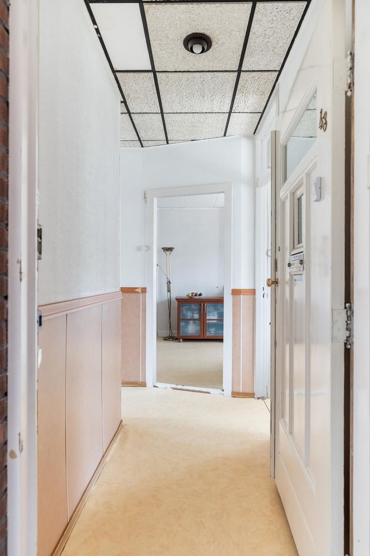 Woningentree via open portiek op 1e etage; gang met de meterkast; ruime woonkamer met een sfeervolle erker en een bijgetrokken voorzijkamer; eenvoudige keuken met een gaskookplaat, afzuigkap, oven, koel-vriescombinatie, wasmachine aansluiting en toegang tot het balkon; 1e royale slaapkamer aan de achterzijde met schuifpui naar het balkon; 2e slaapkamer aan de achterzijde met openslaande deuren naar het balkon; eenvoudige witte doucheruimte; separaat toilet met fonteintje;