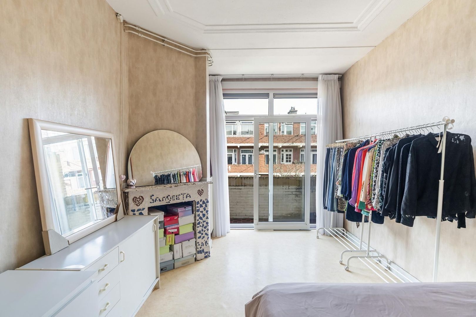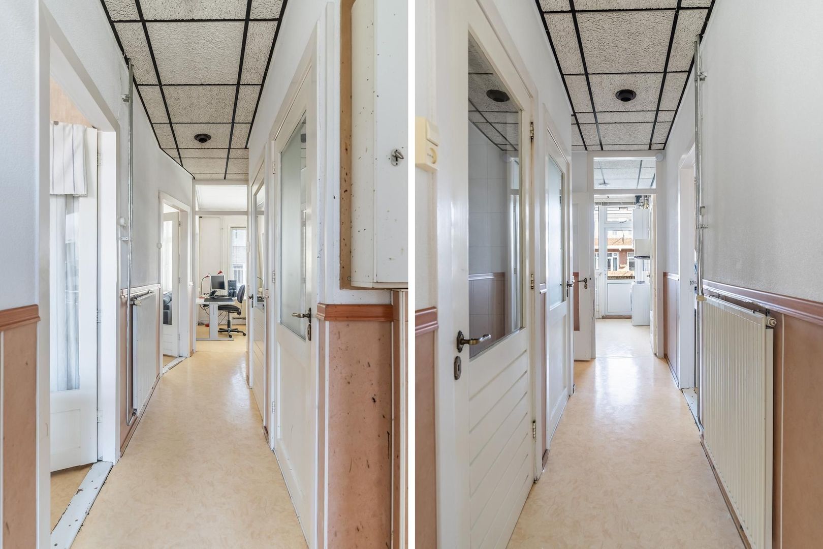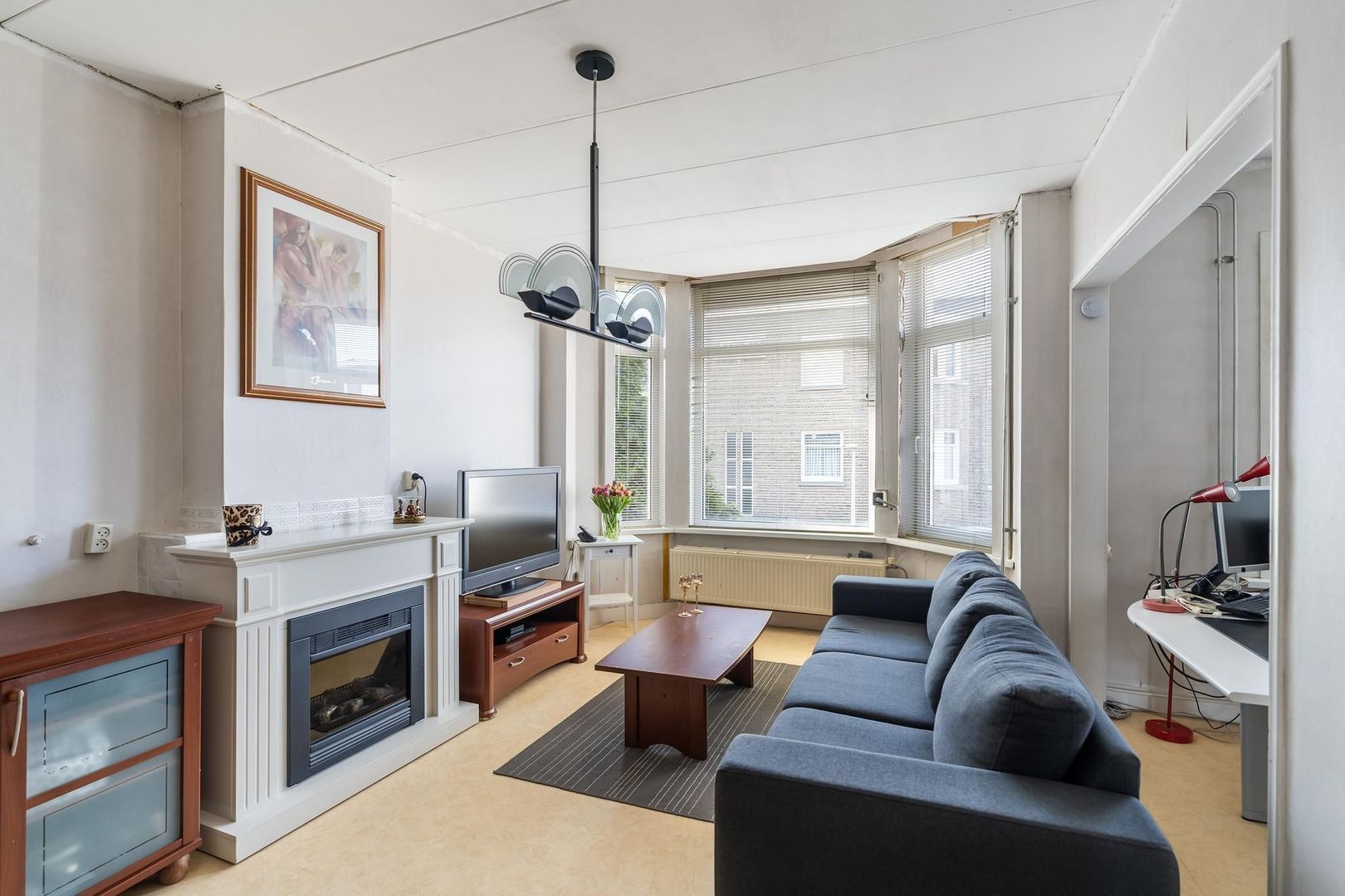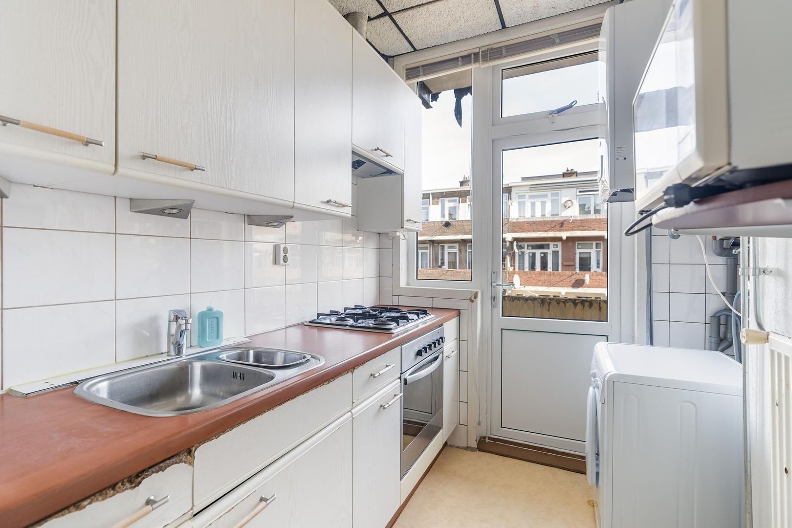 Woningentree via open portiek op 1e etage; gang met de meterkast; ruime woonkamer met een sfeervolle erker en een bijgetrokken voorzijkamer; eenvoudige keuken met een gaskookplaat, afzuigkap, oven, koel-vriescombinatie, wasmachine aansluiting en toegang tot het balkon; 1e royale slaapkamer aan de achterzijde met schuifpui naar het balkon; 2e slaapkamer aan de achterzijde met openslaande deuren naar het balkon; eenvoudige witte doucheruimte; separaat toilet met fonteintje;