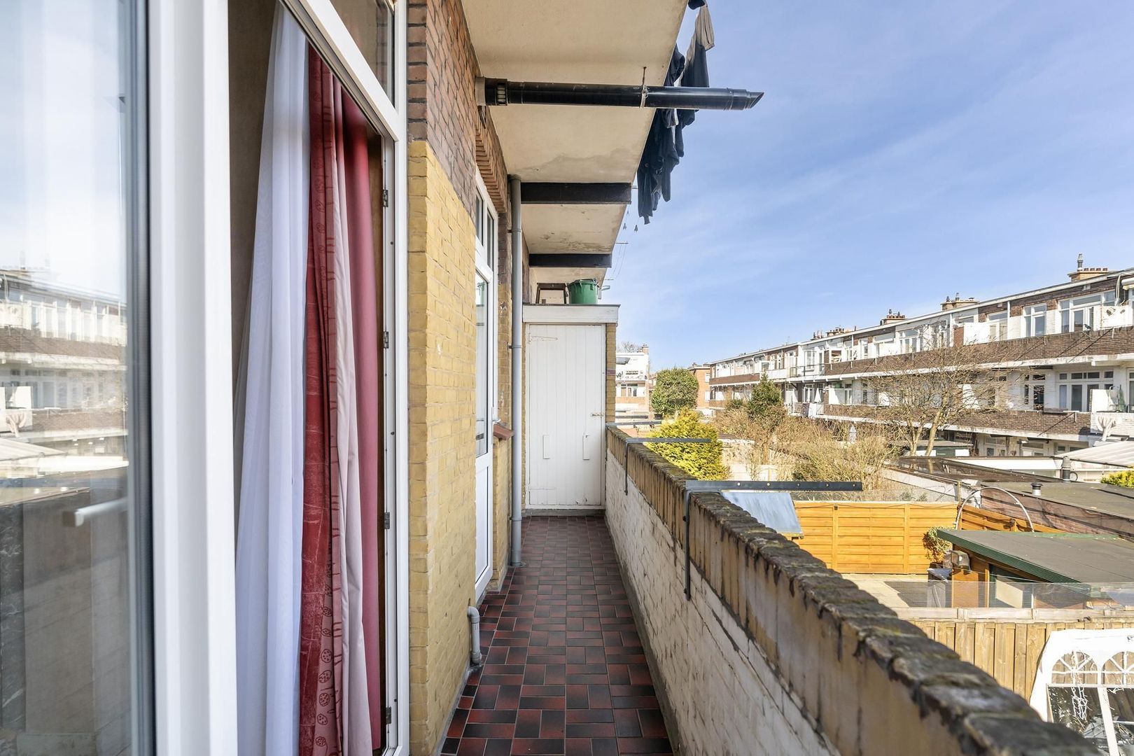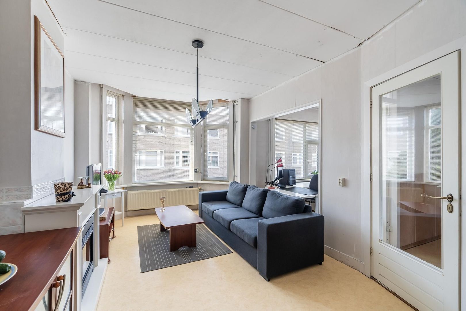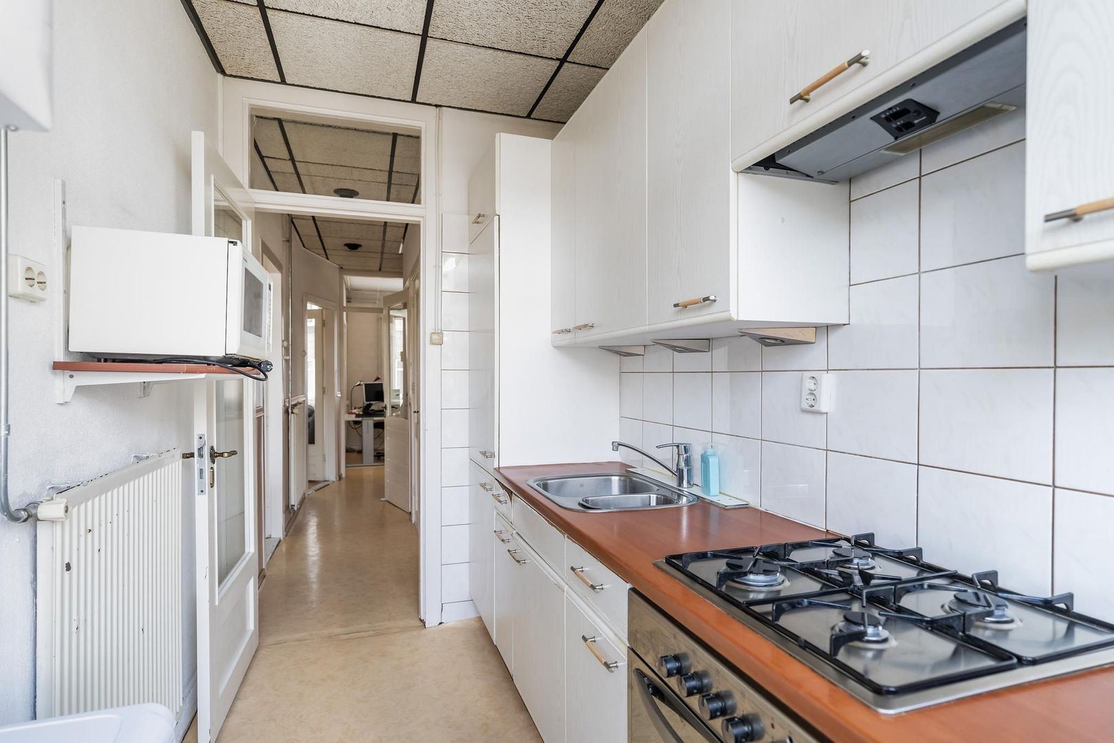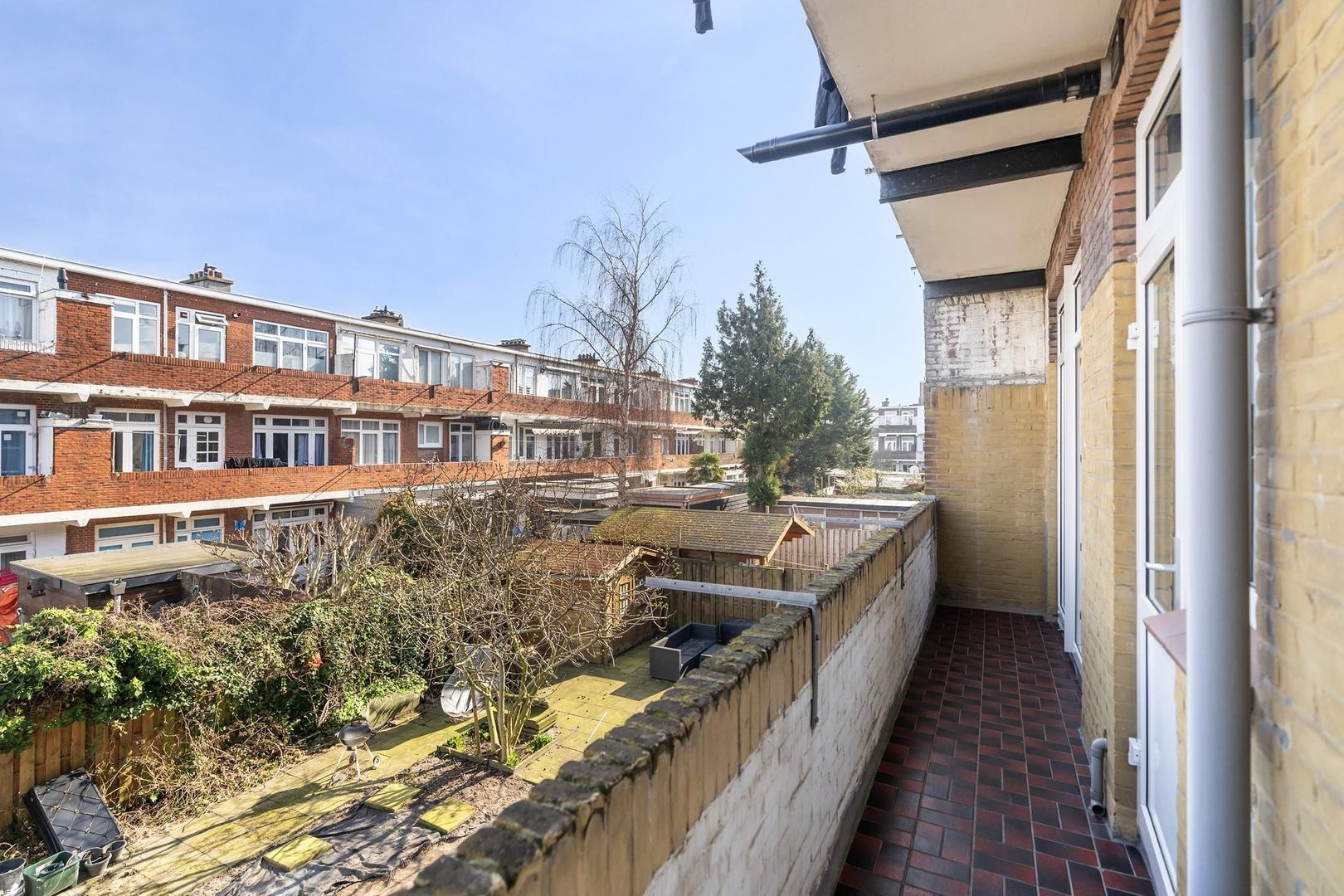 Woningentree via open portiek op 1e etage; gang met de meterkast; ruime woonkamer met een sfeervolle erker en een bijgetrokken voorzijkamer; eenvoudige keuken met een gaskookplaat, afzuigkap, oven, koel-vriescombinatie, wasmachine aansluiting en toegang tot het balkon; 1e royale slaapkamer aan de achterzijde met schuifpui naar het balkon; 2e slaapkamer aan de achterzijde met openslaande deuren naar het balkon; eenvoudige witte doucheruimte; separaat toilet met fonteintje;