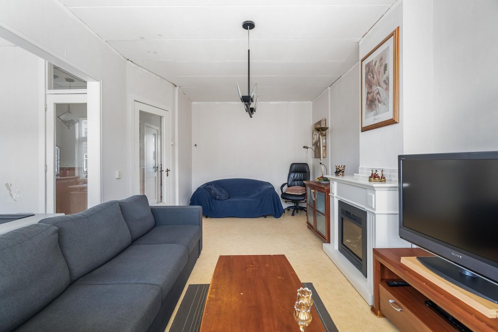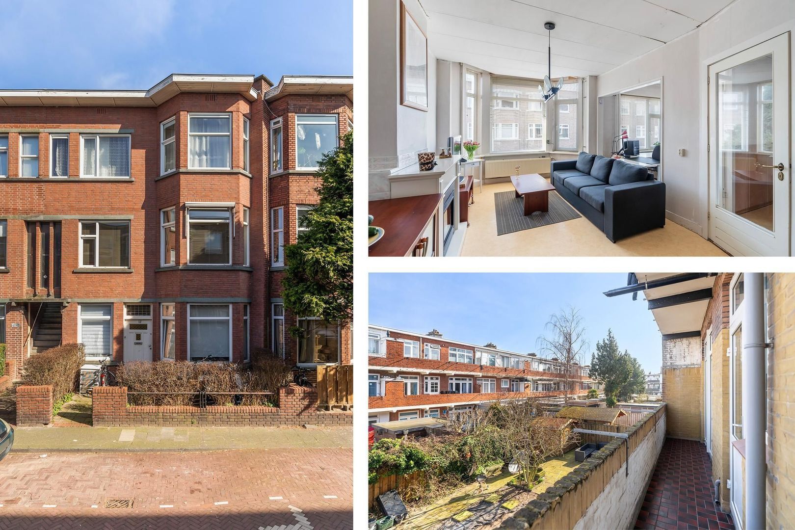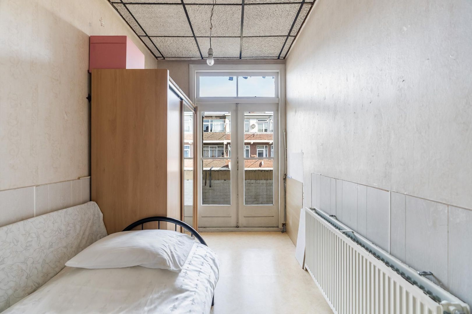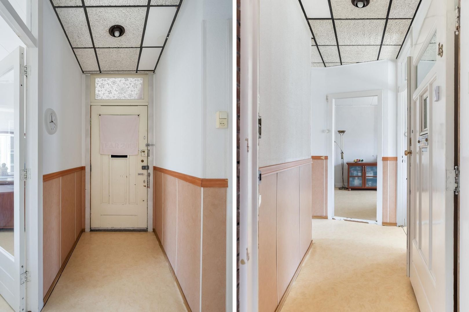 Woningentree via open portiek op 1e etage; gang met de meterkast; ruime woonkamer met een sfeervolle erker en een bijgetrokken voorzijkamer; eenvoudige keuken met een gaskookplaat, afzuigkap, oven, koel-vriescombinatie, wasmachine aansluiting en toegang tot het balkon; 1e royale slaapkamer aan de achterzijde met schuifpui naar het balkon; 2e slaapkamer aan de achterzijde met openslaande deuren naar het balkon; eenvoudige witte doucheruimte; separaat toilet met fonteintje;