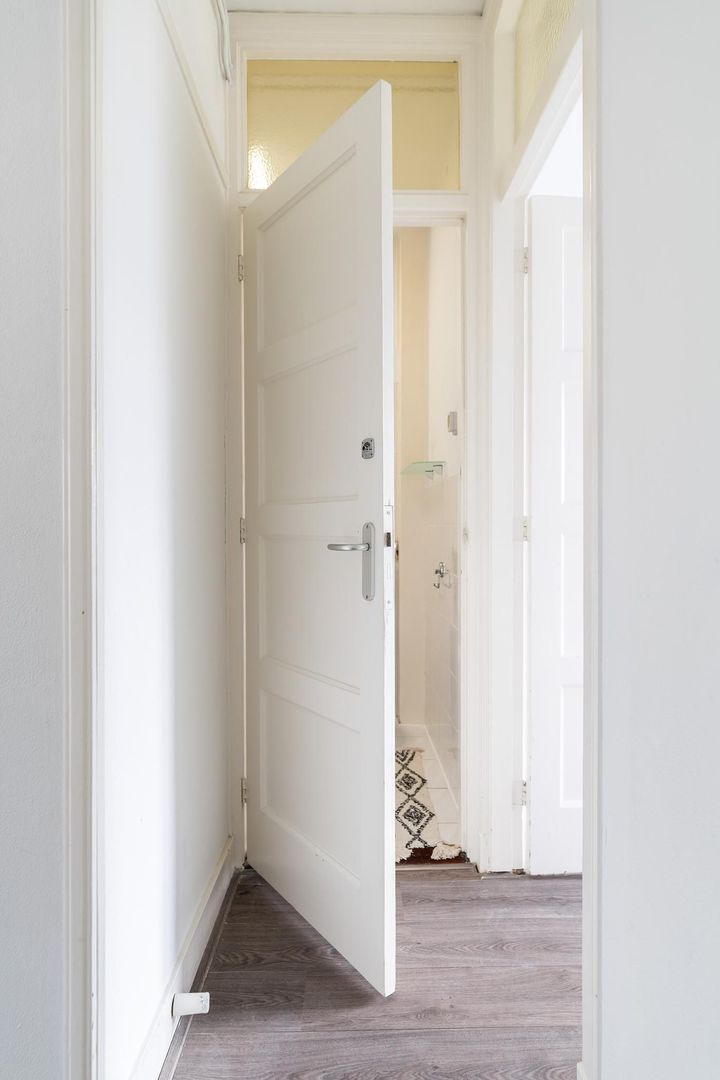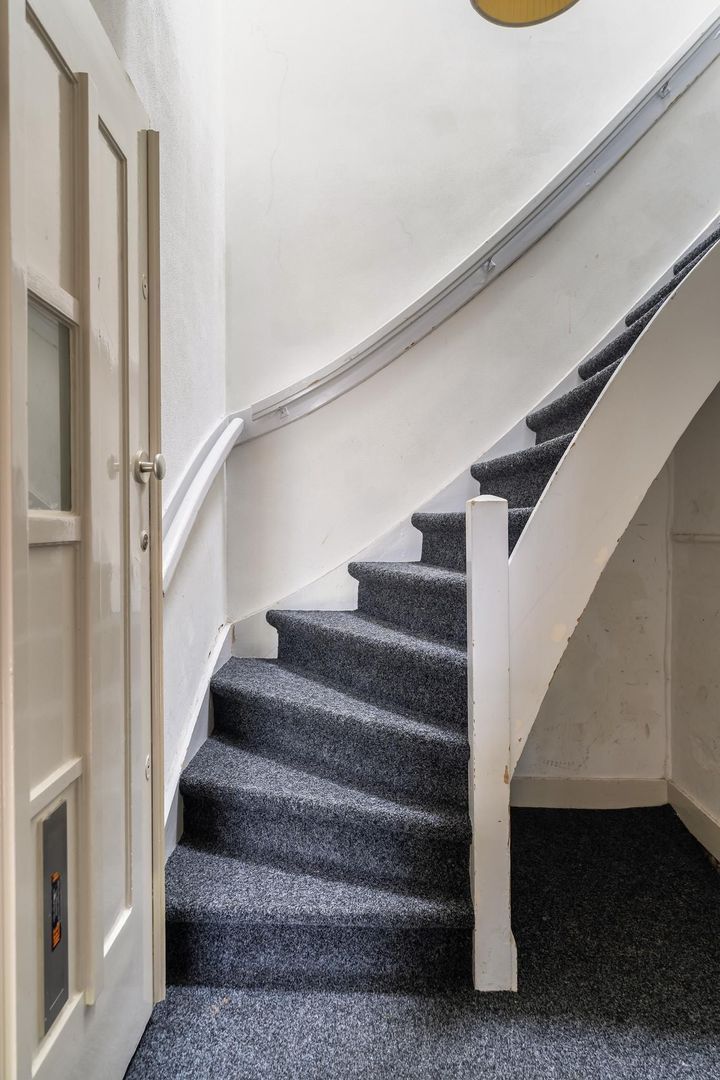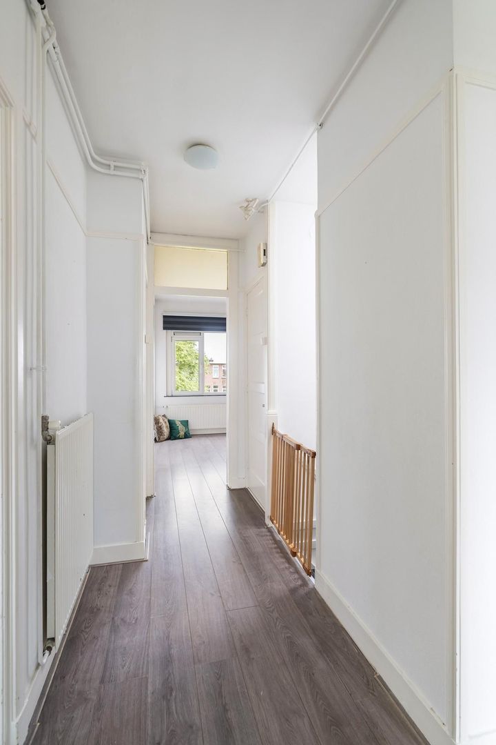 Woningentree via open portiek; hal met meterkast en binnentrap naar de 2e etage; overloop met een vaste kast; woonkamer en suite met erker, een glas in lood schuifseparatie, stenen schouwen, vaste kasten en schuifpui naar het balkon, nette keuken voorzien van een gaskookplaat, afzuigkap, vaatwasser, oven, koel-vriescombinatie en toegang tot het balkon; grote 1e slaapkamer aan de voorzijde met vaste kast; 2e slaapkamer aan de achterzijde; degelijke badkamer met douche, wastafelmeubel en toilet;