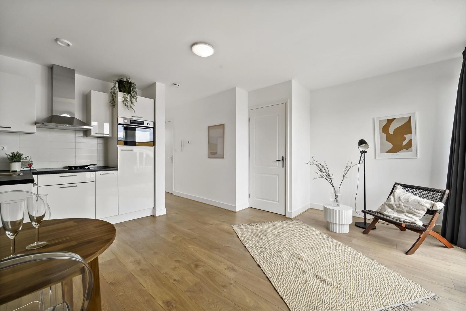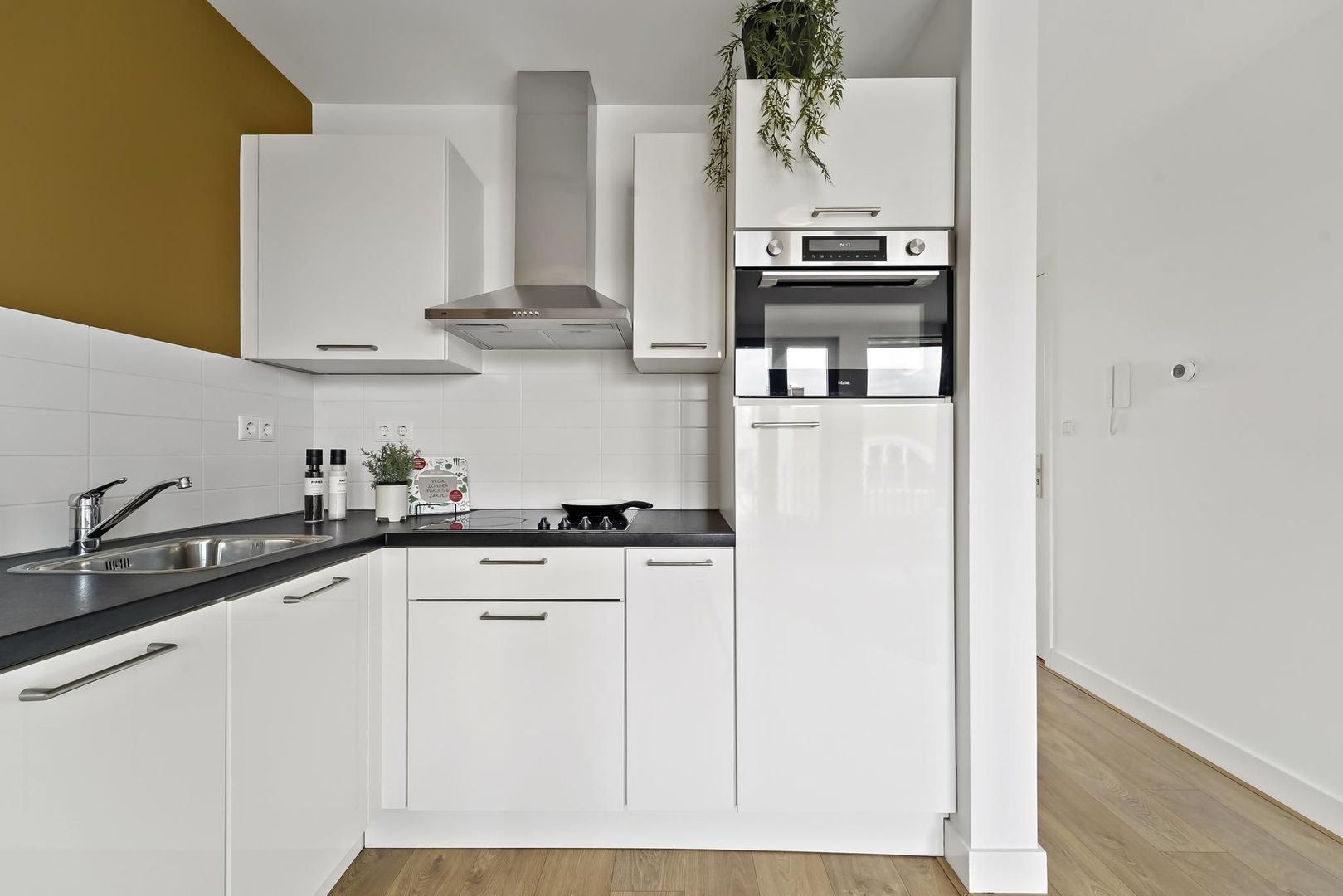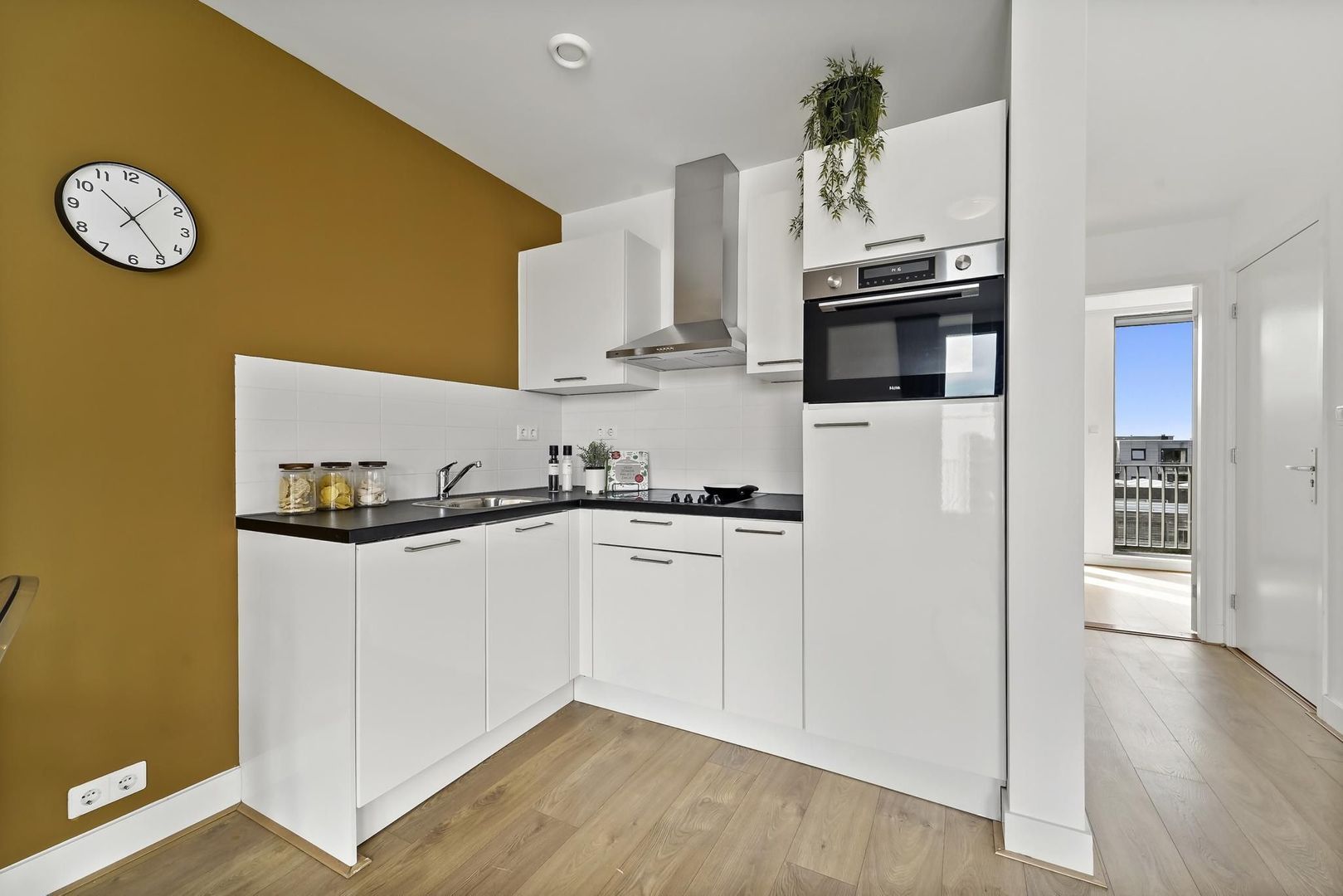 Entree appartement; hal; berging met opstelplaats wasmachine/droger en cv-ketel; woon-/eetkamer ca. 6.05x4.23 met luxe open keuken voorzien van een inductiekookplaat, afzuigkap, combi-oven, koelkast, vriezer en vaatwasser ; slaapkamer ca.2.95x4.40 met toegang tot het dakterrasbalkon, luxe badkamer ca. 2.60x1.77 voorzien van inloopdouche, toilet en wastafelmeubel.