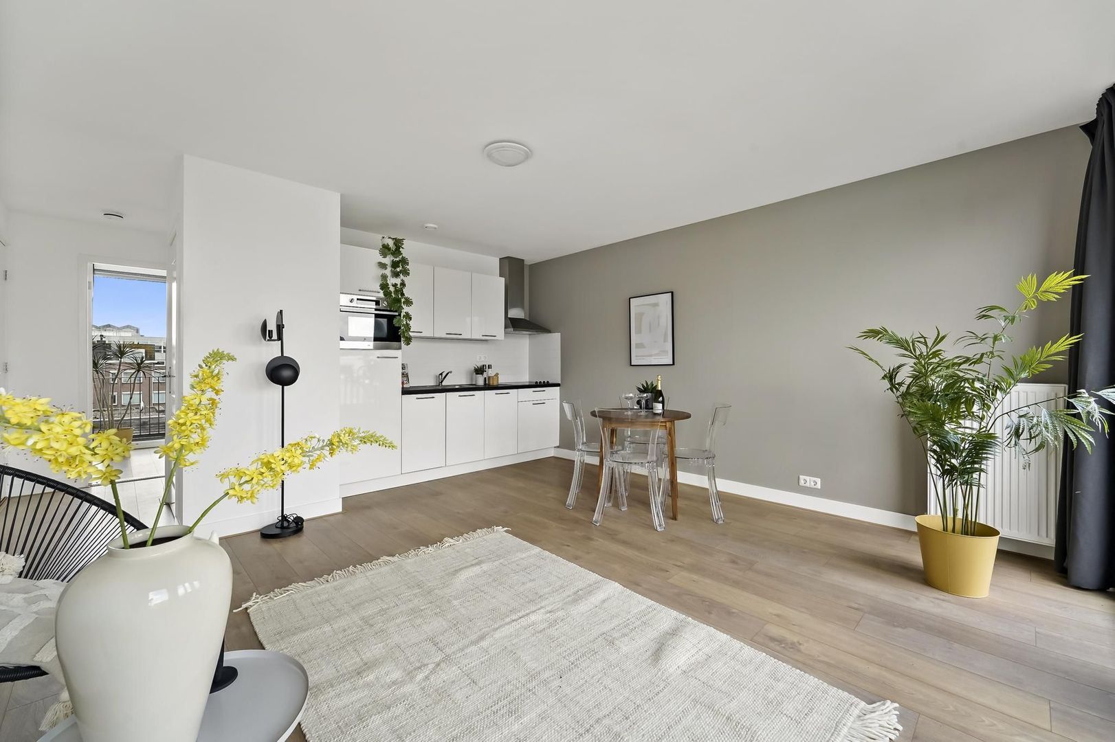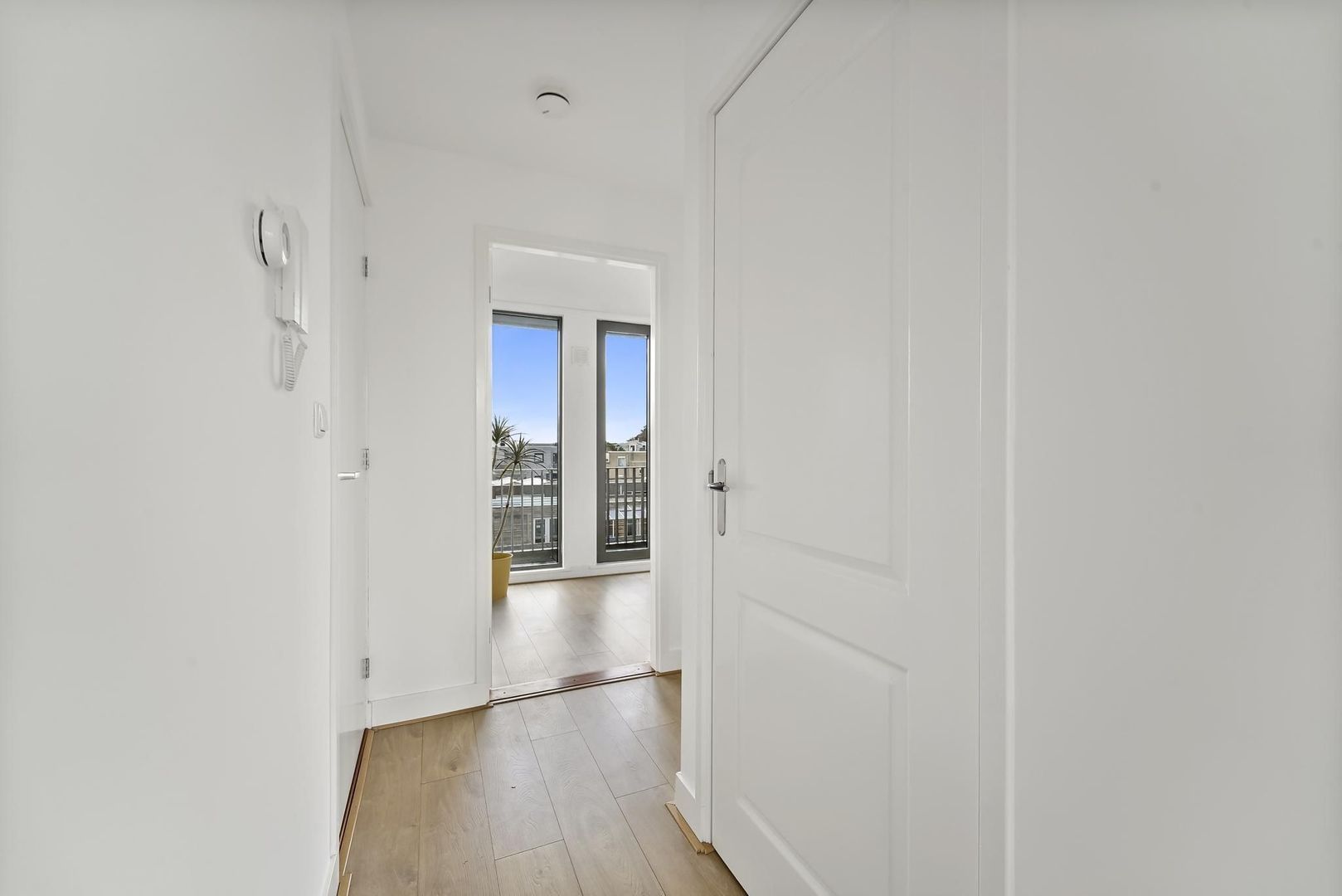Entree appartement; hal; berging met opstelplaats wasmachine/droger en cv-ketel; woon-/eetkamer ca. 6.05x4.23 met luxe open keuken voorzien van een inductiekookplaat, afzuigkap, combi-oven, koelkast, vriezer en vaatwasser ; slaapkamer ca.2.95x4.40 met toegang tot het dakterrasbalkon, luxe badkamer ca. 2.60x1.77 voorzien van inloopdouche, toilet en wastafelmeubel.