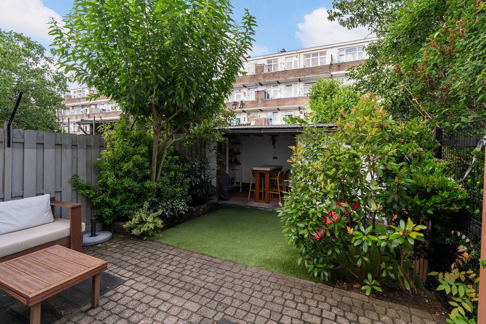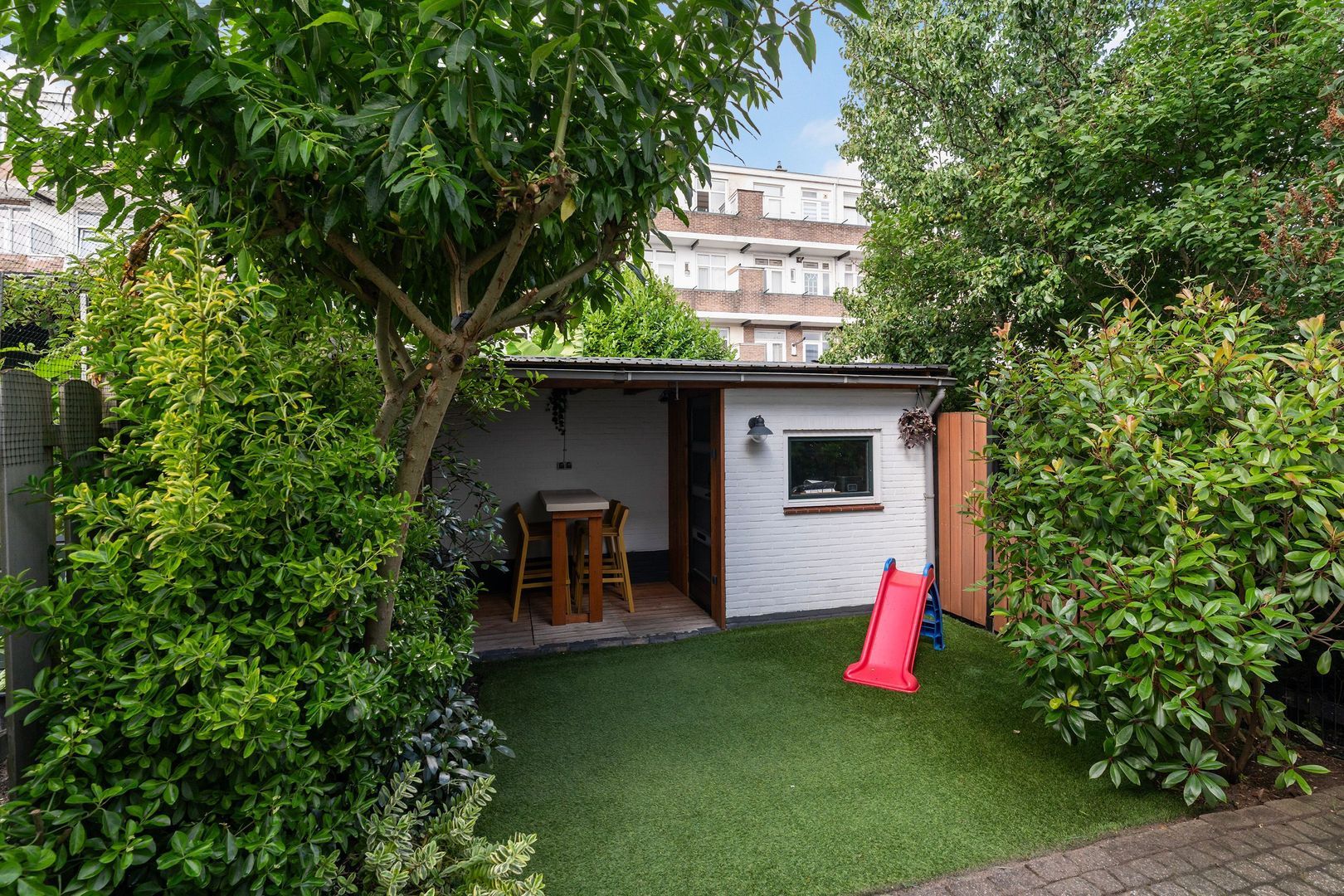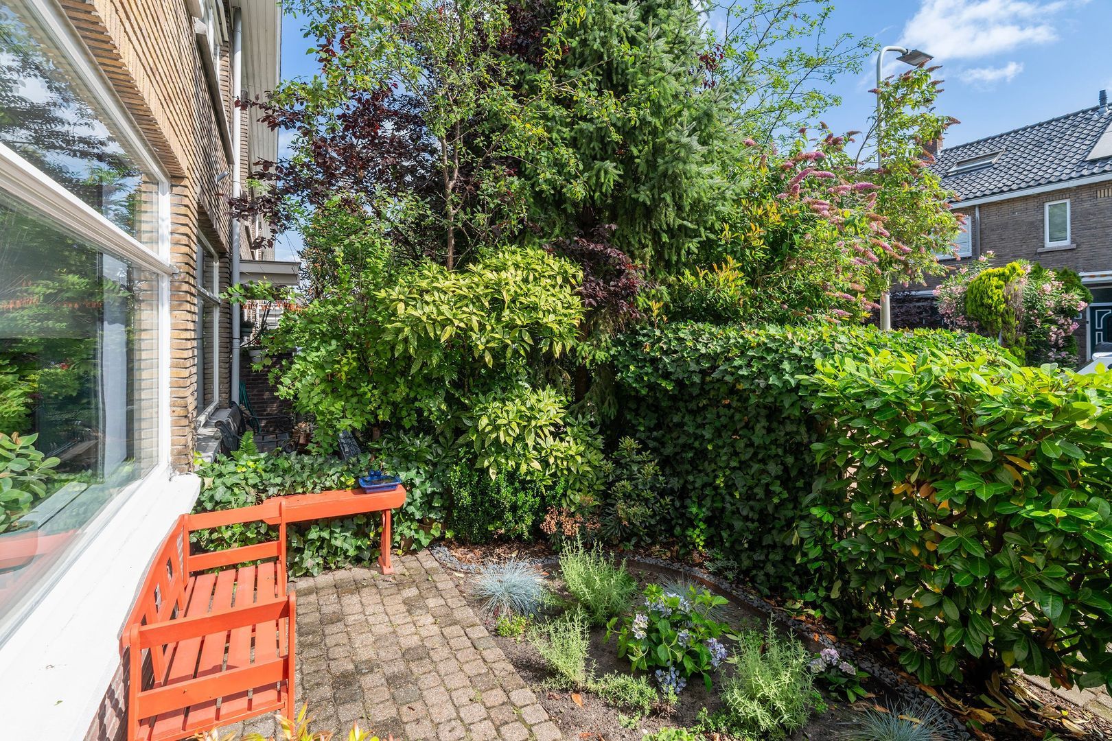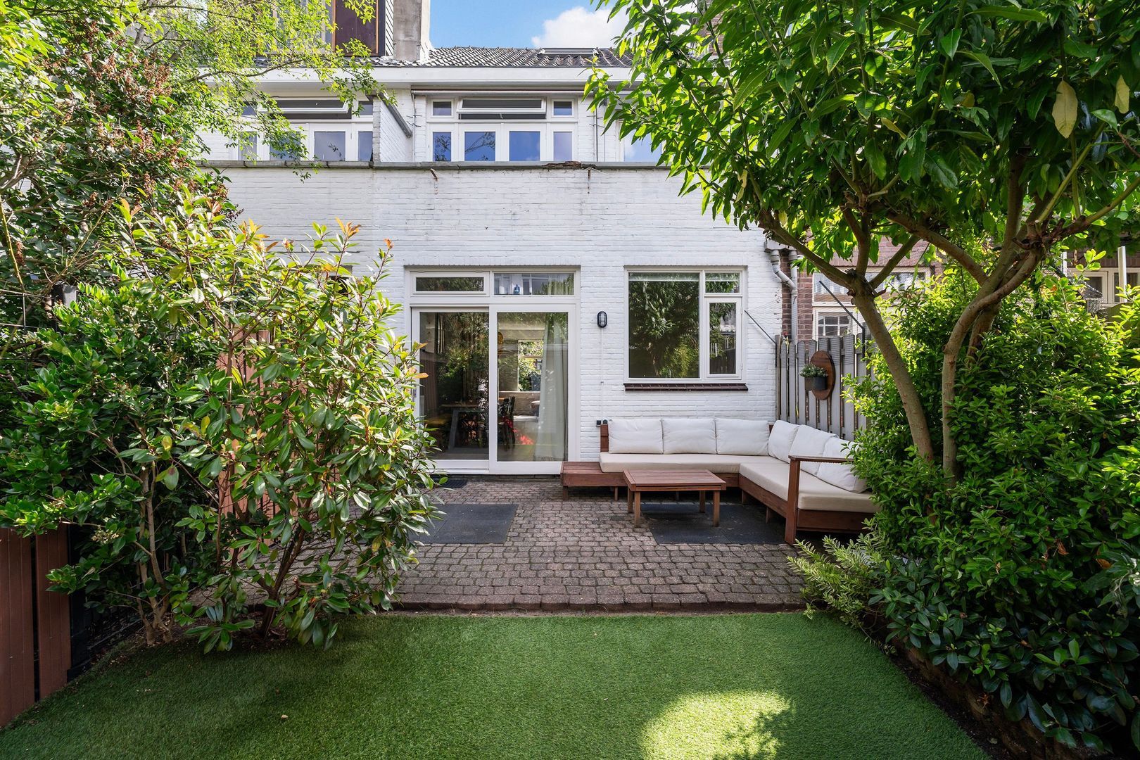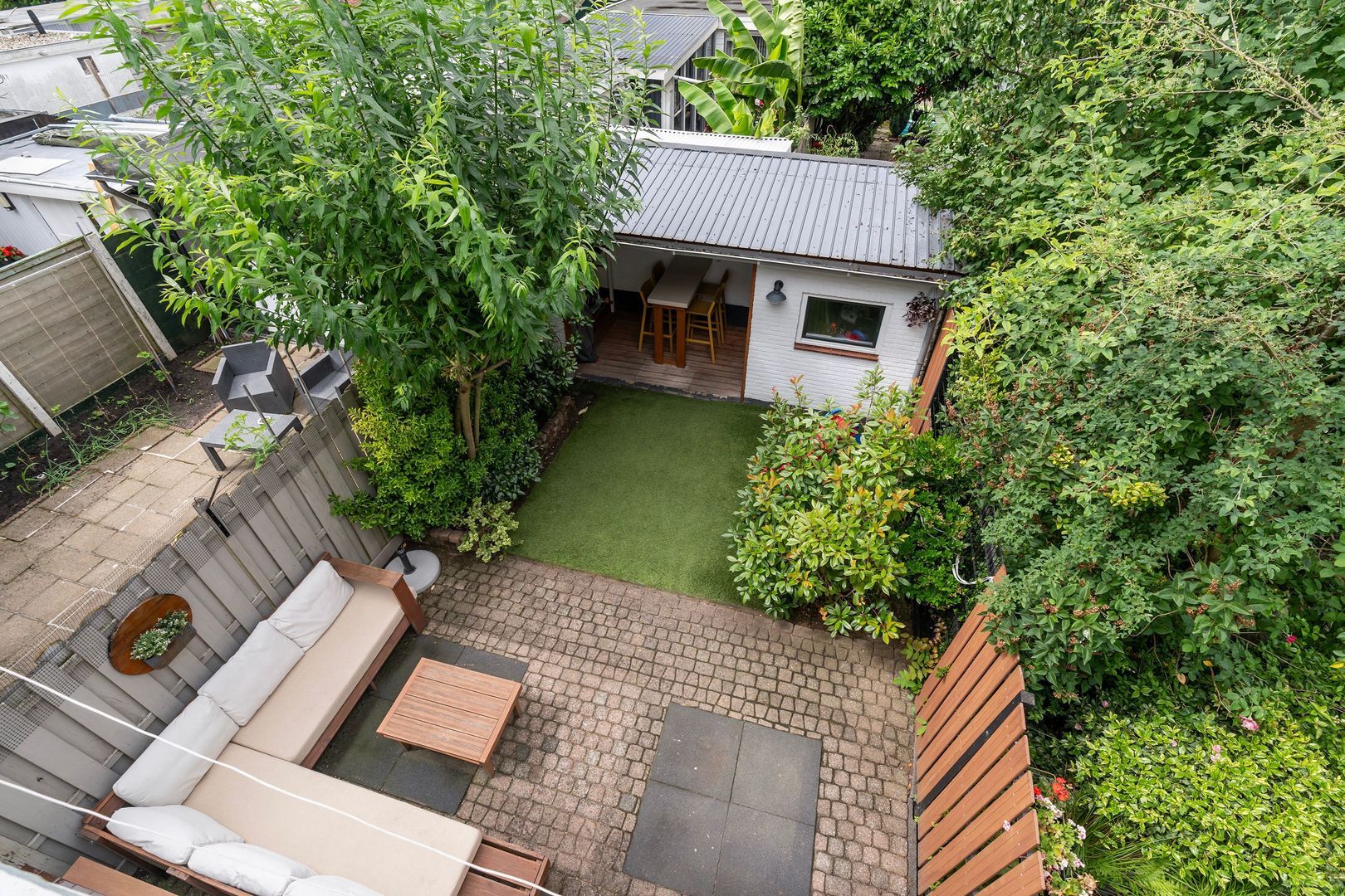 - Voor- en achtertuin, achtertuin met overkapping en externe berging