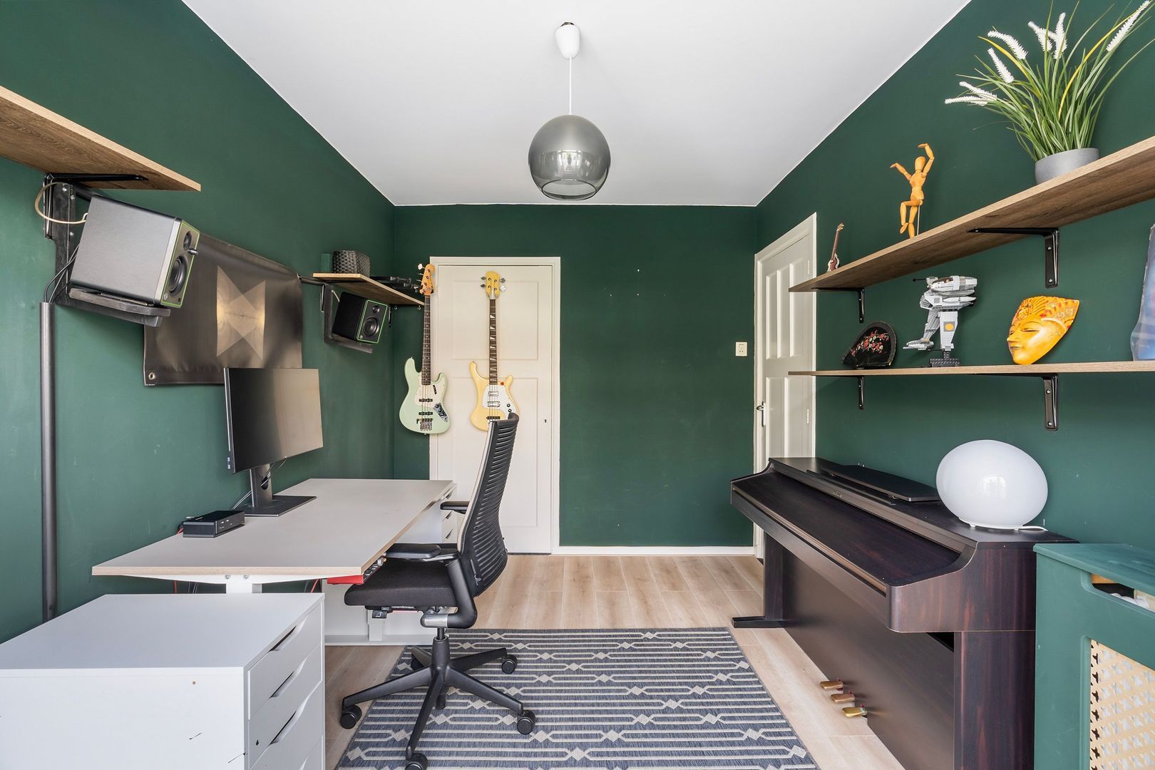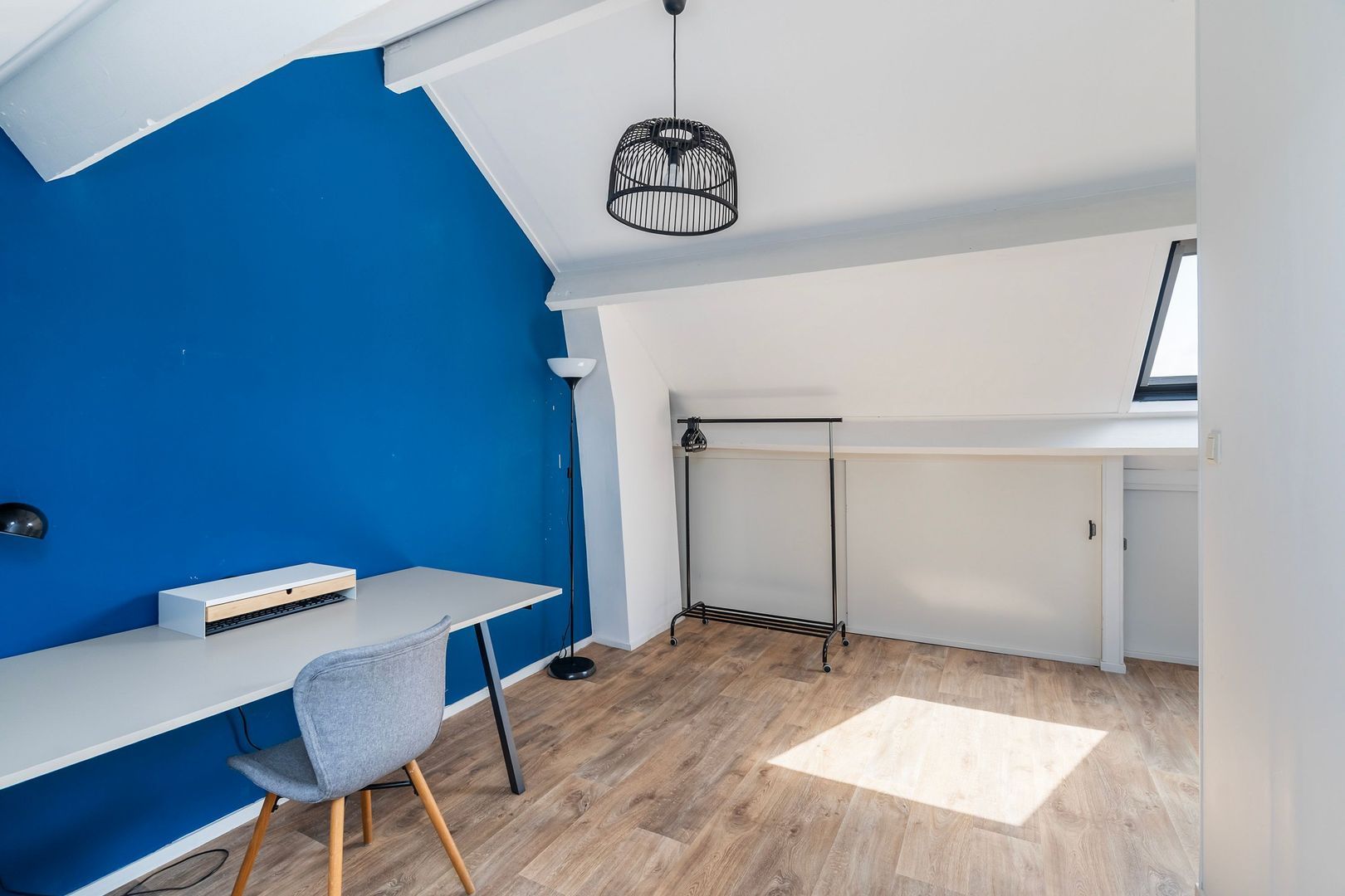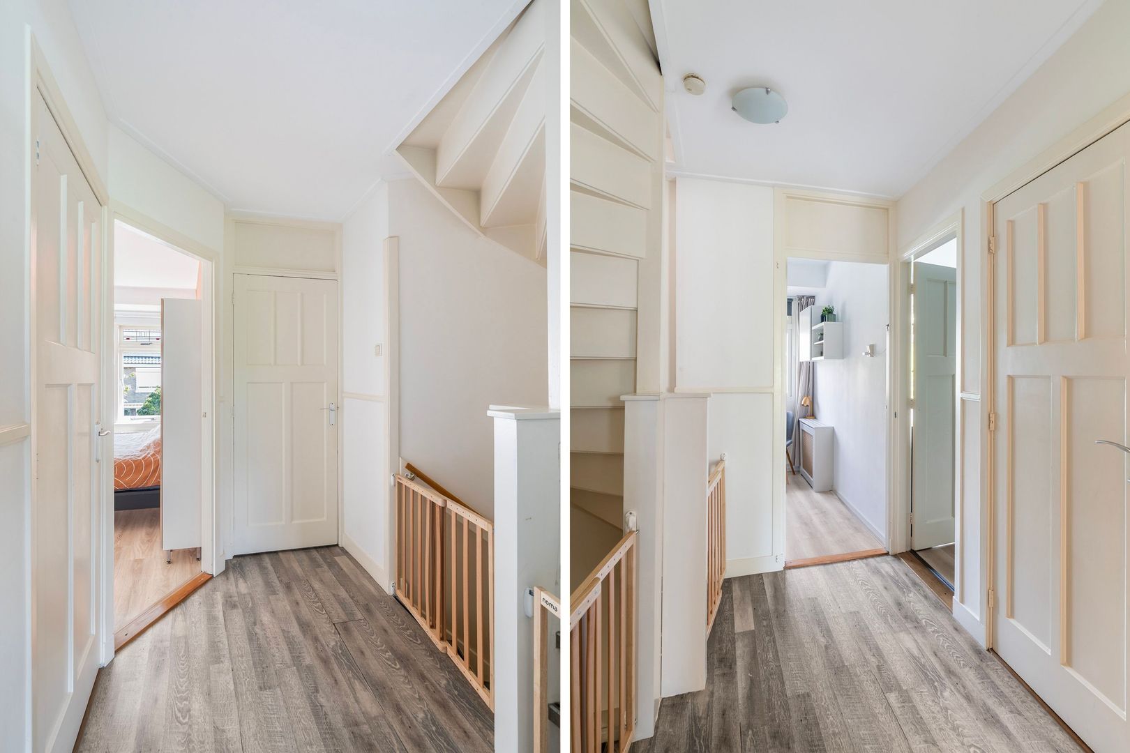 Overloop met toegang tot: Slaapkamer 4 met veel bergruimte onder de schuine kap. Aparte wasruimte, handig ingedeeld voor wasmachine, droger en extra opslag.