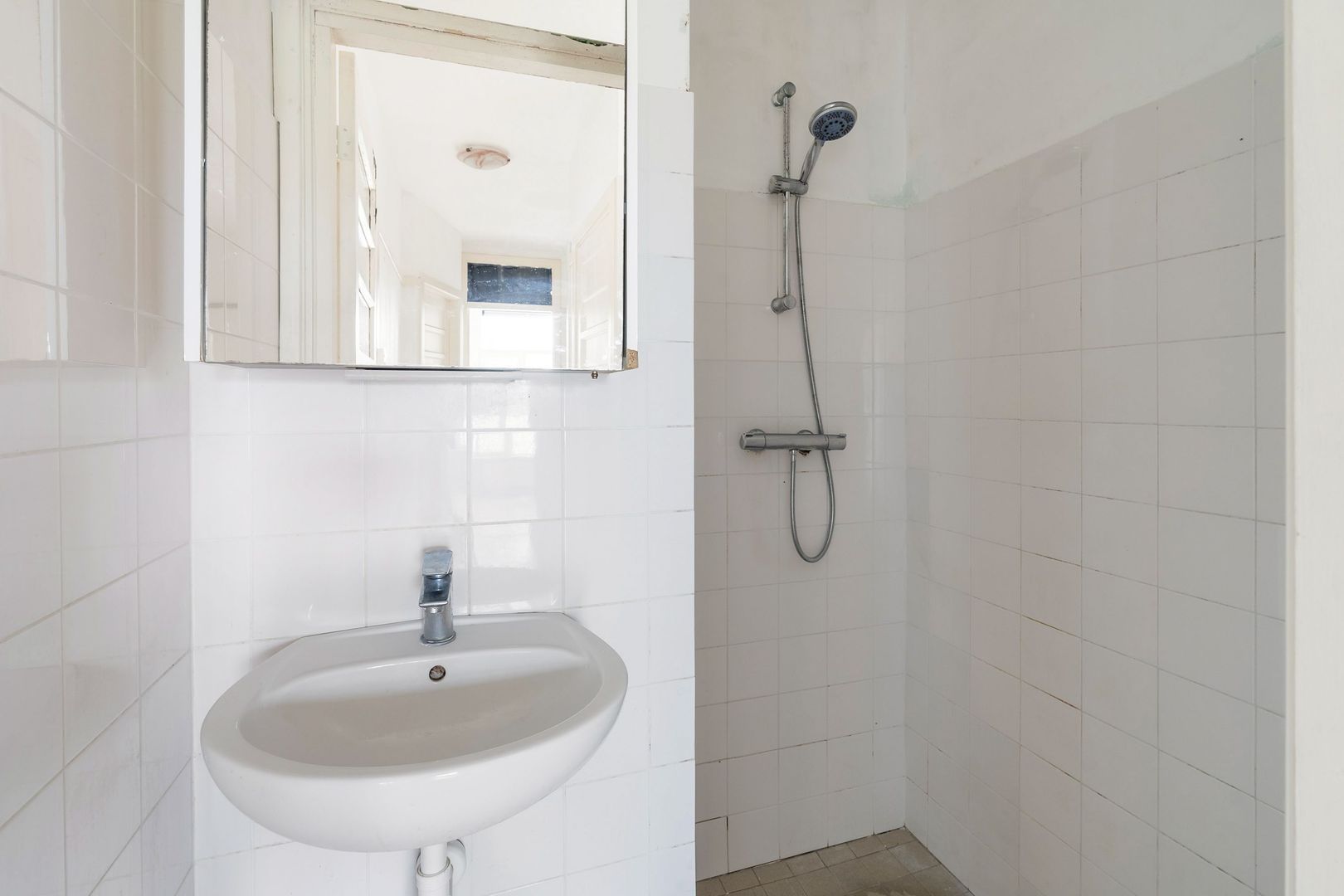 Woningentree via open portiek; hal met vaste kast; woonkamer en suite met vaste kasten en openslaande deuren naar het balkon; open keuken met een gaskookplaat, afzuigkap, oven, koelkast en de cv-opstelling; 1e slaapkamer aan de voorzijde; 2e slaapkamer aan de achterzijde; eenvoudige badkamer met douche en wastafel; net separaat toilet;
