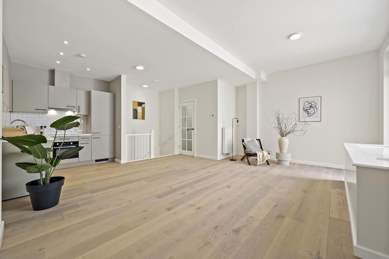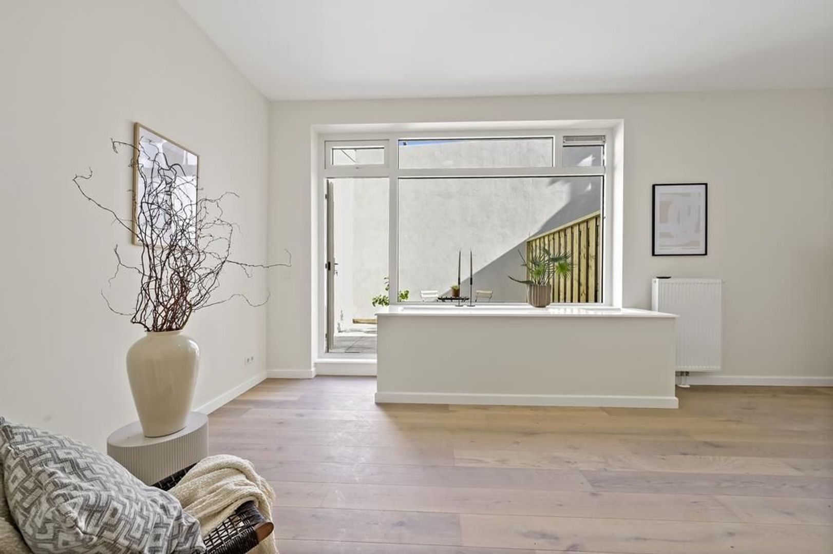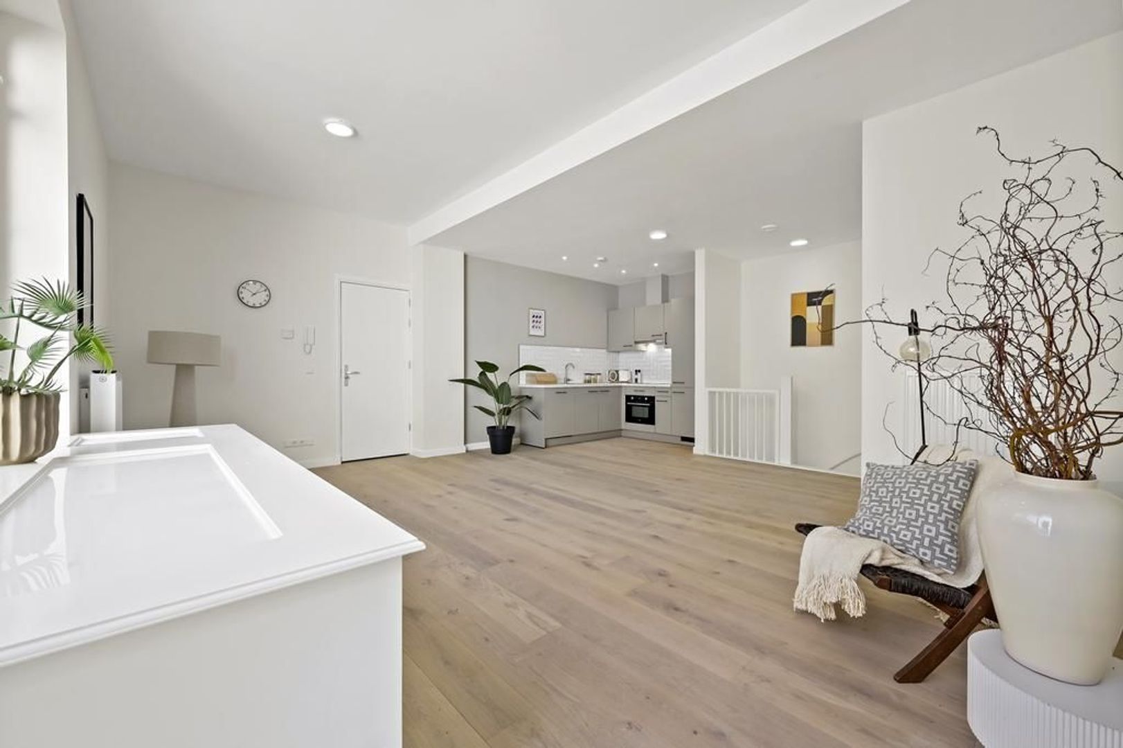 Entree appartement, woon-/eetkamer ca. 6.60x5.92 met zeer veel daglicht door de grote raampartijen voorzien van open keuken voorzien van een inductiekookplaat, afzuigkap, combi-oven, koelkast, vriezer en vaatwasser; separaat toilet met fontein; bergkast met opstelplaats wasmachine/droger; toegang tot het zonnige terras/patio ca. 3.56x3.42