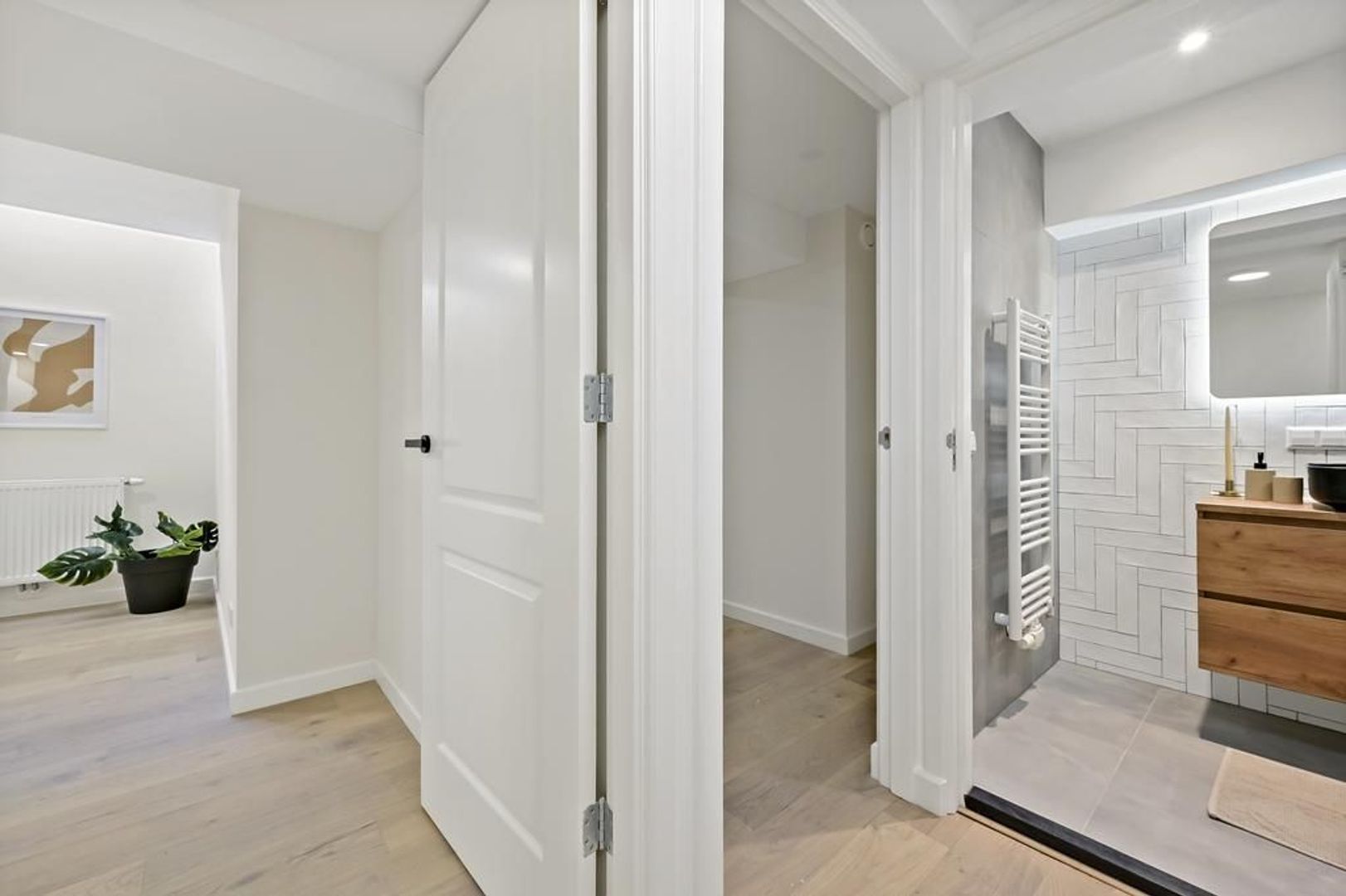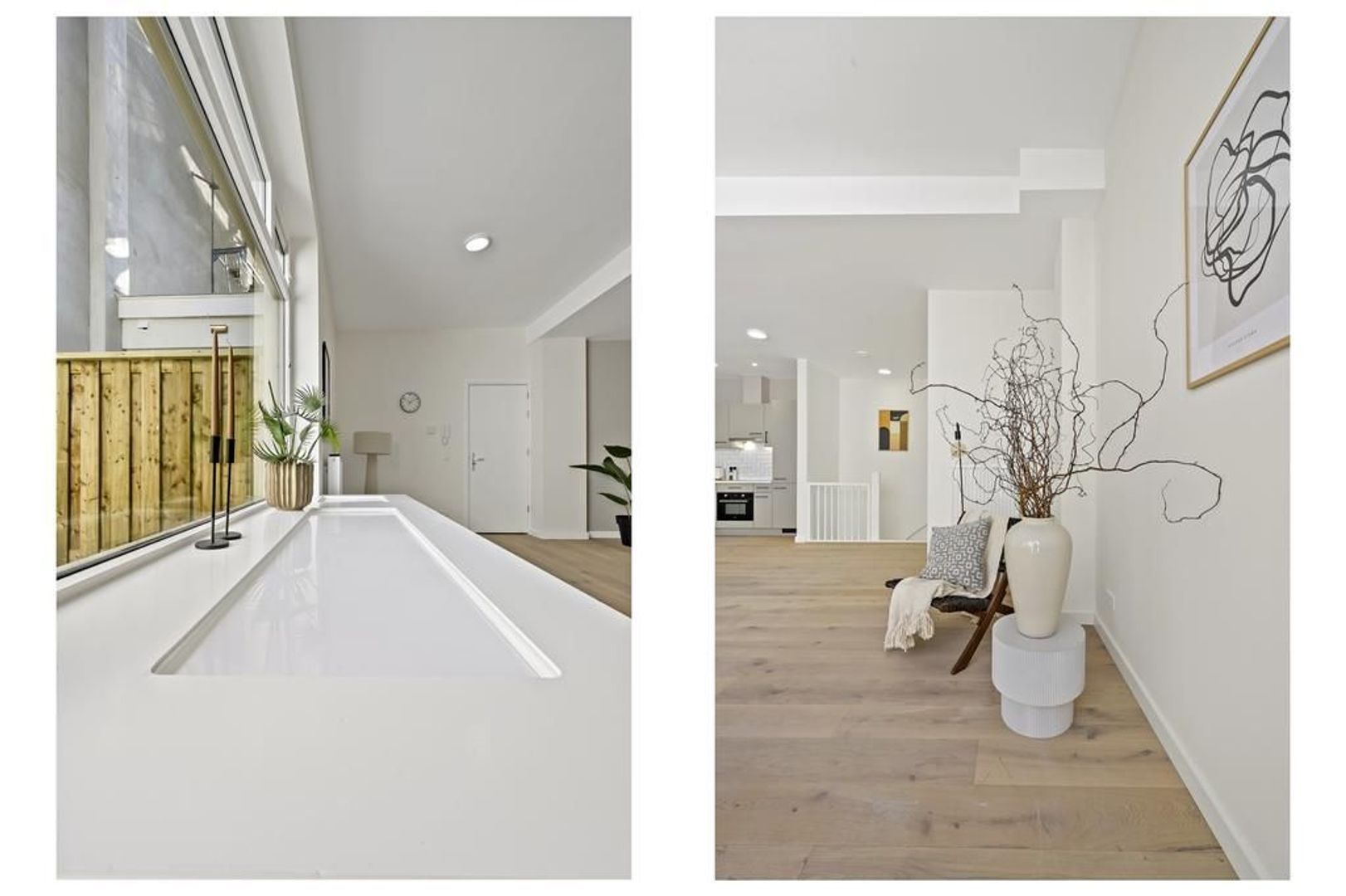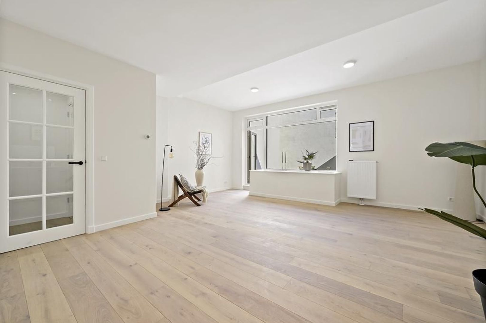 Entree appartement, woon-/eetkamer ca. 6.60x5.92 met zeer veel daglicht door de grote raampartijen voorzien van open keuken voorzien van een inductiekookplaat, afzuigkap, combi-oven, koelkast, vriezer en vaatwasser; separaat toilet met fontein; bergkast met opstelplaats wasmachine/droger; toegang tot het zonnige terras/patio ca. 3.56x3.42
