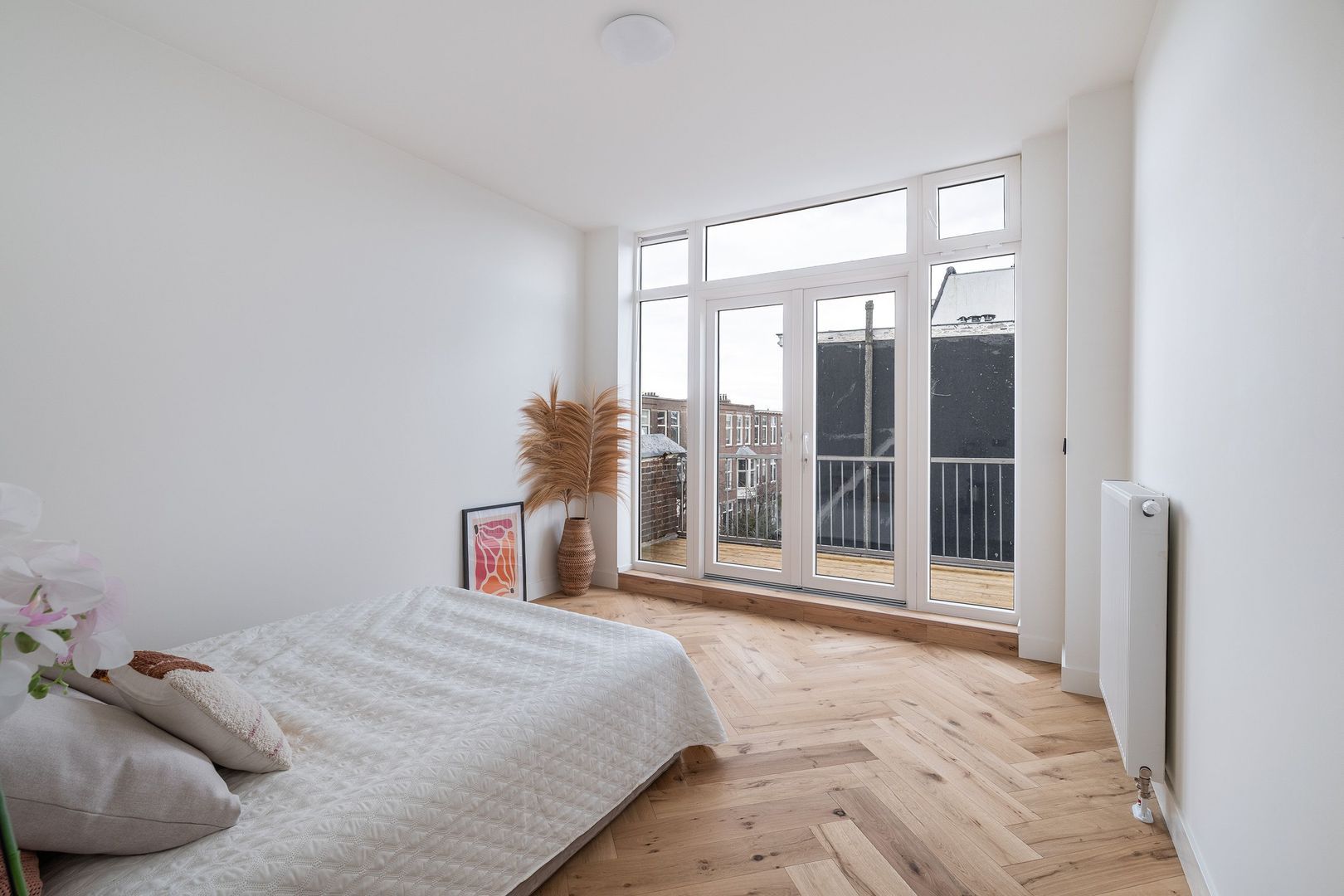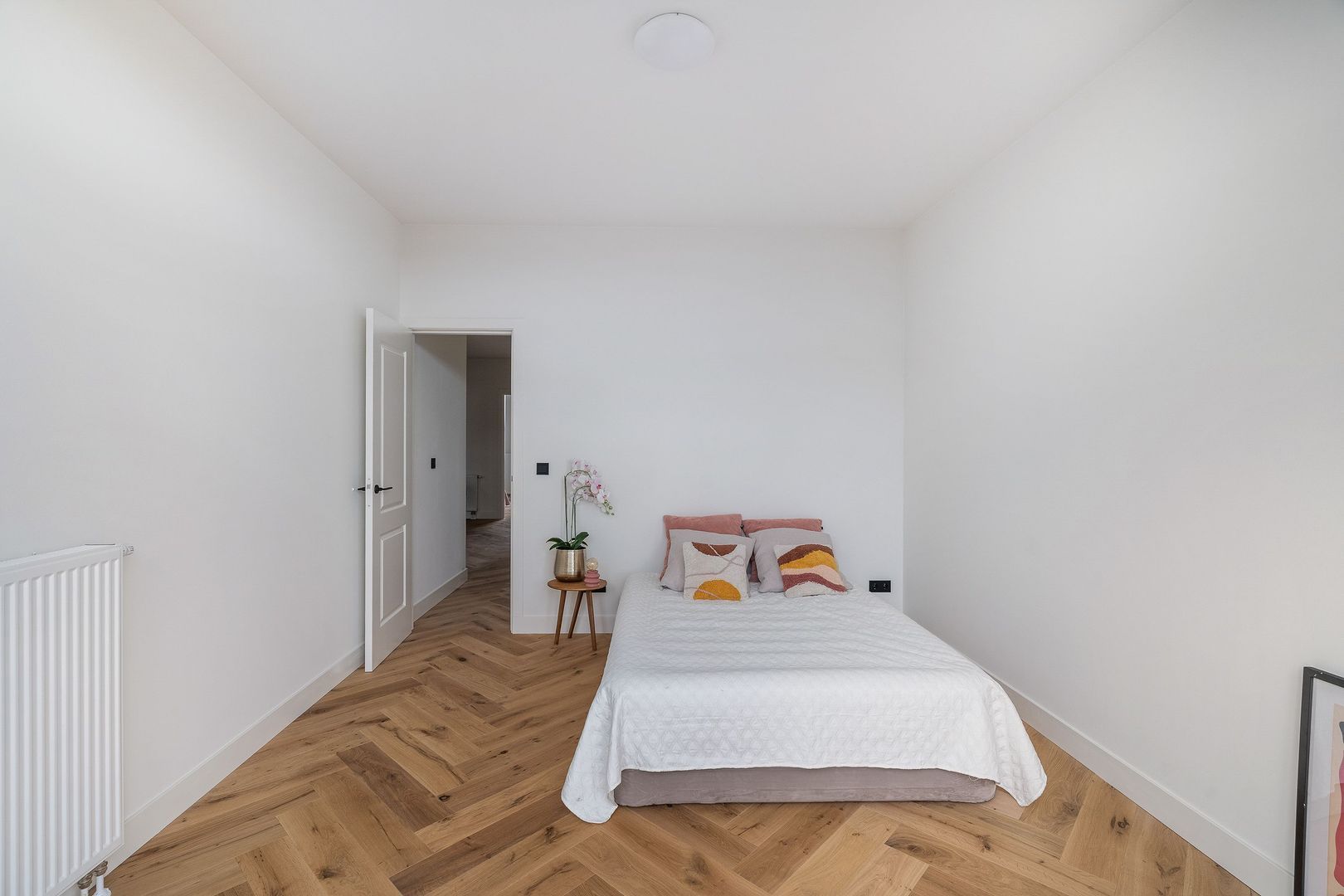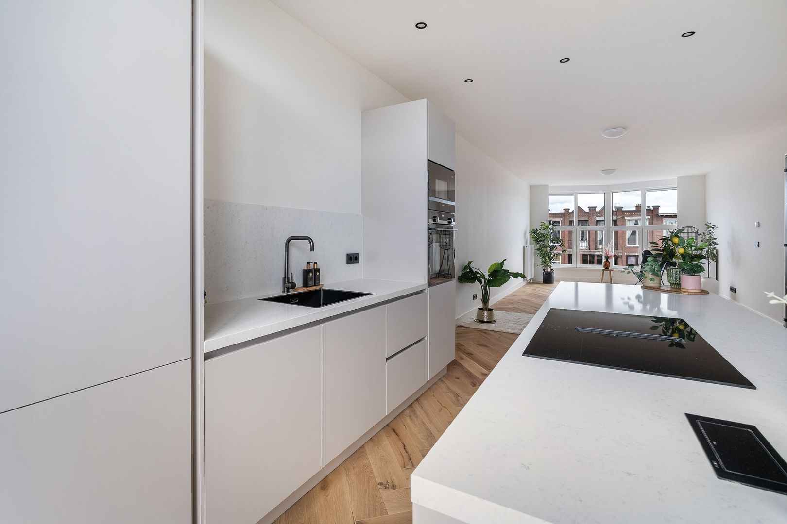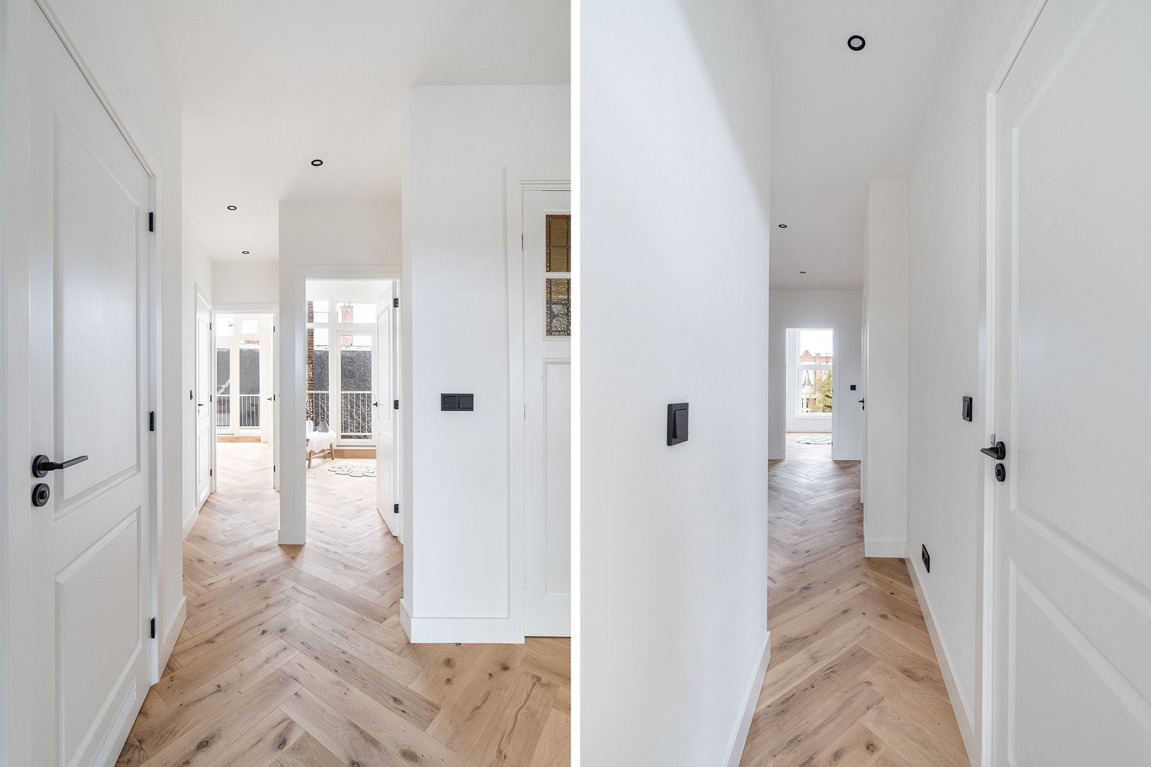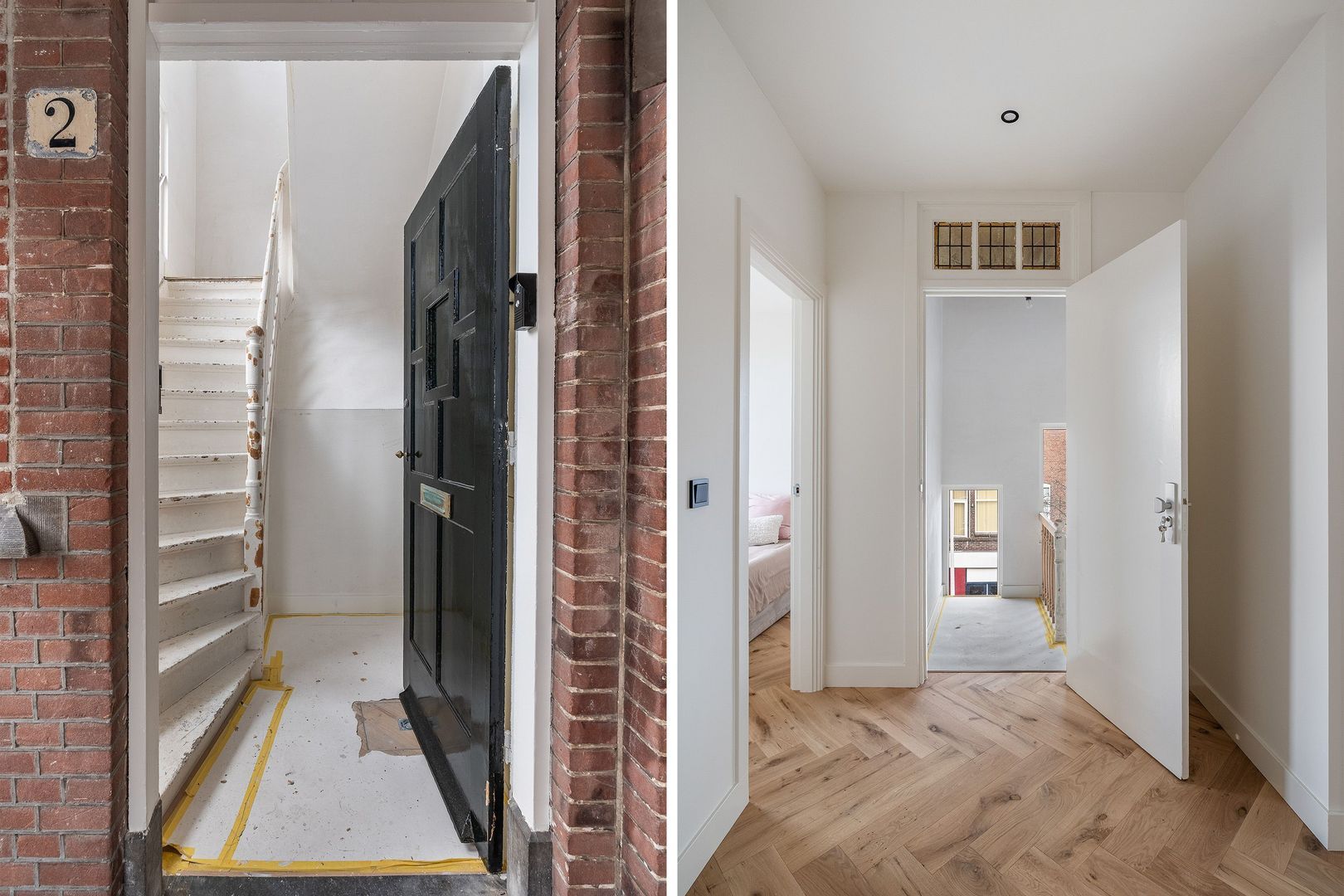Open portiek naar de centrale entree op de 1e etage; hal met binnentrap naar de woningentree op de 2e etage; ruime centrale hal met een vaste kast toegang tot alle vertrekken; riante woonkamer met een luxe open keuken voorzien van een kookeiland met een inductiekookplaat met geïntegreerde afzuiging, oven, magnetron, koel-vriescombinatie en een vaatwasser; 1e slaapkamer aan de voorzijde; 2e slaapkamer aan de voorzijde; 3e slaapkamer aan de achterzijde met 2 vaste kasten en toegang tot het 1e balkon; 4e slaapkamer met openslaande deuren naar het ruime 2e balkon;