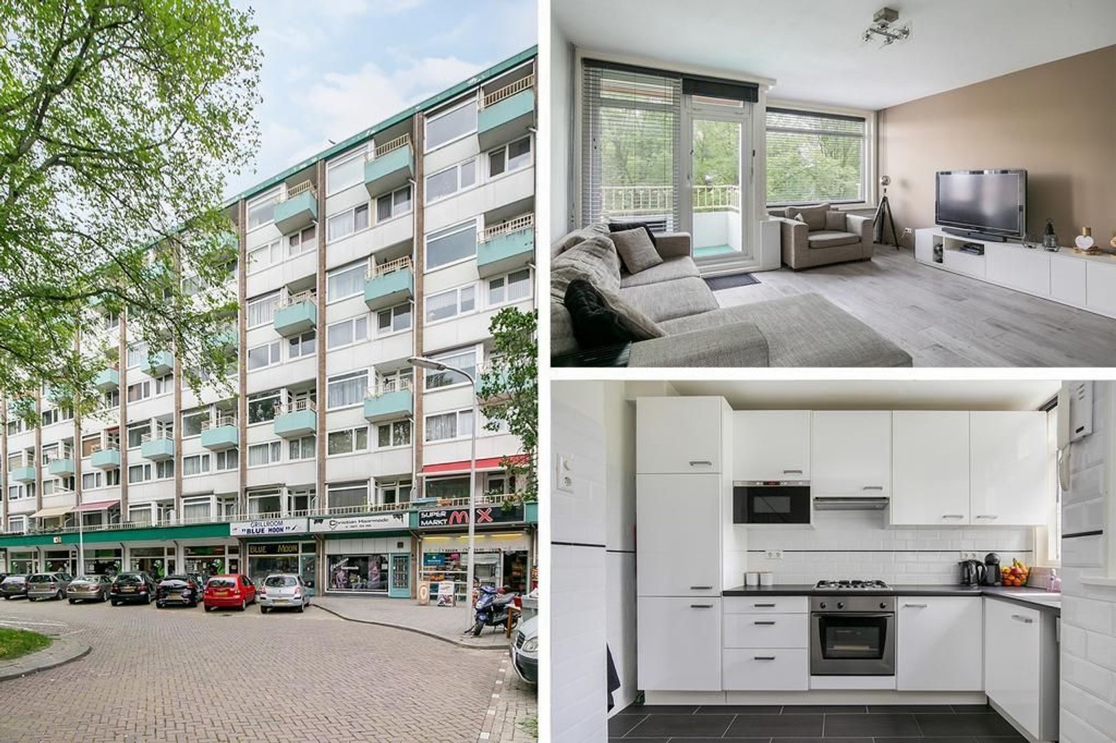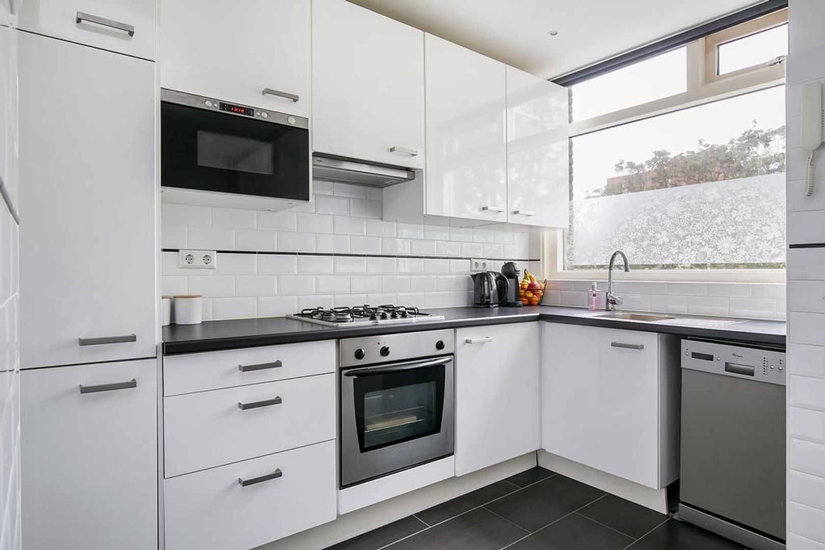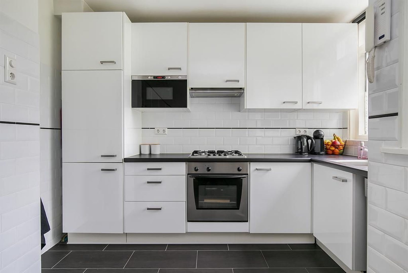 Entree via afgesloten centrale hal met lift: entree woning; halletje; meterkast; bergkast met aansluiting voor wasmachine; modern toilet met fonteintje; lichte woonkamer met laminaatvloer en toegang tot een ruim balkon (Zuiden), keurige open keuken in L-vorm opstelling met ingebouwde kookplaat, oven, afzuigkap, koelkast, vriezer, magnetron en (losse) vaatwasser (ca. 9.83x4.58).