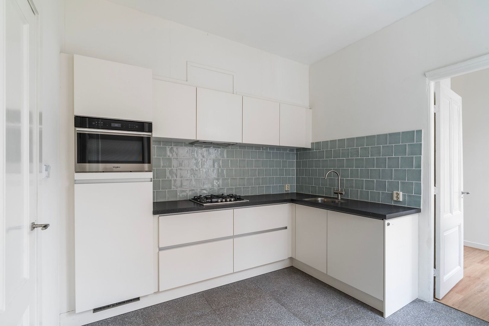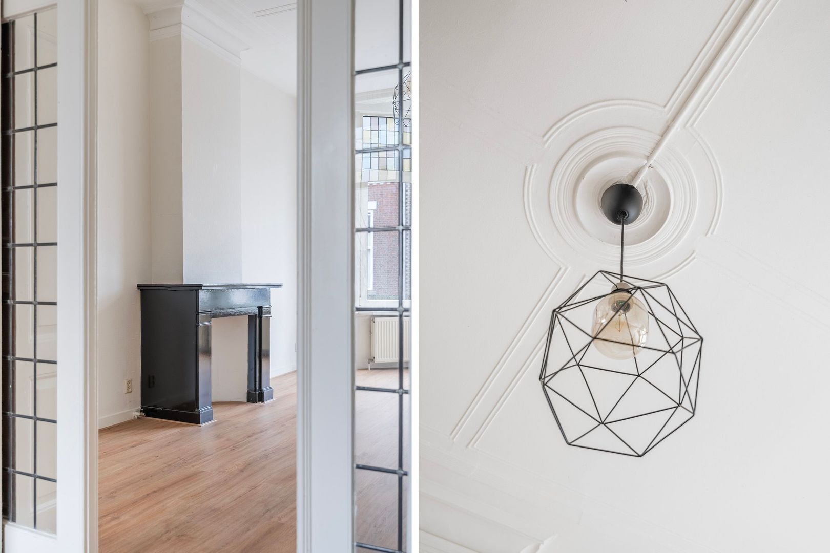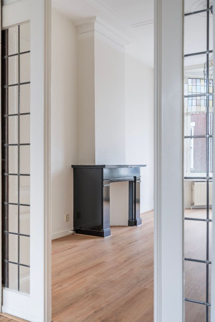 Entree via bordes op de 1e etage, gang met bergruimte en toilet; woonkamer ensuite totaal ca. 11.96x3.76/3.06 verdeeld in lichte voorkamer ca. 6/05x3.76 inclusief een sfeervolle erker, suite kasten, schouw, geornamenteerd plafond en schuifseparatie naar de achterkamer ca. 5.40x3.76/3.06 met suite kasten, schouw, geornamenteerd plafond. Via de achterkamer toegang tot de in 2022 vernieuwde keuken ca. 3.71x2.71 met keukenblok in L-vorm opstelling en ingebouwde kookplaat, afzuigkap, combi-oven, koel-vries combinatie en vaatwasser. Via keuken toegang tot de moderne badkamer met inloopdouche en wastafelmeubel. Via keuken toegang tot achterhuis met 2 in elkaar doorlopende slaapkamers. Slaapkamer I ca. 2.51x2.73 met vaste kast met opstelplaats cv-ketel en toegang tot de achterslaapkamer II ca. 3.49x2.71 met toegang tot het balkon op het zuidoosten.