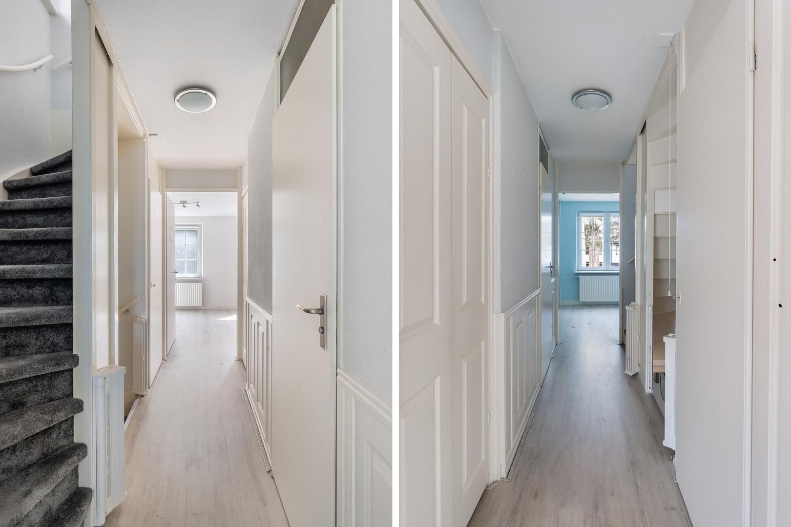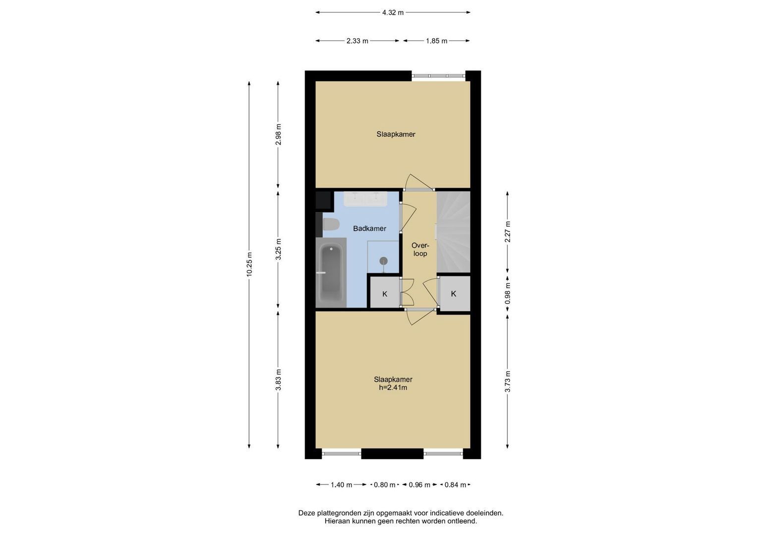 1e Etage: trap vanaf de begane grond naar de overloop op de 1e etage; slaapkamers aan de voorzijde ca. 4.32x2.98; slaapkamer aan de achterzijde ca. 3.83x4.32; verzorgde badkamer ca. 3.25/2/28x2.33 met wastafelmeubel, douchecabine, ligbad en toilet (wandcloset);