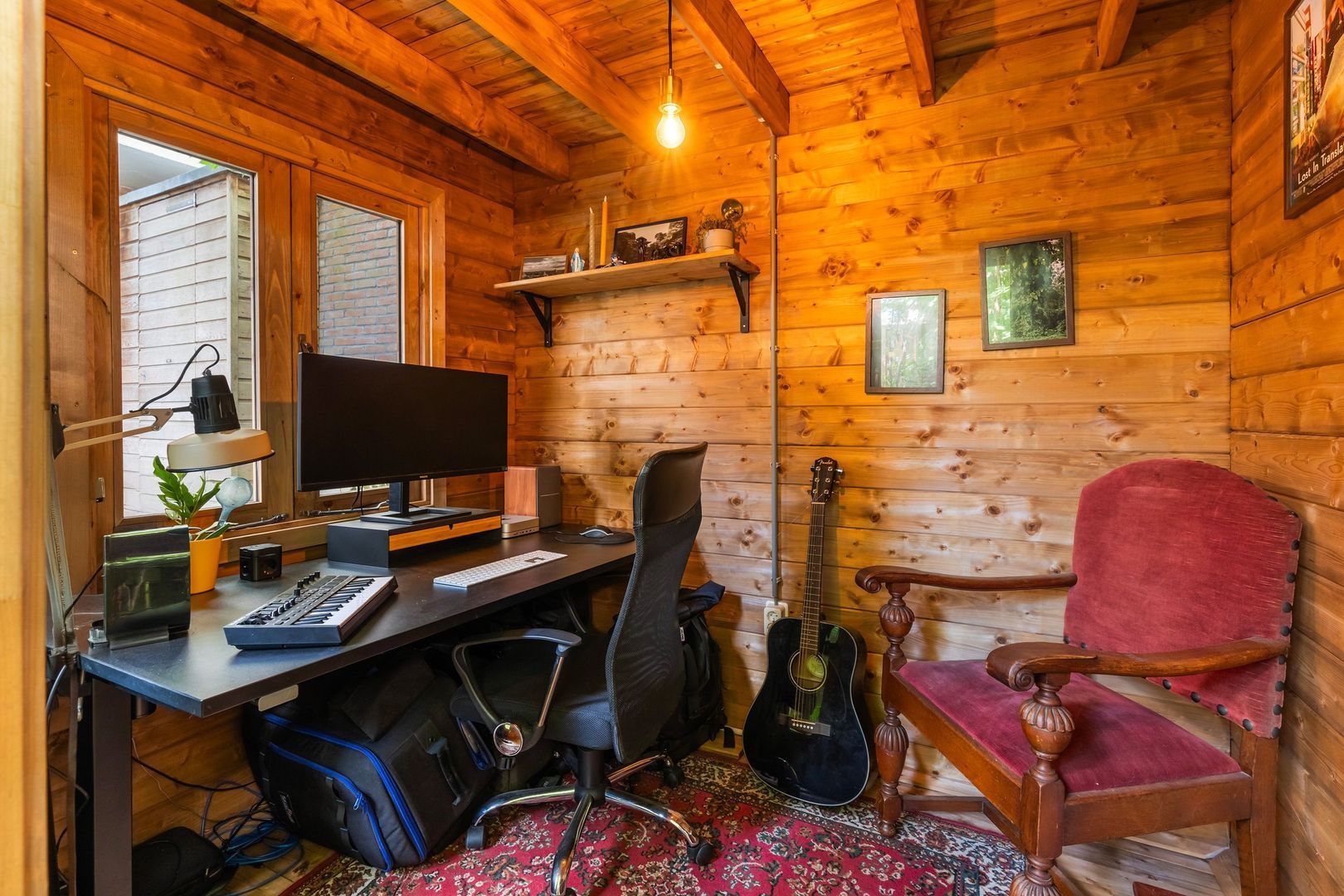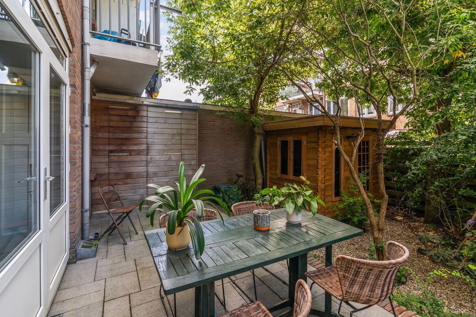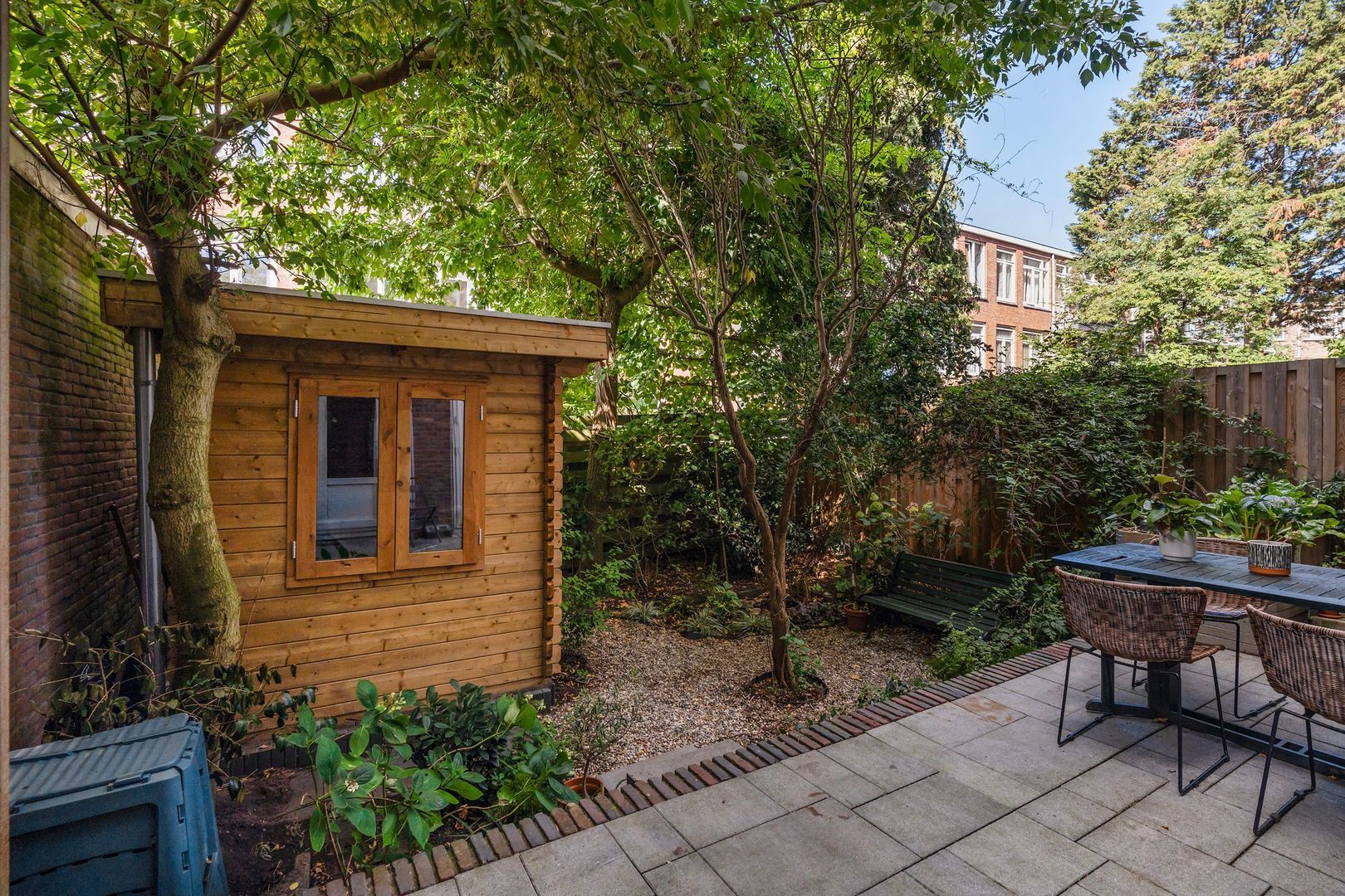 + Zonnige achtertuin op het Zuid Westen met mooi tuinhuis, thans in gebruik als werkplek