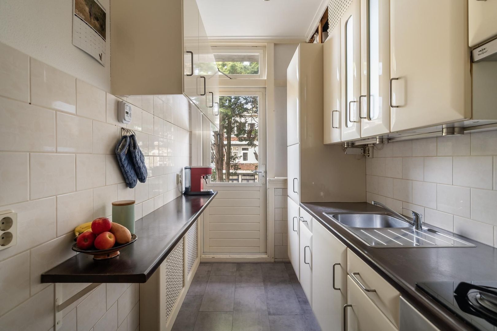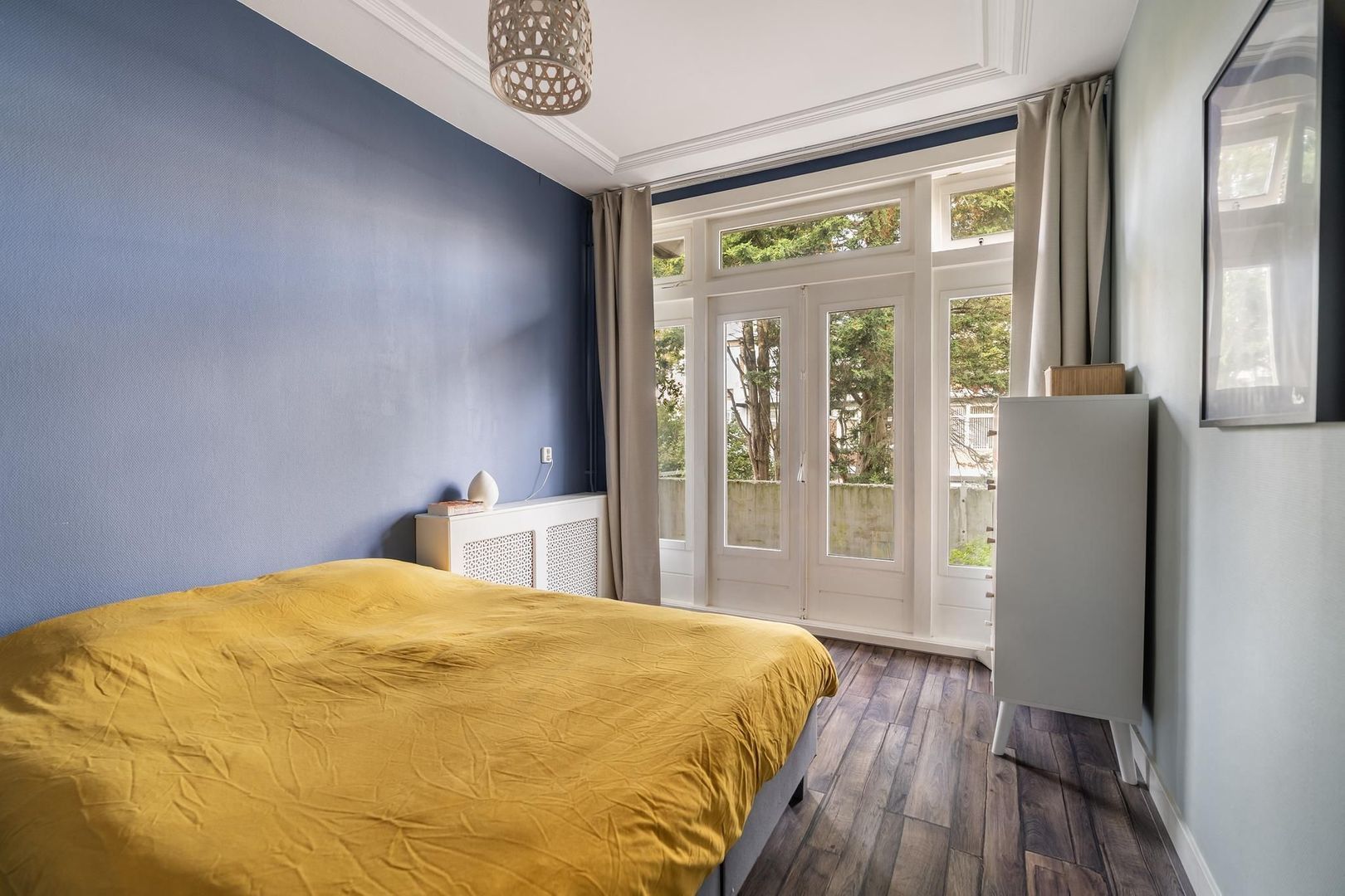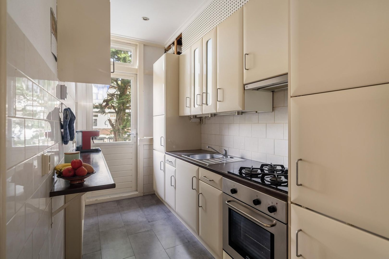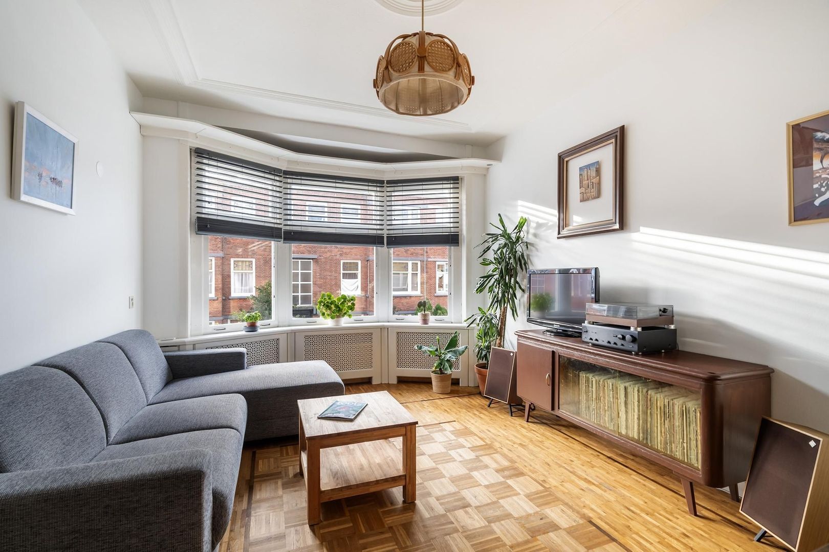 Open portiek met trap naar de 1e etage: entree woning: hal; gang is voorzien van meerdere opbergruimtes; verzorgd toilet; lichte woonkamer met sfeervolle erker. Tussengelegen ruimte van ca. 8 m² is vrij te besteden als inloopkast of kantoorruimte; nette keuken met gaskookplaat, afzuigkap, oven, koelkast, opstelplaats Cv-ketel en toegang tot het achterbalkon; via de tussenruimte toegang tot de 1e ruime slaapkamer aan de achterzijde met openslaande deuren naar het achterbalkon; de 2e slaapkamer is eveneens aan de achterzijde gesitueerd met openslaande deuren naar het achterbalkon. Een derde slaapkamer treft u aan de voorzijde; badkamer met ligbad met wastafel; aparte ruimte in gang bestemd voor opstelplaats wasmachine en droger.