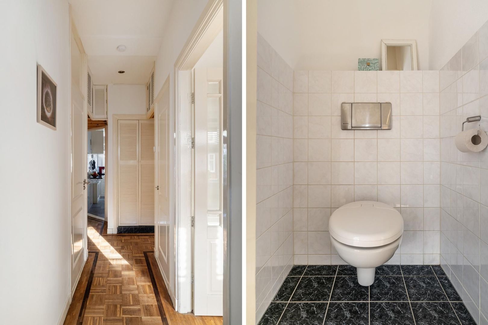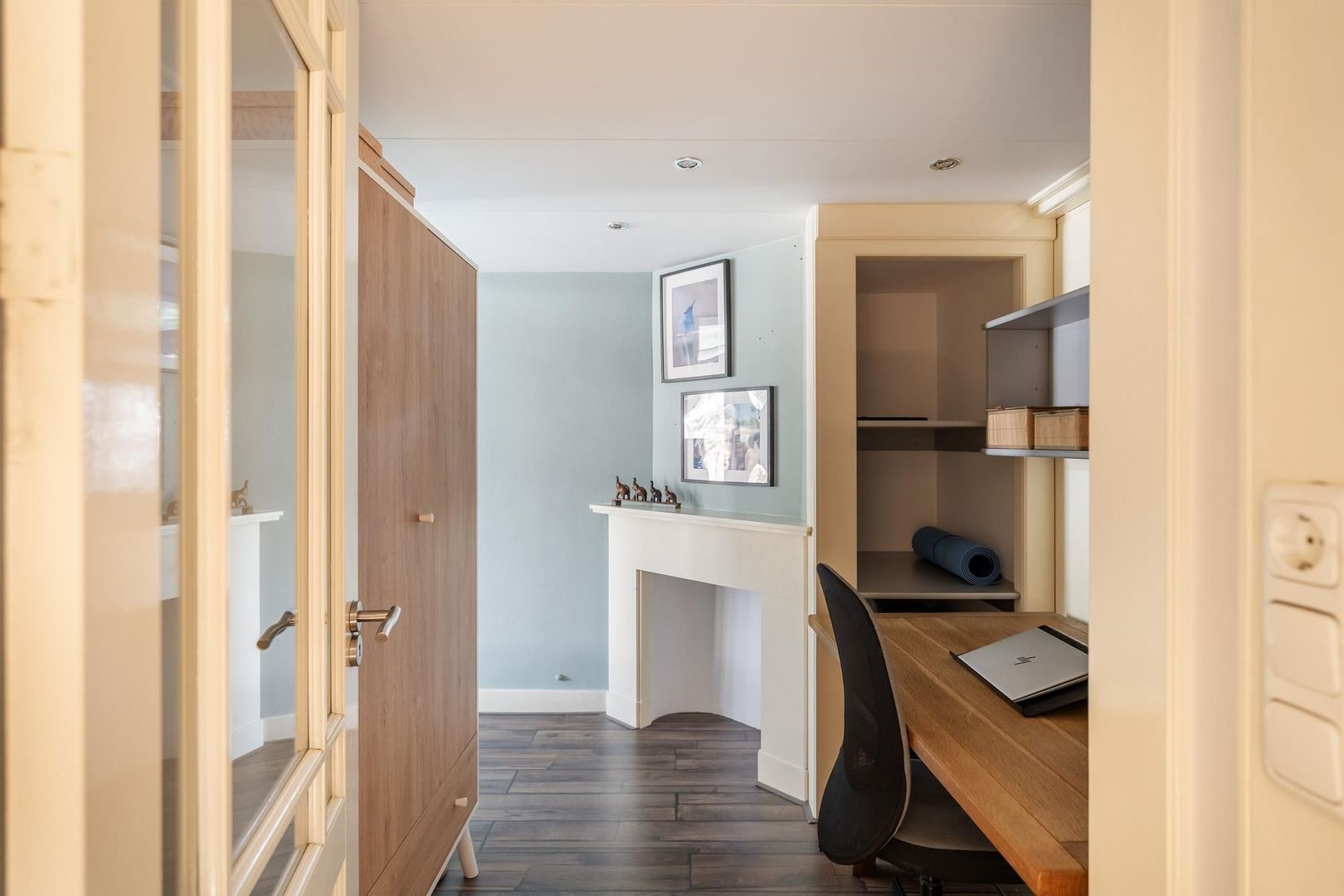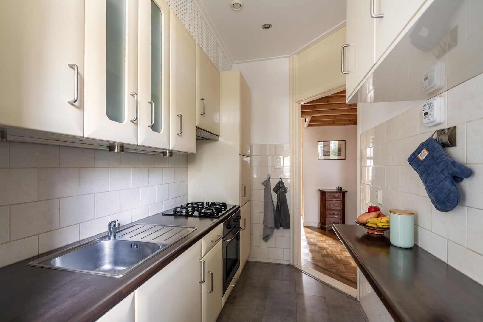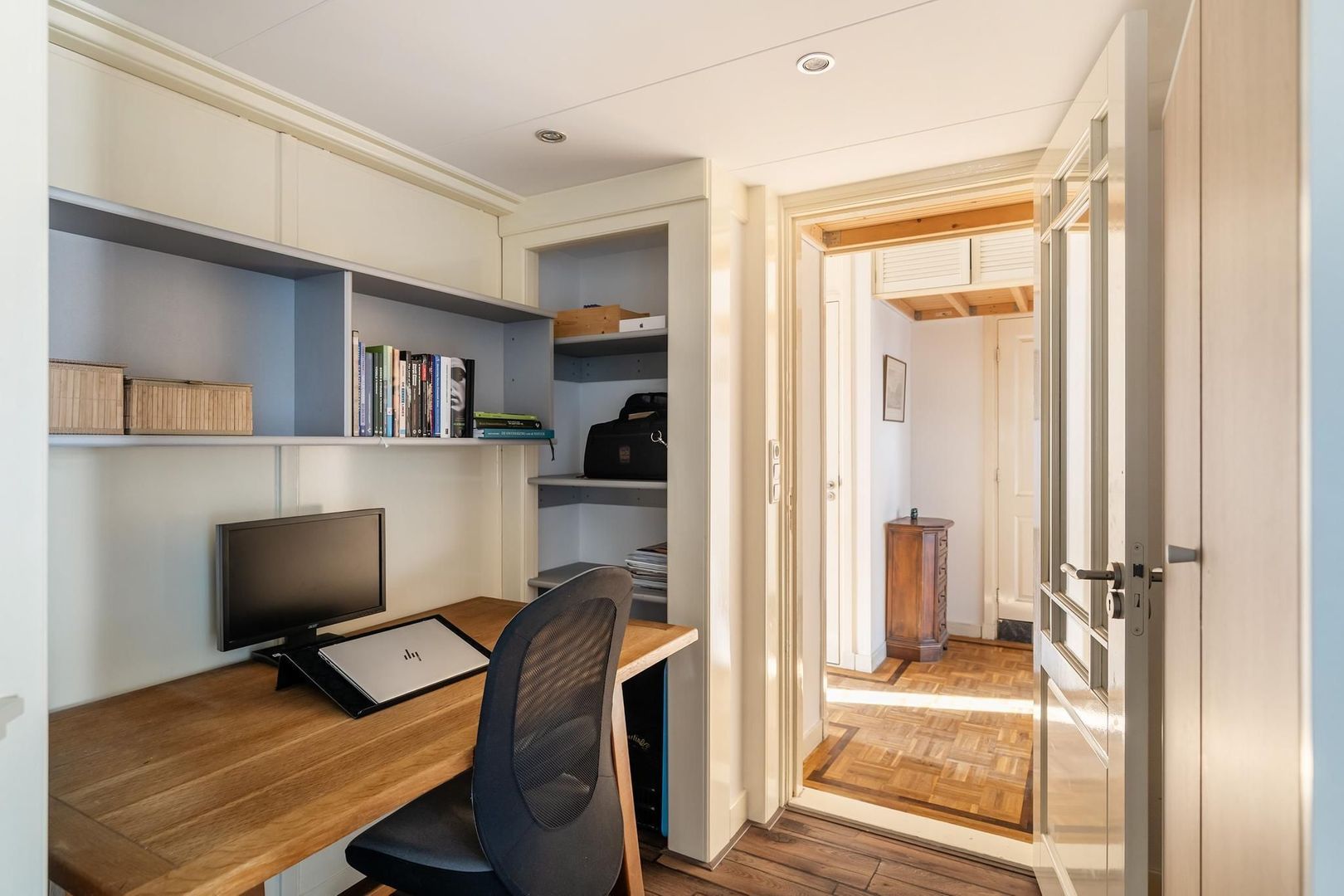 Open portiek met trap naar de 1e etage: entree woning: hal; gang is voorzien van meerdere opbergruimtes; verzorgd toilet; lichte woonkamer met sfeervolle erker. Tussengelegen ruimte van ca. 8 m² is vrij te besteden als inloopkast of kantoorruimte; nette keuken met gaskookplaat, afzuigkap, oven, koelkast, opstelplaats Cv-ketel en toegang tot het achterbalkon; via de tussenruimte toegang tot de 1e ruime slaapkamer aan de achterzijde met openslaande deuren naar het achterbalkon; de 2e slaapkamer is eveneens aan de achterzijde gesitueerd met openslaande deuren naar het achterbalkon. Een derde slaapkamer treft u aan de voorzijde; badkamer met ligbad met wastafel; aparte ruimte in gang bestemd voor opstelplaats wasmachine en droger.