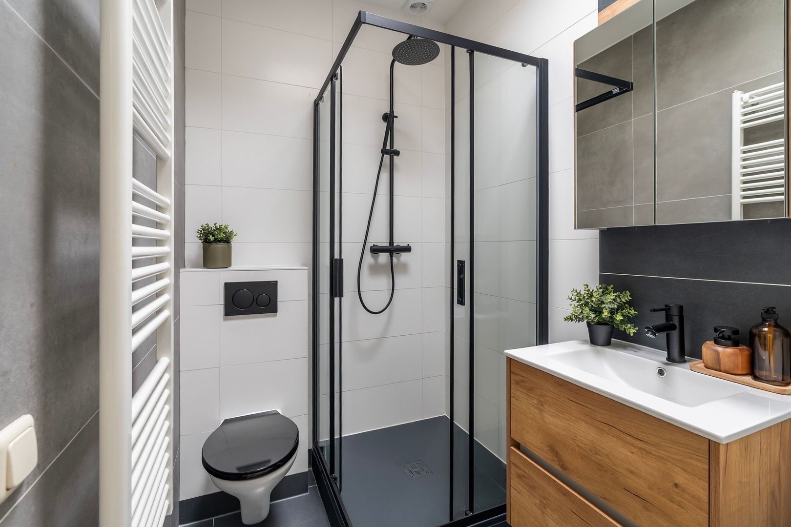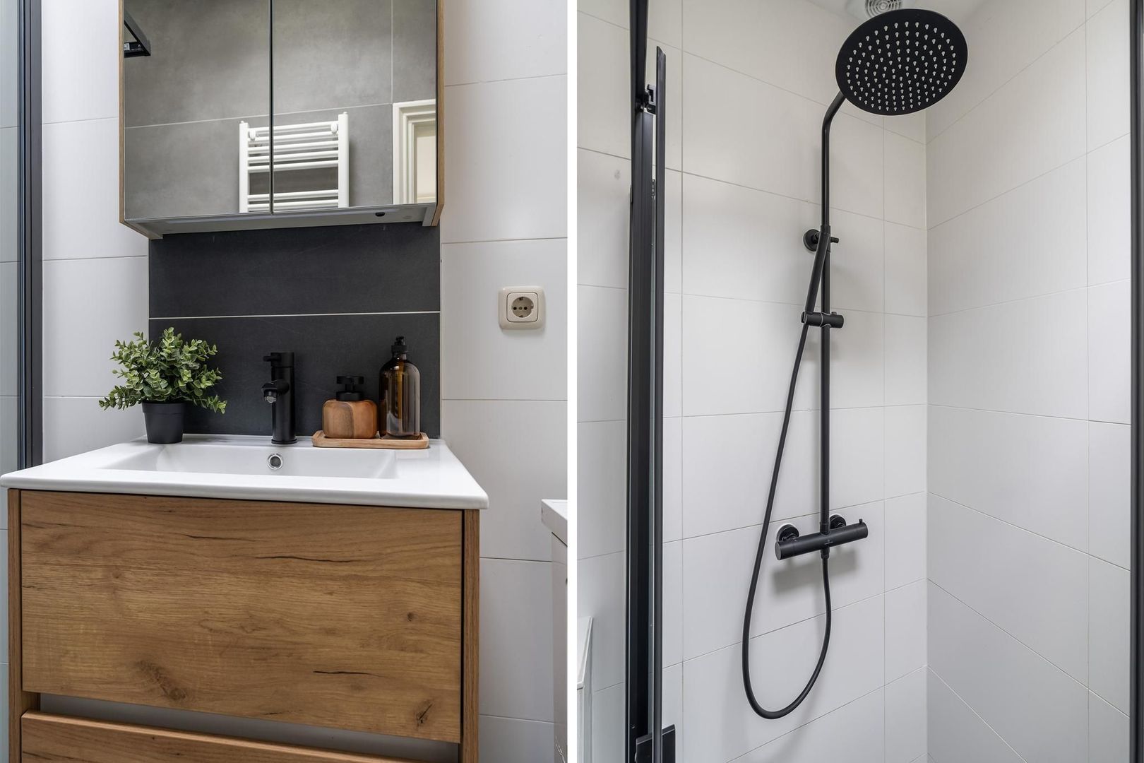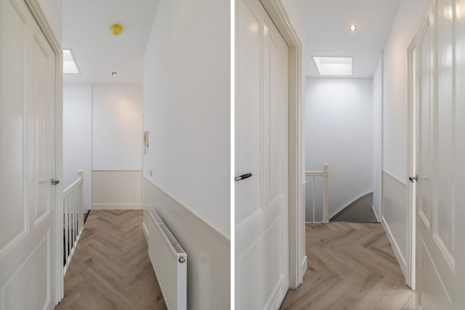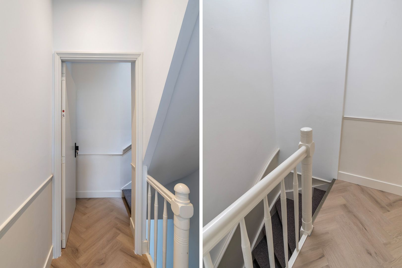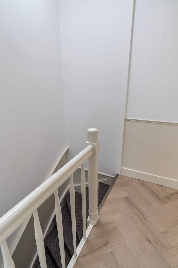 Centraal entree aan de straatzijde; binnentrap naar de 1e etage; overloop met entree woning; binnentrap naar de 2e etage; hal met berging; aan de voorzijde gesitueerde woonkamer met 3 raamkozijnen en de open keuken die voorzien is van inductiekookplaat, afzuigkap, vaatwasser, koel/vriescombinatie, combi-oven en veel kastruimte; via de hall toegang dot de 2 slaapkamers die aan de achterzijde zijn gesitueerd en beide toegang bieden tot het balkon/terras. Keurige badkamer met douche, toilet (wandcloset) wastafelmeubel en aansluiting voor een wasmachine. Het terras loopt over de volle breedte met een smal gedeelte en een diep zitgedeelte van ca. 3.1x2.7 (totaal 11m2). Met zijn zuidwestelijke ligging is hier volop zon totdat deze in de avond verdwijnt