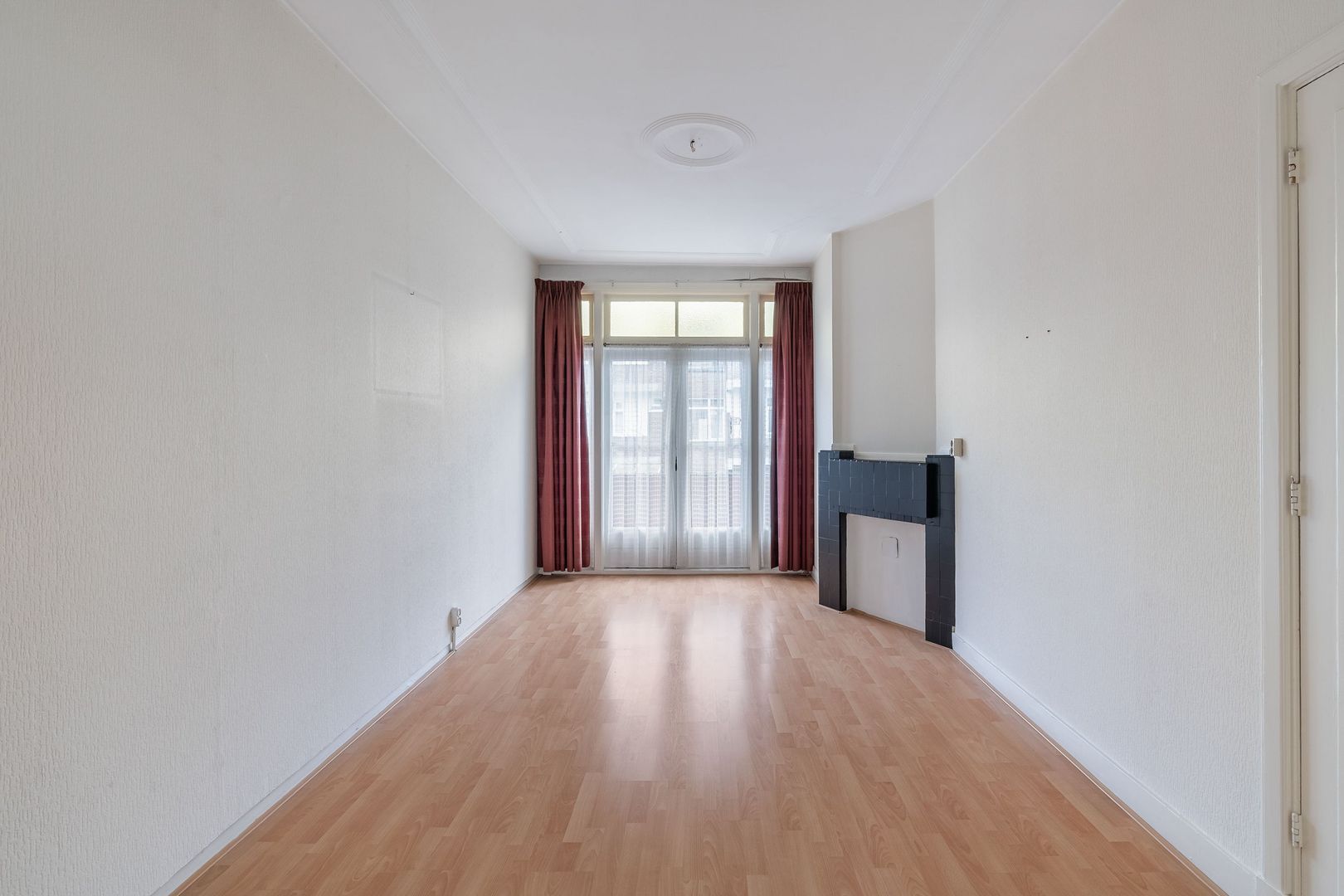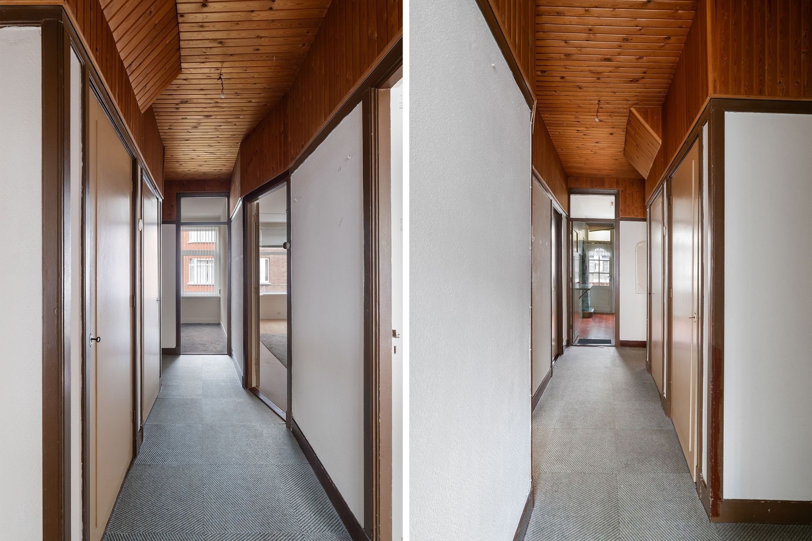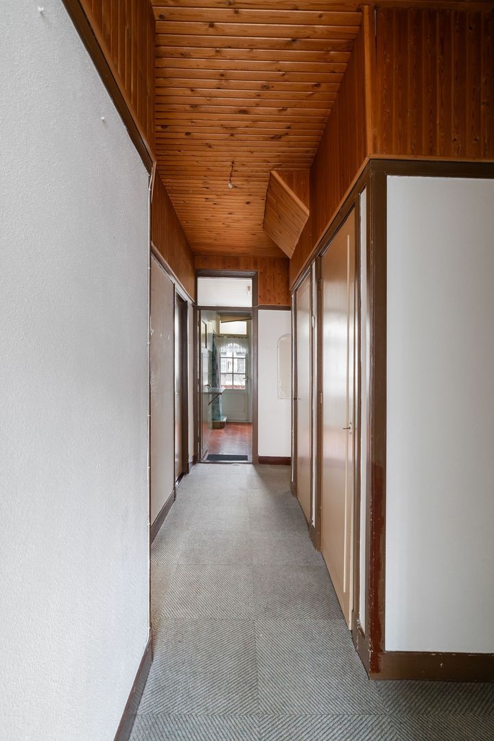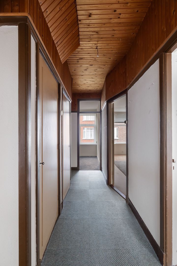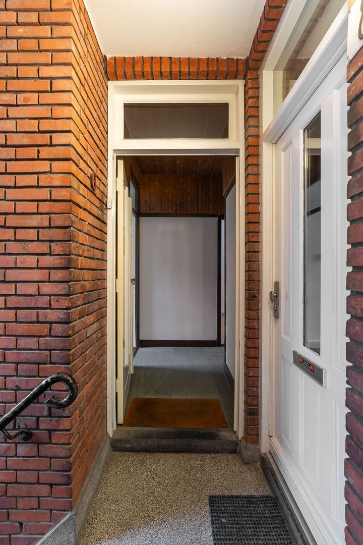 Entree op de 1e etage via open portiek; gang met meterkast; royale woonkamer met sfeervolle erker aan de voorzijde, vaste kasten en achtergelegen eetkamer (eventueel eenvoudig te verbouwen en als 3e slaapkamer te gebruiken) met openslaande deuren naar het balkon over de gehele breedte; aparte eenvoudige keuken met douche en toegang tot het balkon; 1e slaapkamer aan de voorzijde; 2e slaapkamer aan de achterzijde; separaat toilet met fonteintje.