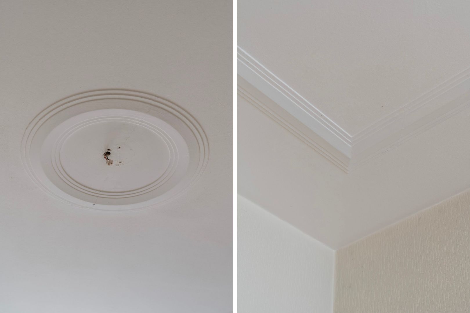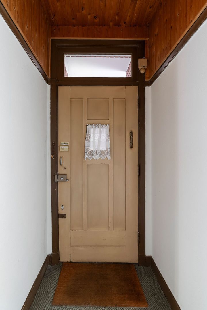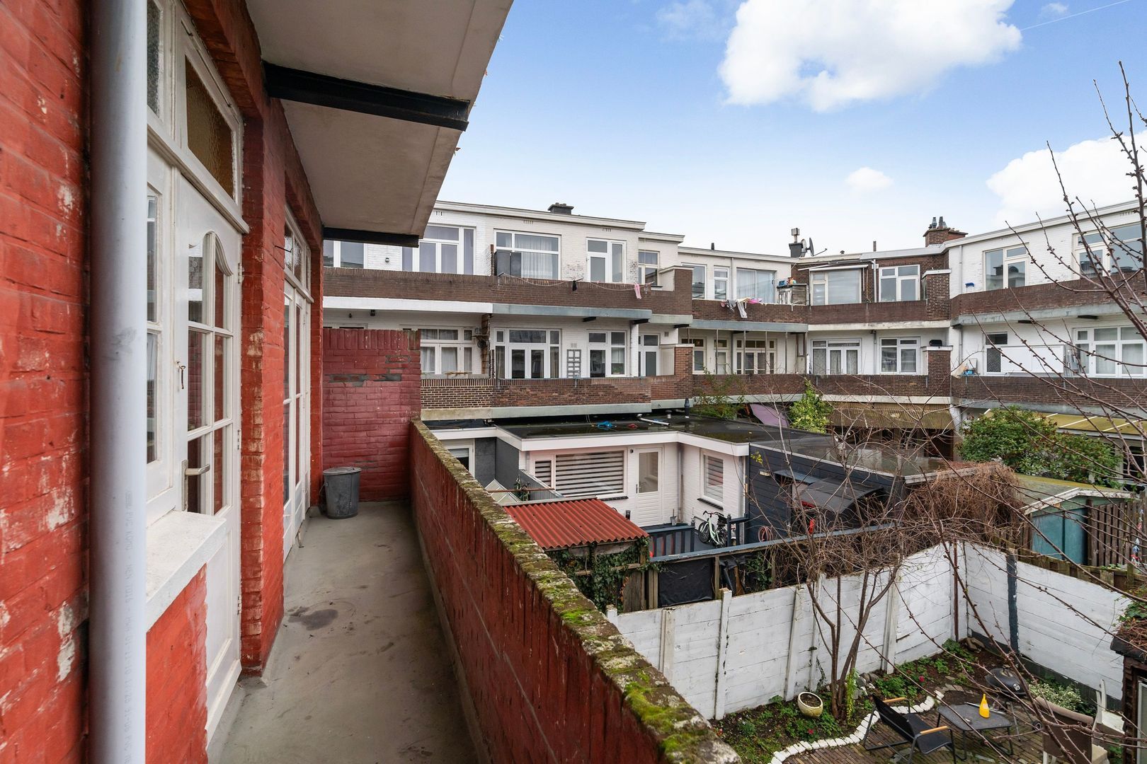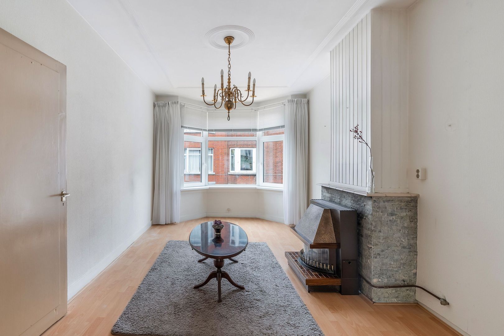 Entree op de 1e etage via open portiek; gang met meterkast; royale woonkamer met sfeervolle erker aan de voorzijde, vaste kasten en achtergelegen eetkamer (eventueel eenvoudig te verbouwen en als 3e slaapkamer te gebruiken) met openslaande deuren naar het balkon over de gehele breedte; aparte eenvoudige keuken met douche en toegang tot het balkon; 1e slaapkamer aan de voorzijde; 2e slaapkamer aan de achterzijde; separaat toilet met fonteintje.