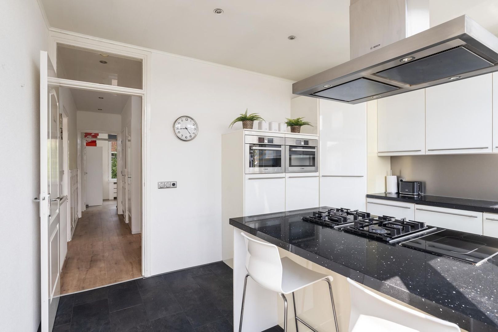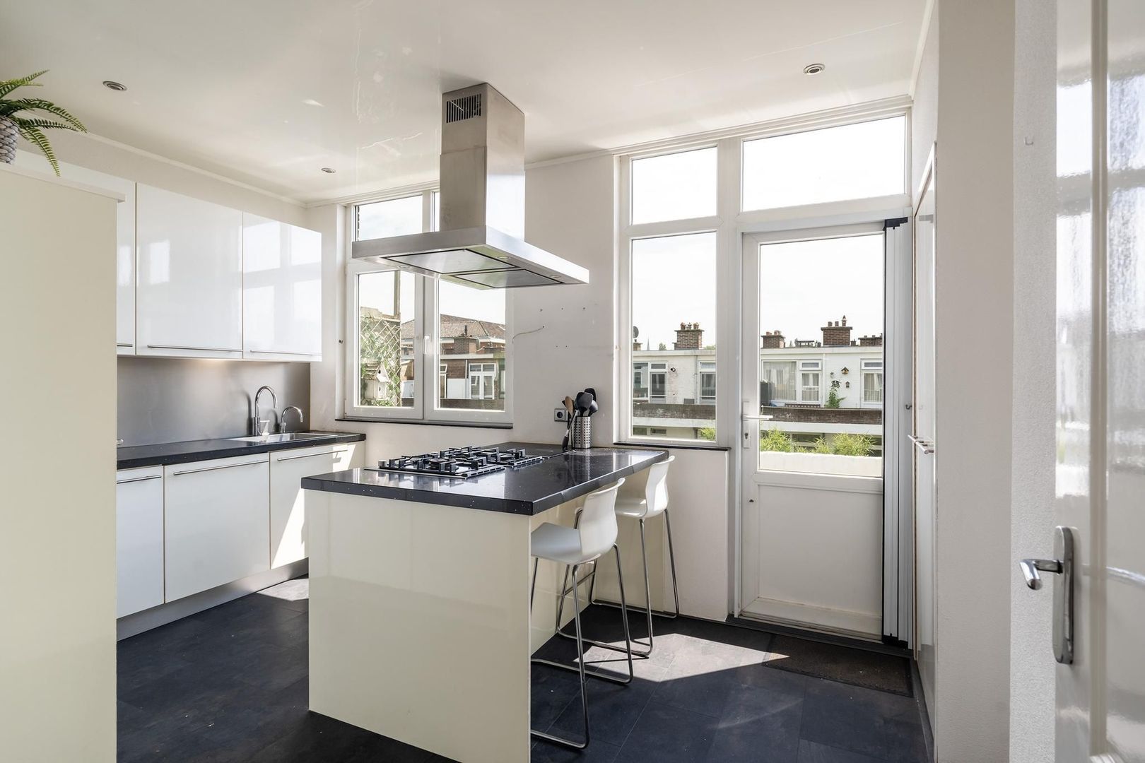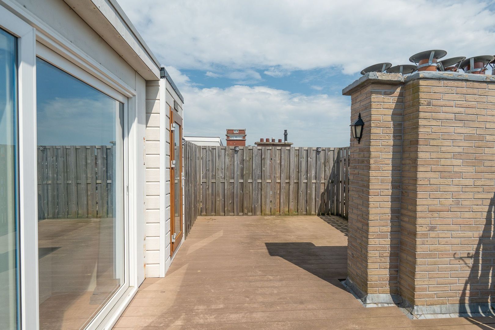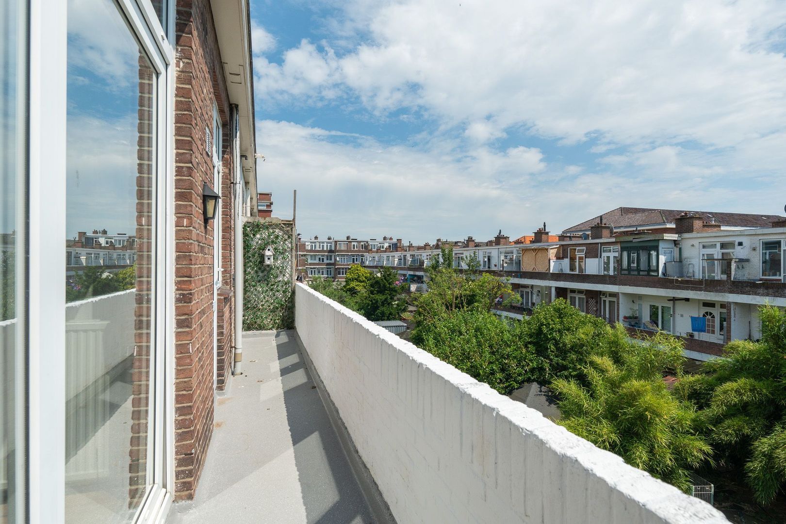 Entree op 1e etage via Haags portiek met bergruimte. Binnentrap naar 2e etage; overloop; grote berging met aansluiting voor wasmachine/droger; toilet met fonteintje; riante doorgebroken woonkamer ca. 10.91x3.51/3.34 met open haard partij, erker aan de voorzijde en schuifpui naar het balkon; grote luxe en moderne woonkeuken met blok in L-vorm opstelling en kookeiland met ingebouwde Bosch apparatuur zoals 2 gaskookplaten en een elektrische plaat, vlakscherm afzuigkap, oven, combi-oven/magnetron, koelkast, vriezer, vaatwasser, opstelplaats cv ketel en toegang tot het balkon over de gehele breedte van de woning; nette degelijke badkamer met regen- en handdouche, wastafel en handdoekradiator; grote slaapkamer aan de voorzijde ca. 4.12x3.47 met trap naar zolderetage: overloop; 2 slaapkamers resp. ca. 3.89/176x368/182 aan de voorzijde met dakraam en 1 van ca. 5.50x3.36 met kastenwand en schuifpui naar groot dakterras op het Zuiden georiënteerd ca. 7.03x3.69 met berging.