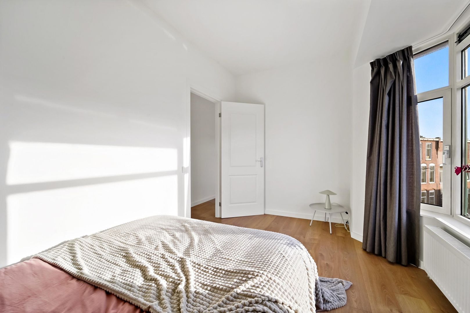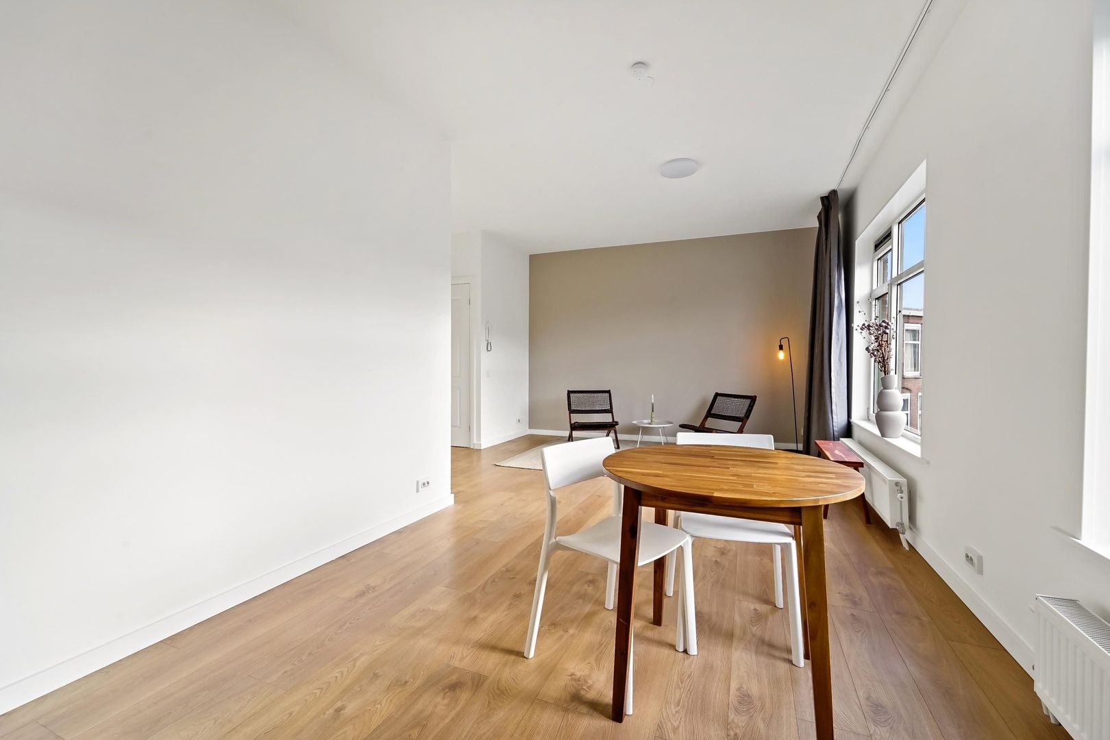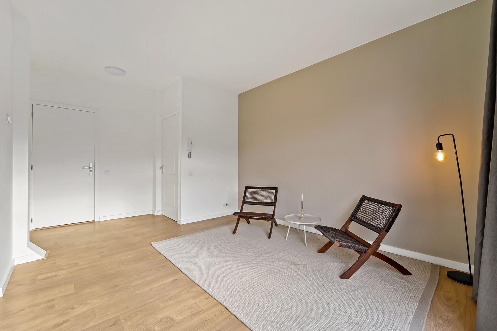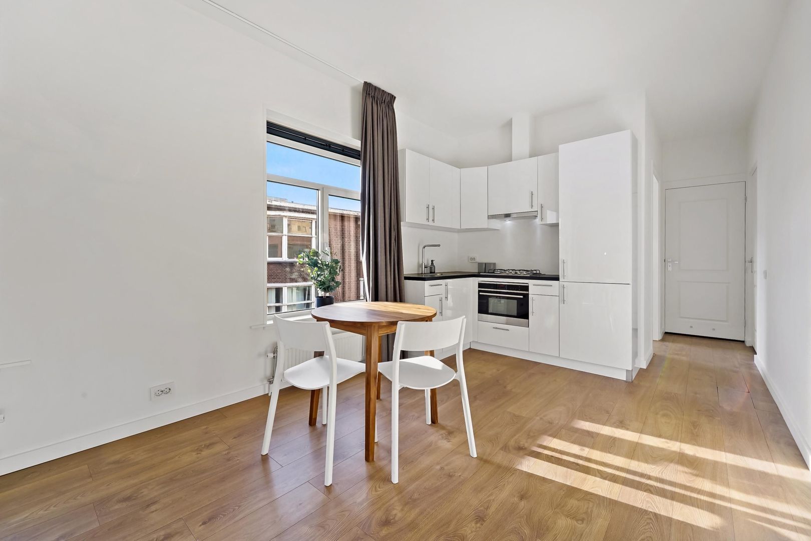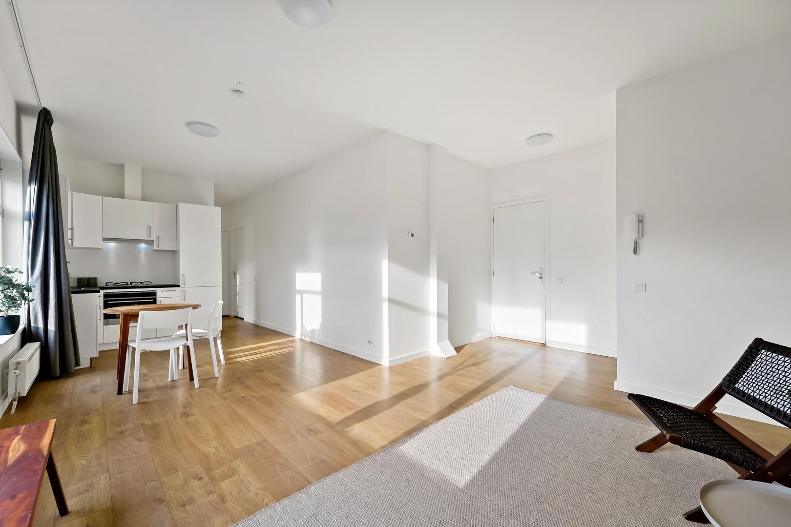 Het woon-/eetgedeelte kent een ruimtelijke opzet met hoge ramen en een open keuken, uitgerust met afzuigkap, combi-oven, koelkast, vriezer, en vaatwasser. Aan het woongedeelte is ook het balkon gelegen van circa 4 m²