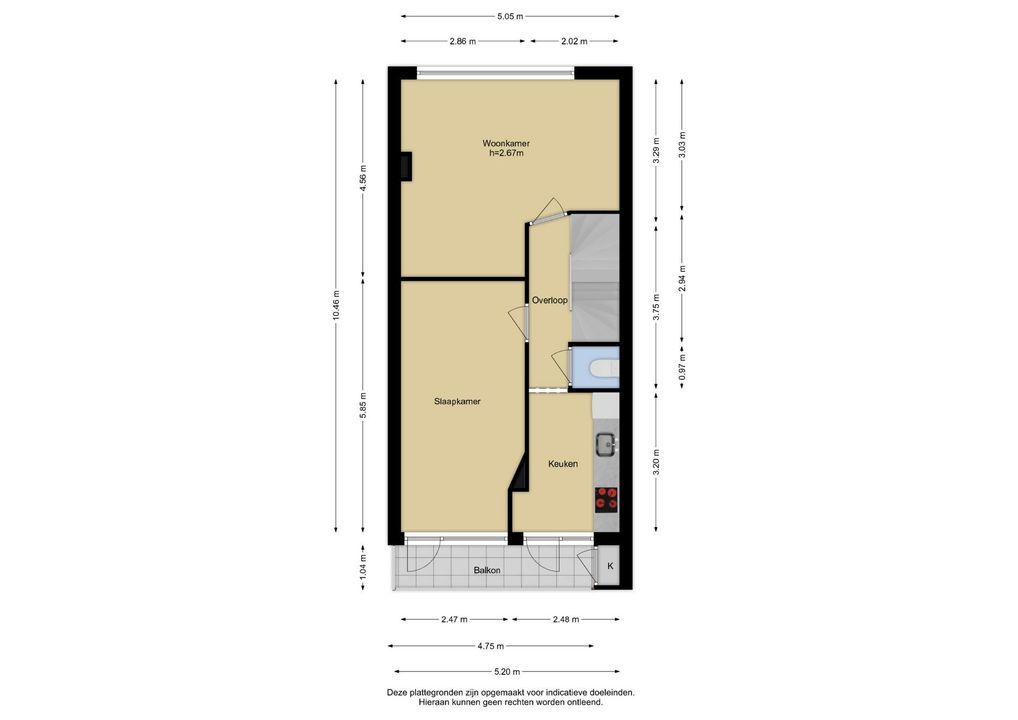 De woningentree is op de begane grond: trap naar overloop eerste etage; de woonkamer bevindt zich aan de voorzijde. Er is een moderne half open keuken met inbouwapparatuur waaronder een elektrische kookplaat, afzuigkap, combi oven/magnetron, koel/vriescombinatie, vaatwasser met toegang tot het balkon over de volle breedte met balkonkast; riante aan de achterzijde gelegen slaapkamer ( eenvoudig bij de woonkamer te trekken) met toegang tot het balkon dat op het zuid-westen is georiënteerd; toilet.