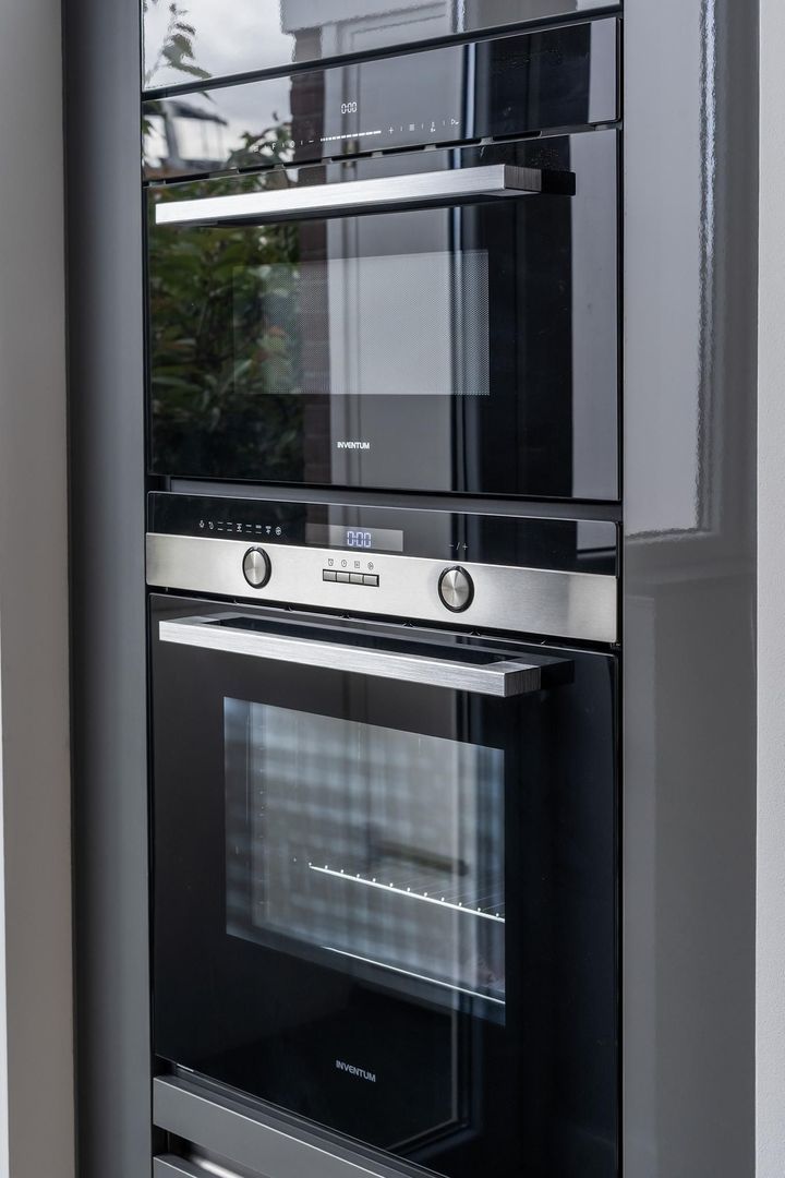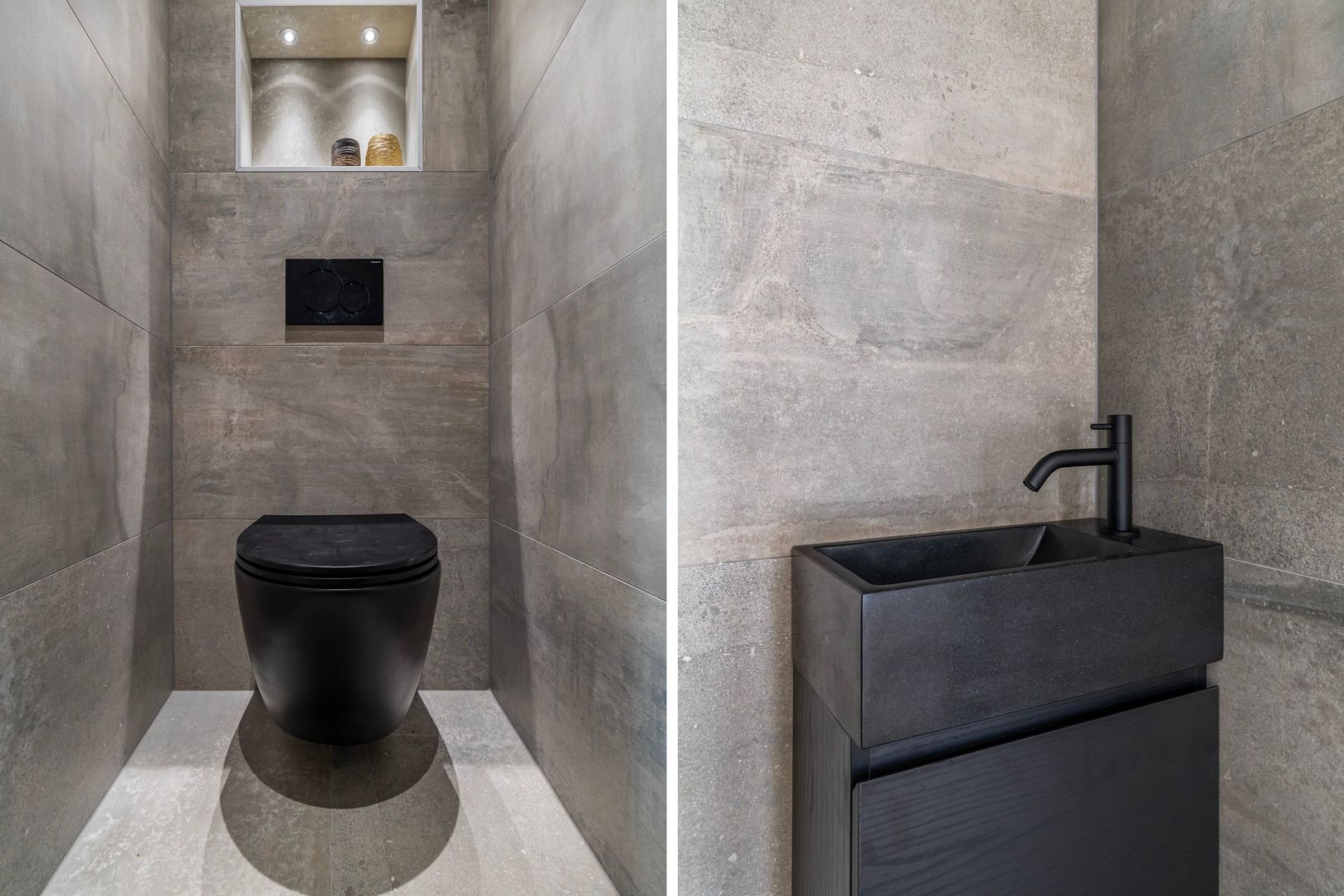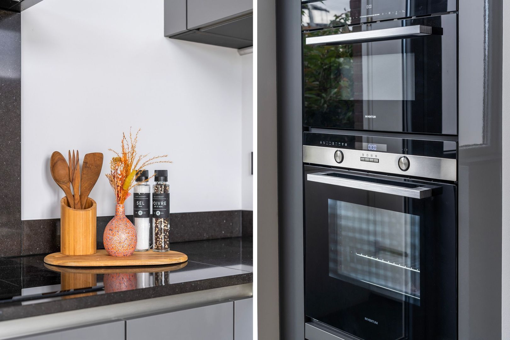 Woningentree op de begane grond met meterkast en binnentrap naar de overloop op de 1e etage; modern toilet (wandcloset) met fonteintje; riante woonkamer met openslaande deuren naar het balkon; luxe open keuken in hoekopstelling welke o.a. is voorzien van een fraai stenen werkblad, inductiekookplaat, afzuigkap, Quooker, combimagnetron/-oven, magnetron, koelkast, vriezer en vaatwasser;