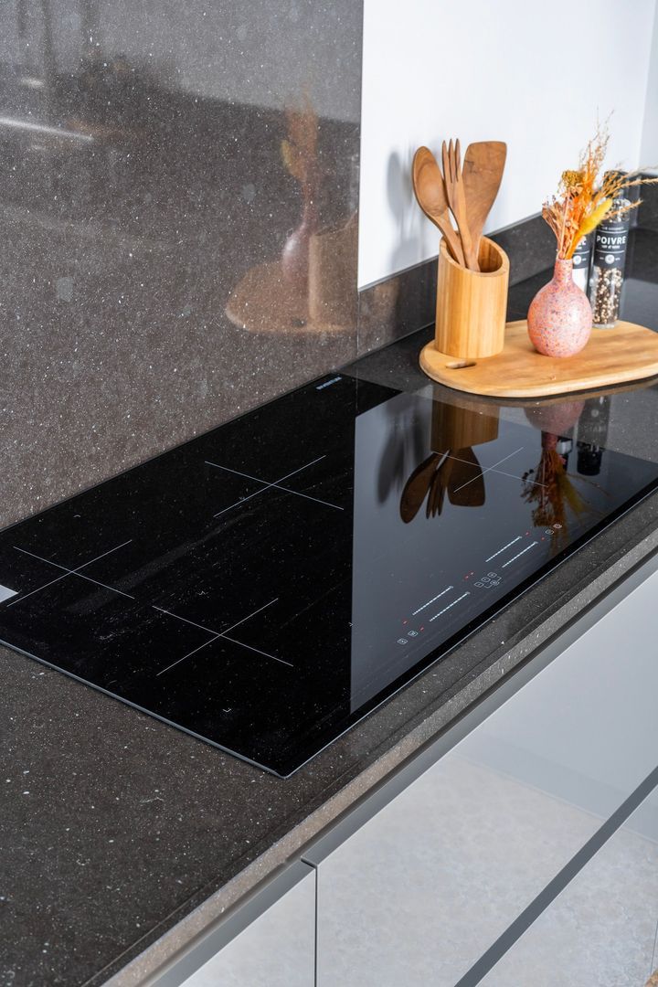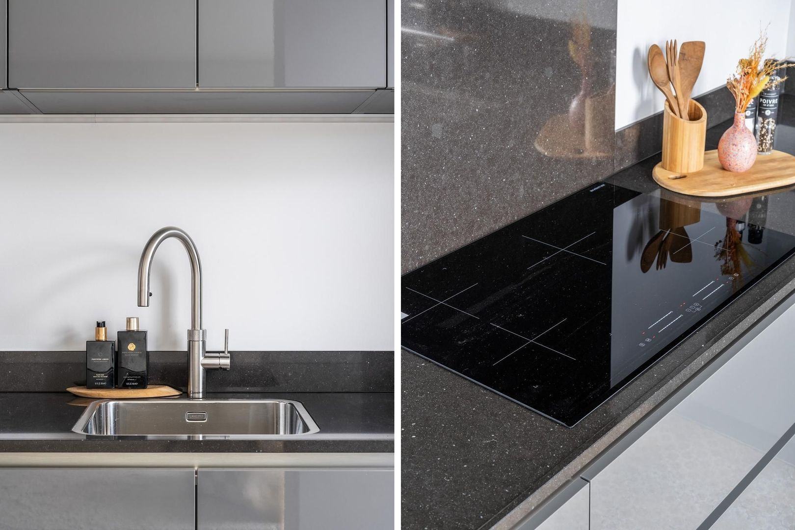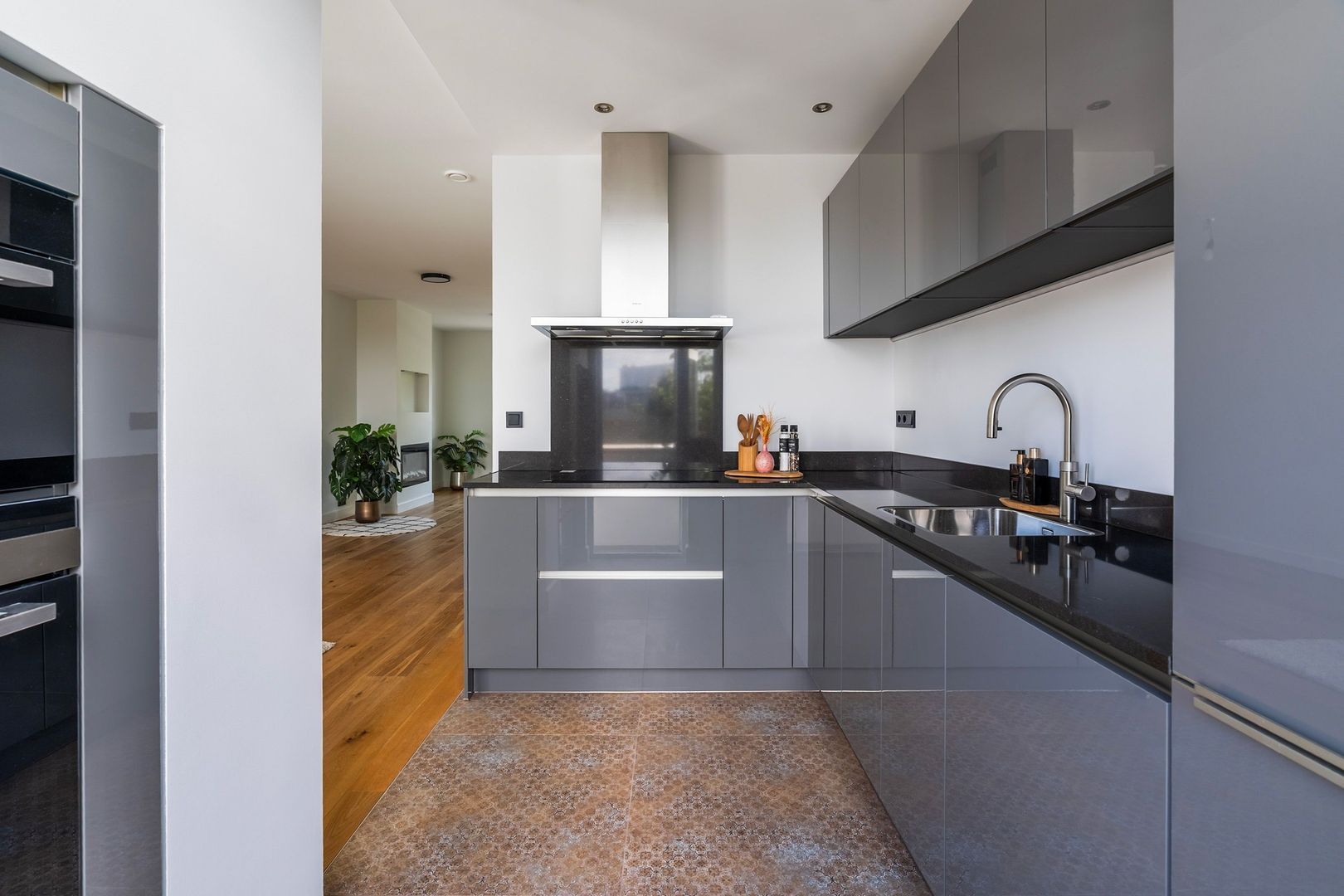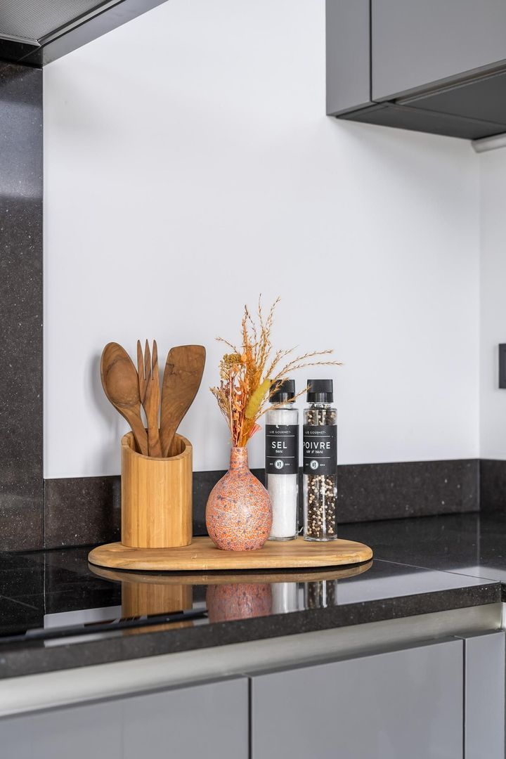 Woningentree op de begane grond met meterkast en binnentrap naar de overloop op de 1e etage; modern toilet (wandcloset) met fonteintje; riante woonkamer met openslaande deuren naar het balkon; luxe open keuken in hoekopstelling welke o.a. is voorzien van een fraai stenen werkblad, inductiekookplaat, afzuigkap, Quooker, combimagnetron/-oven, magnetron, koelkast, vriezer en vaatwasser;
