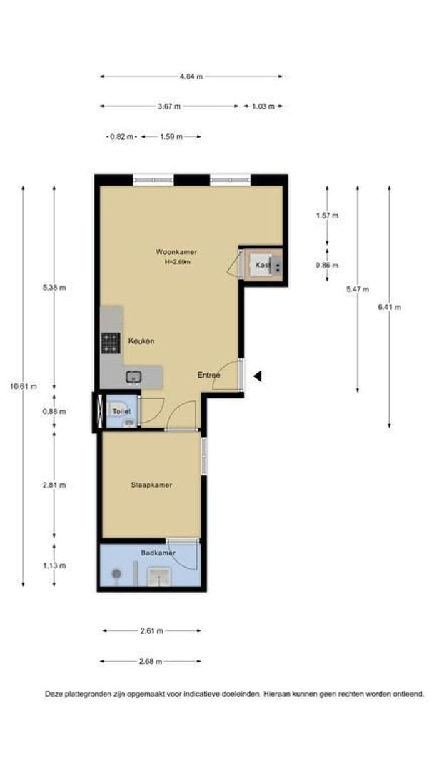 Entree appartement; woon-/eetkamer ca. 5.38x4.84 met luxe open keuken voorzien van een inductiekookplaat, afzuigkap, combi-oven, koelkast, vriezer en vaatwasser ; slaapkamer ca.2.81x2.61 met toegang tot de luxe badkamer ca. 2.61.1.13 voorzien van inloopdouche, toilet en wastafelmeubel.