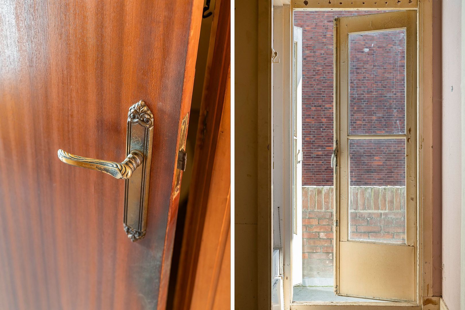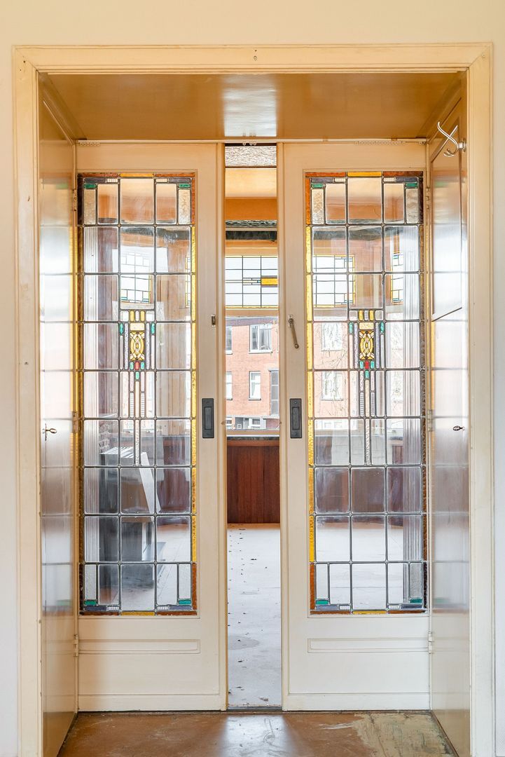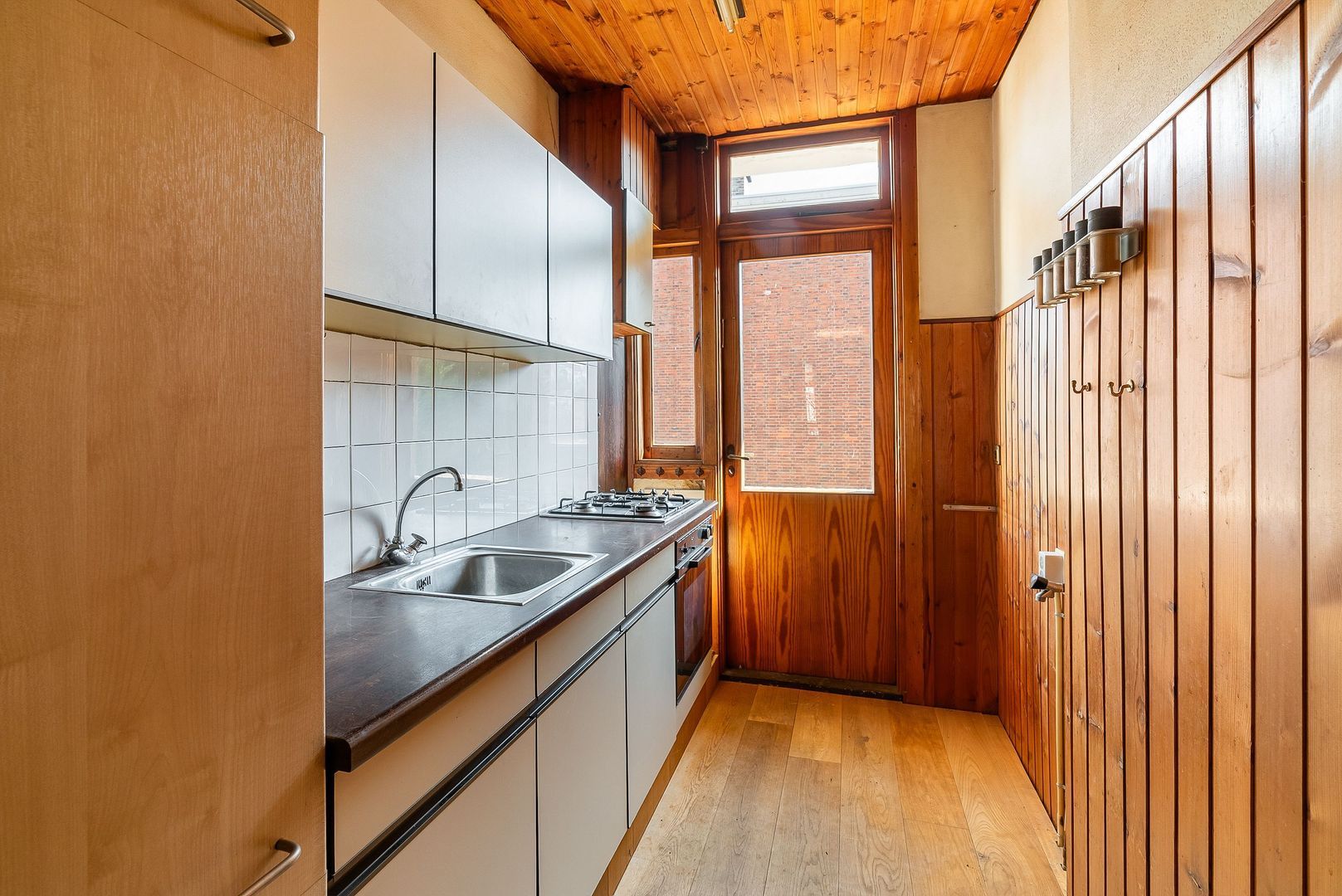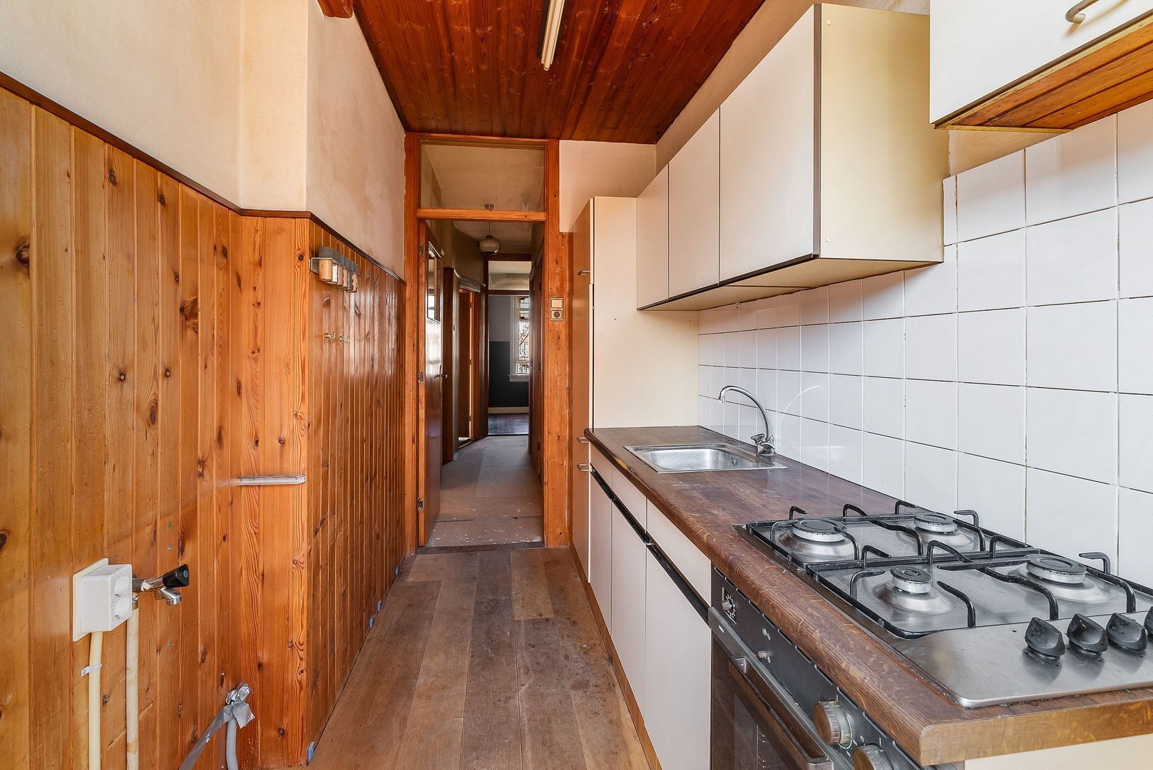 Entree op de 1e etage via open portiek; entree woning, hal met meterkast; net toilet, riante kamer en suite ca. 4.96x2.97 en 4.99x3.17/3.50 met erker, glas in lood schuifseparatie, 4 suite kasten, een schouw, openslaande deuren naar het zonnige achterbalkon, eenvoudige keuken met oven en gasfornuis en toegang tot het balkon met balkonkast; 1e slaapkamer aan de voorzijde 2.57x2.82; 2e slaapkamer aan de achterzijde 3.27x1.98 met openslaande deuren naar het balkon; drie ingebouwde kasten en een eenvoudige douche.