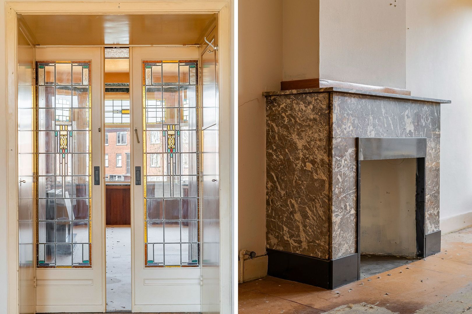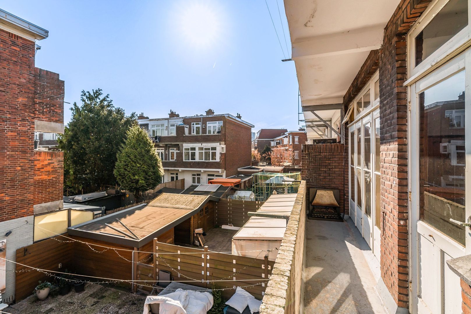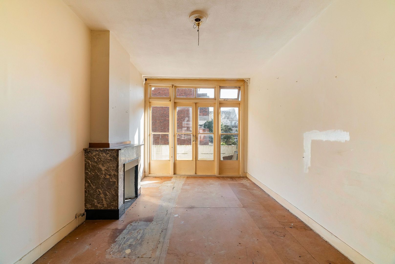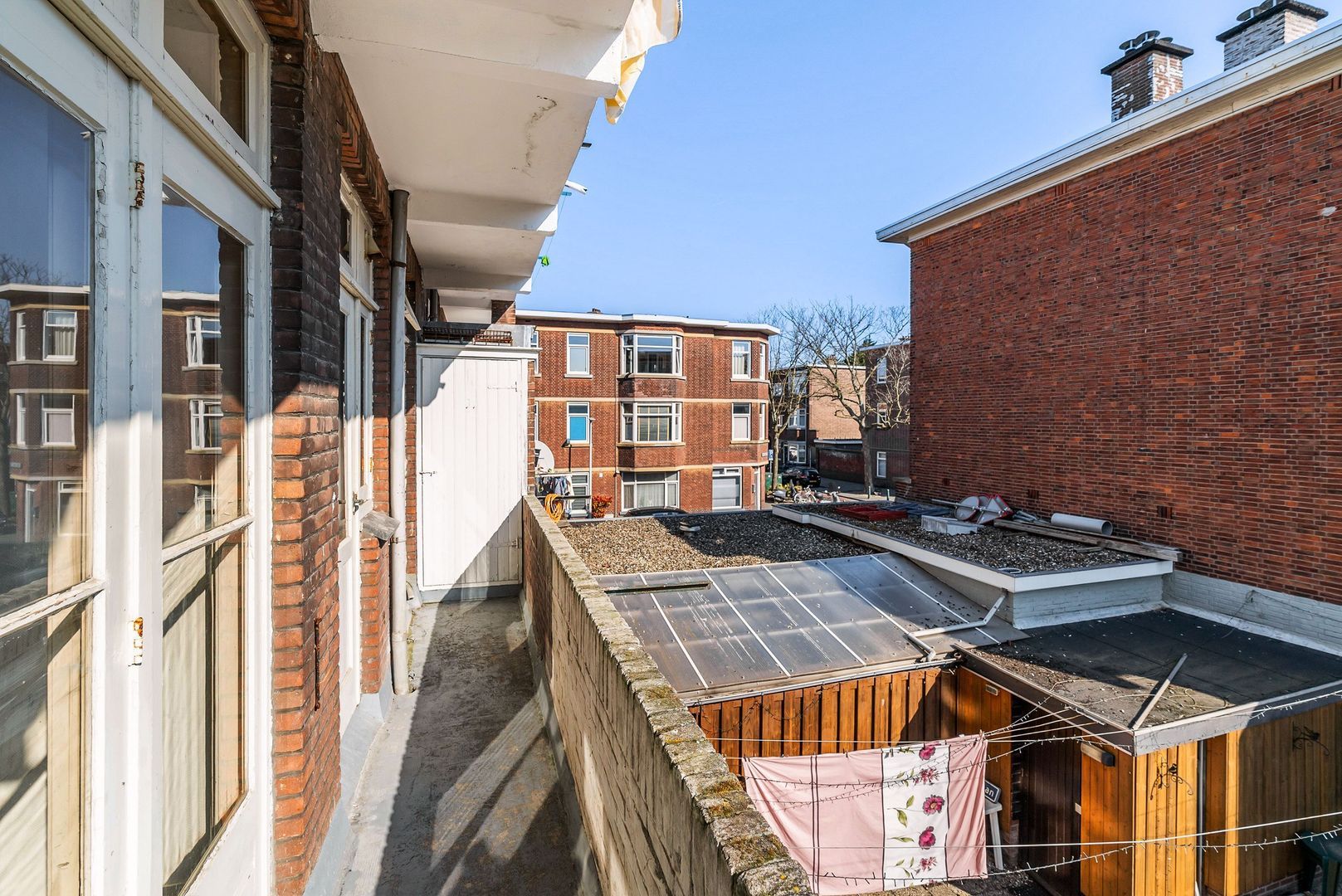 Entree op de 1e etage via open portiek; entree woning, hal met meterkast; net toilet, riante kamer en suite ca. 4.96x2.97 en 4.99x3.17/3.50 met erker, glas in lood schuifseparatie, 4 suite kasten, een schouw, openslaande deuren naar het zonnige achterbalkon, eenvoudige keuken met oven en gasfornuis en toegang tot het balkon met balkonkast; 1e slaapkamer aan de voorzijde 2.57x2.82; 2e slaapkamer aan de achterzijde 3.27x1.98 met openslaande deuren naar het balkon; drie ingebouwde kasten en een eenvoudige douche.
