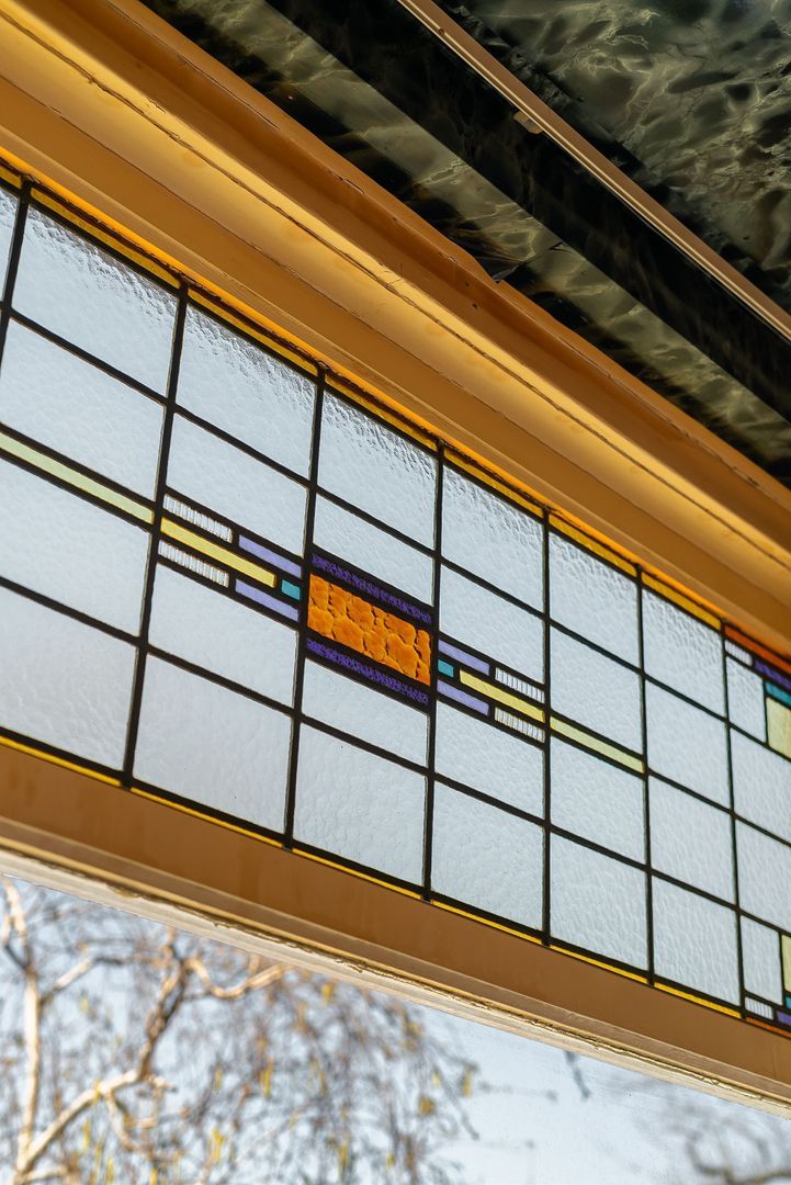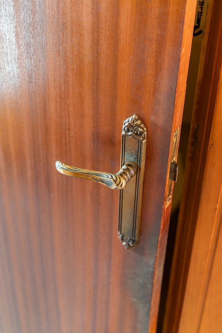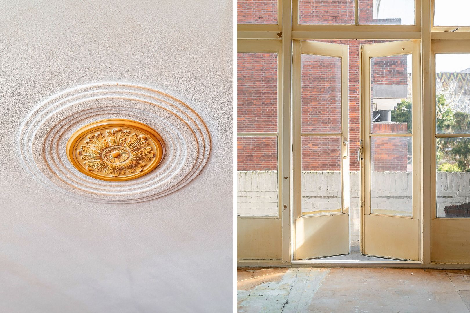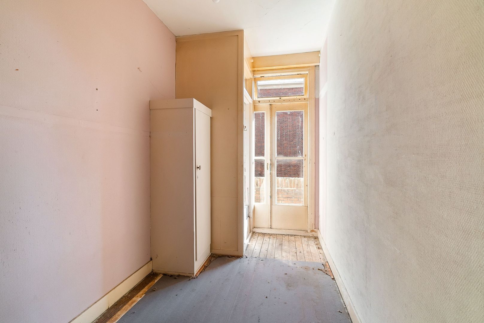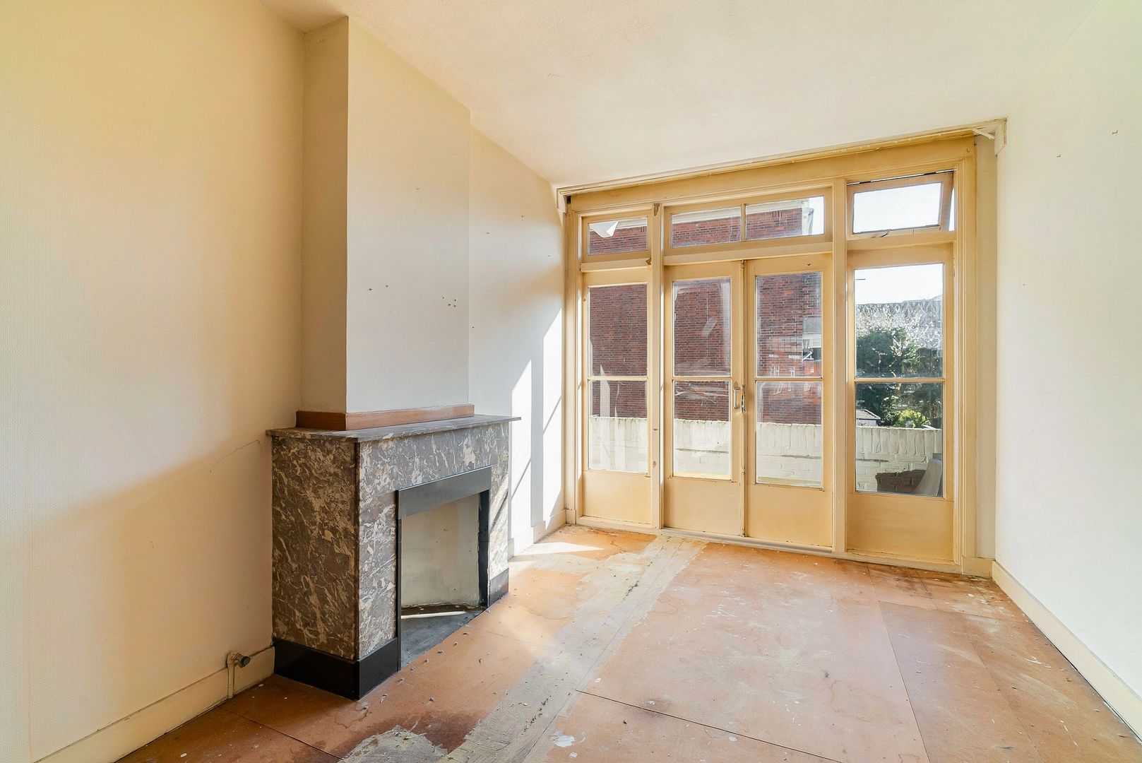Entree op de 1e etage via open portiek; entree woning, hal met meterkast; net toilet, riante kamer en suite ca. 4.96x2.97 en 4.99x3.17/3.50 met erker, glas in lood schuifseparatie, 4 suite kasten, een schouw, openslaande deuren naar het zonnige achterbalkon, eenvoudige keuken met oven en gasfornuis en toegang tot het balkon met balkonkast; 1e slaapkamer aan de voorzijde 2.57x2.82; 2e slaapkamer aan de achterzijde 3.27x1.98 met openslaande deuren naar het balkon; drie ingebouwde kasten en een eenvoudige douche.