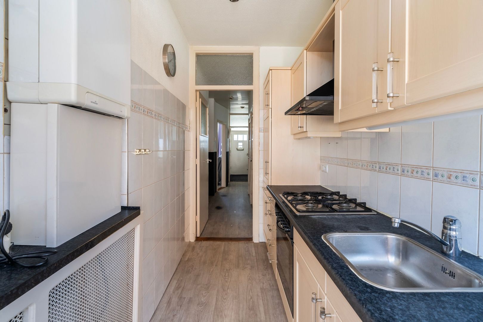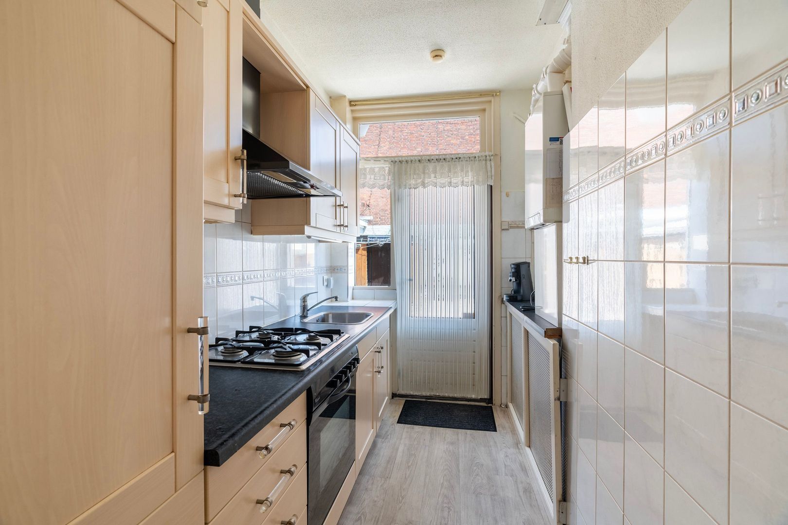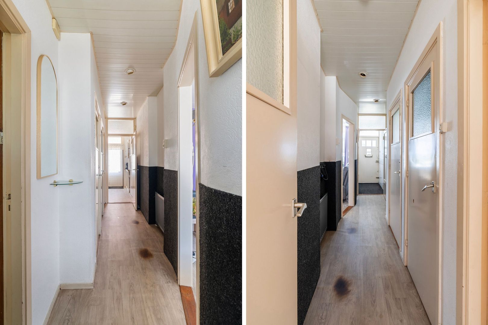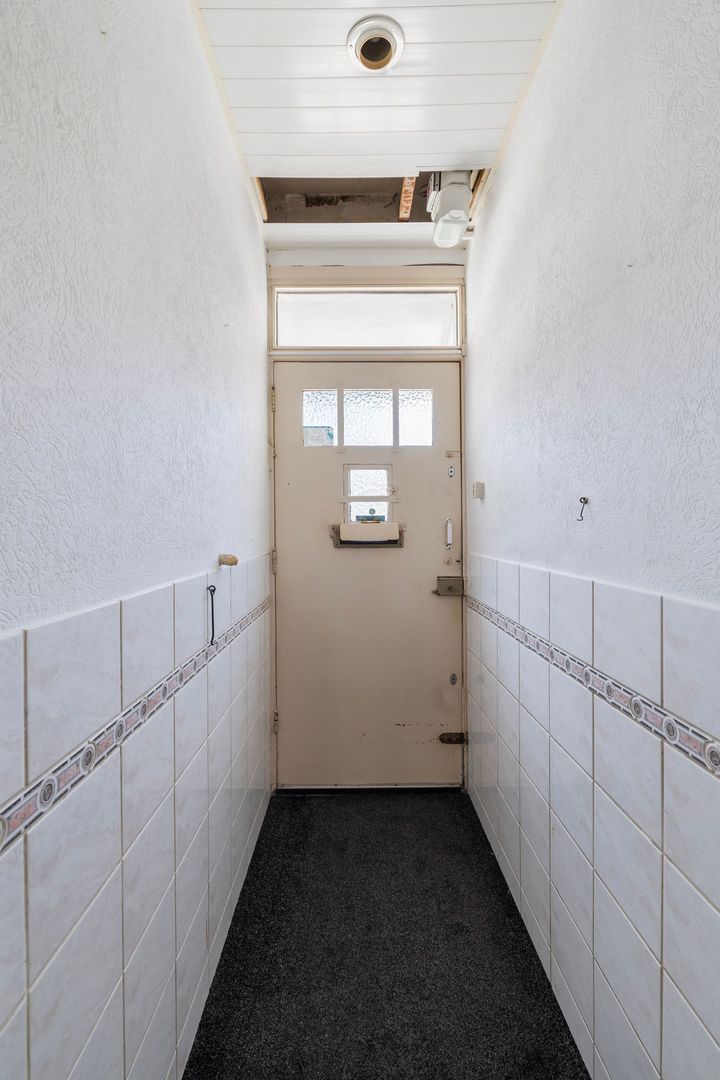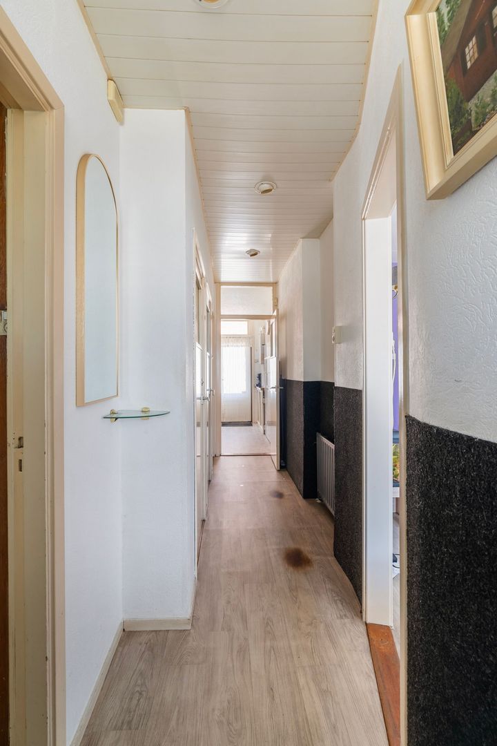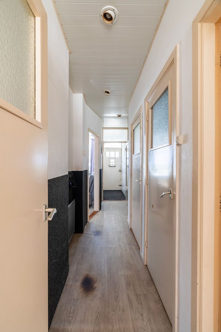 Entree; entree woning, tochtportaal; gang al met meterkast; net toilet, woonkamer met erker, aan de achterzijde 1e slaapkamer; 2e slaapkamer aan de achterzijde, moderne keuken met kookplaat, afzuigkap, oven, koelkast en toegang tot de tuin met houten schuur; 3e slaapkamer aan de voorzijde; eenvoudige badkamer met douche, wastafel en wasmachine aansluiting.