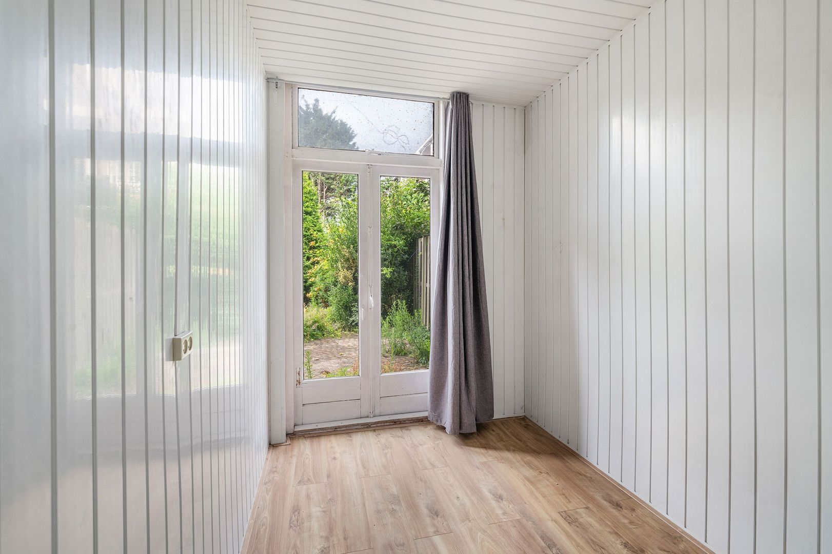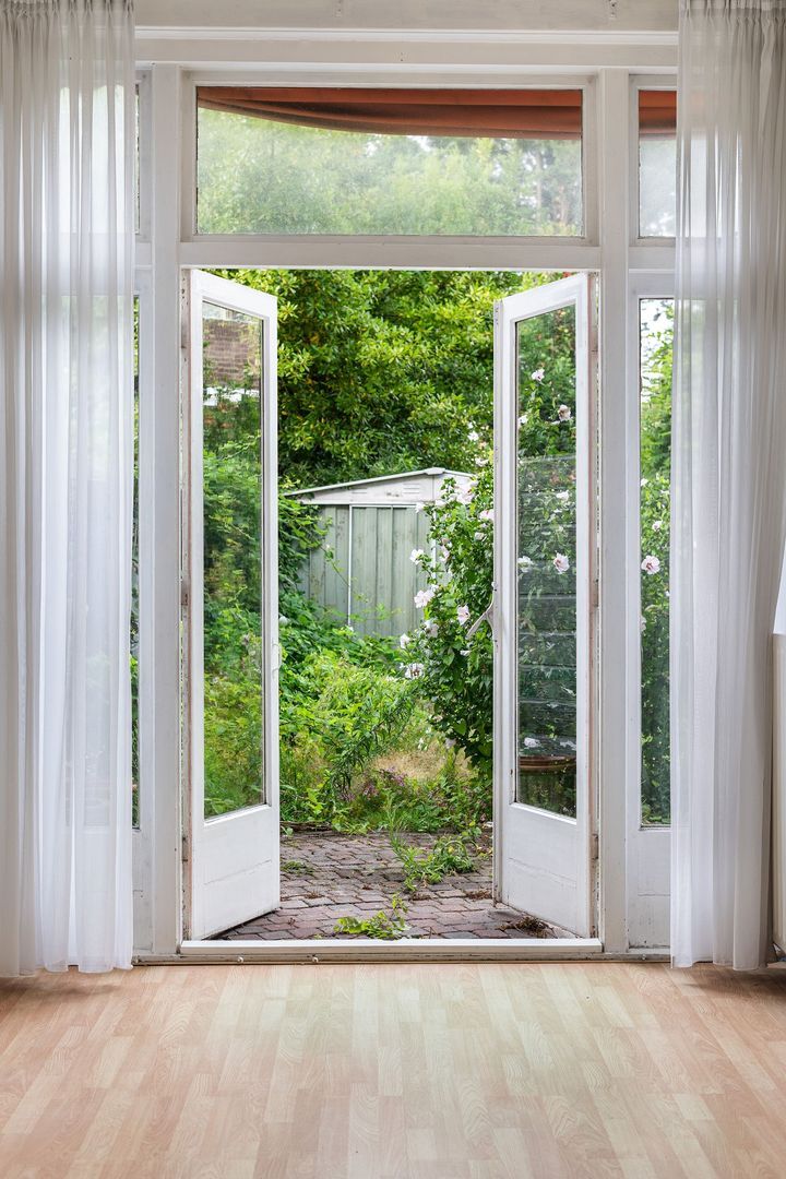 - Voorzijde voorzien van houten kozijnen met dubbel glas