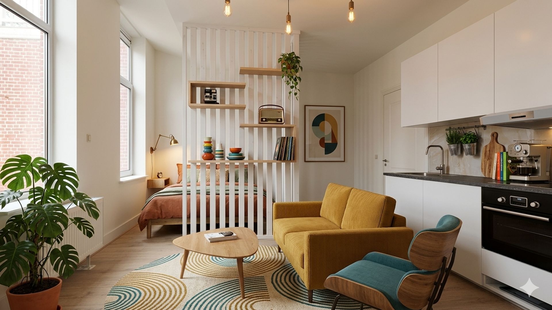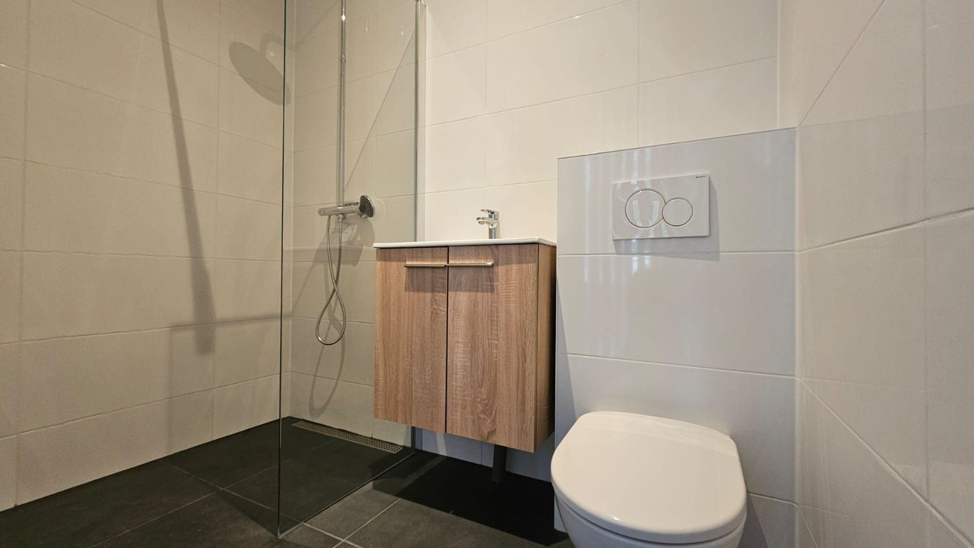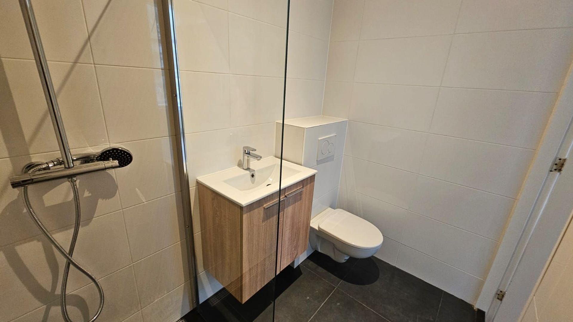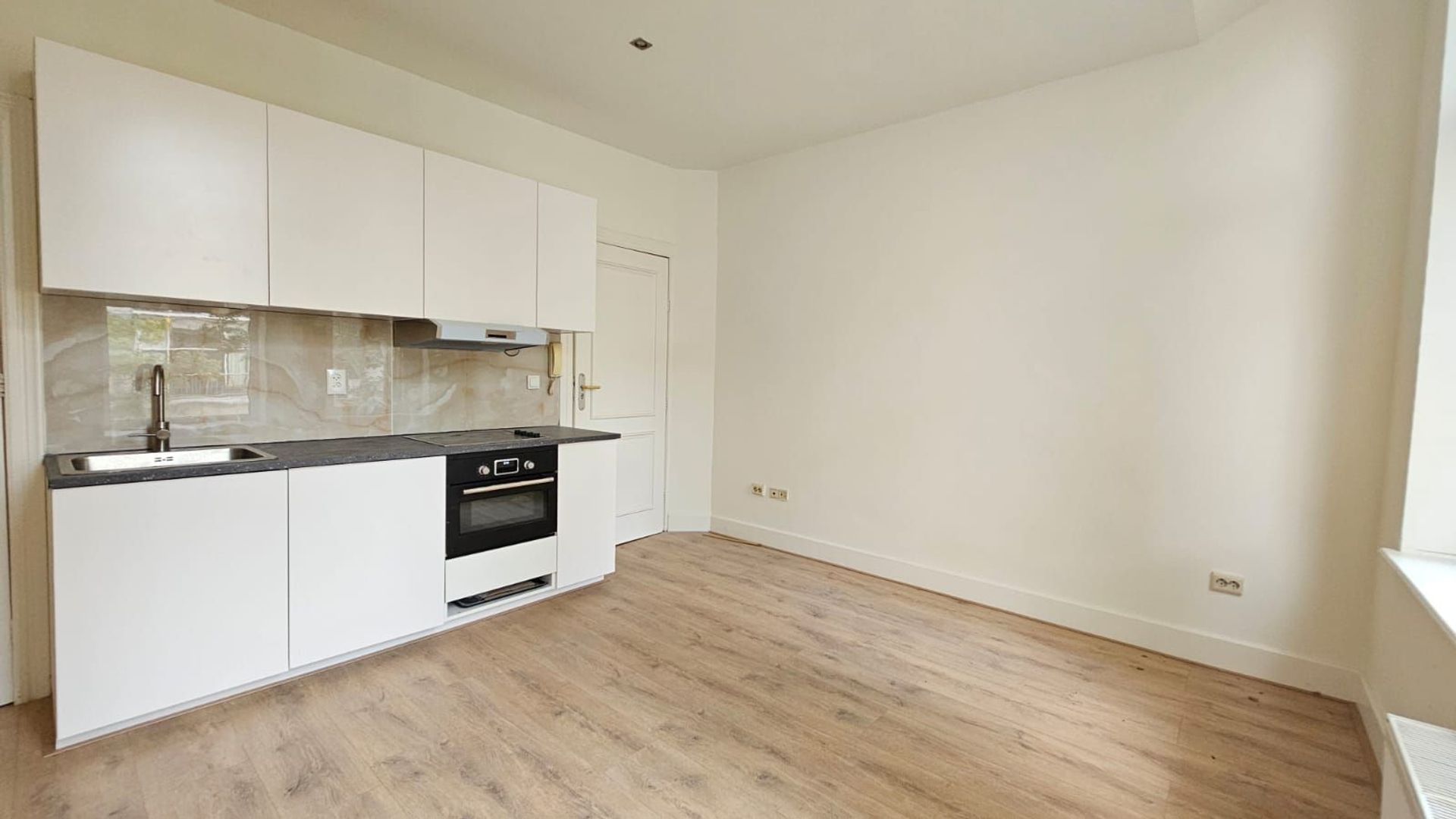 Centrale entree aan de straatzijde, trap naar de eerste etage. Vanuit de centrale hal toegang tot de woning. De woonkamer is heerlijk licht dankzij drie grote raampartijen en beschikt over een nette open keuken met inductiekookplaat, koelkast, oven en afzuigkap. Het slaapgedeelte is slim afgescheiden met een roomdivider. De badkamer is keurig afgewerkt en voorzien van douche, toilet en wastafelmeubel.