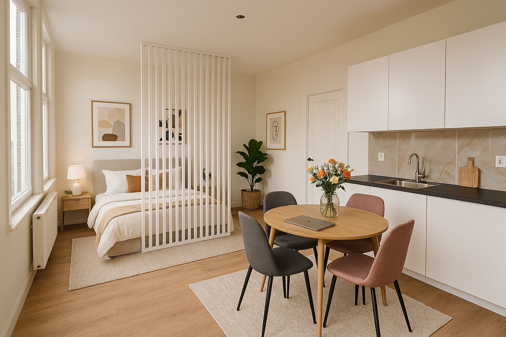 Centrale entree aan de straatzijde, trap naar de tweede etage. Vanuit de centrale hal toegang tot de woning. De woonkamer is heerlijk licht dankzij drie grote raampartijen en beschikt over een nette open keuken met inductiekookplaat, koelkast, oven en afzuigkap. Het slaapgedeelte is slim afgescheiden met een roomdivider. De badkamer is keurig afgewerkt en voorzien van douche, toilet en wastafelmeubel.