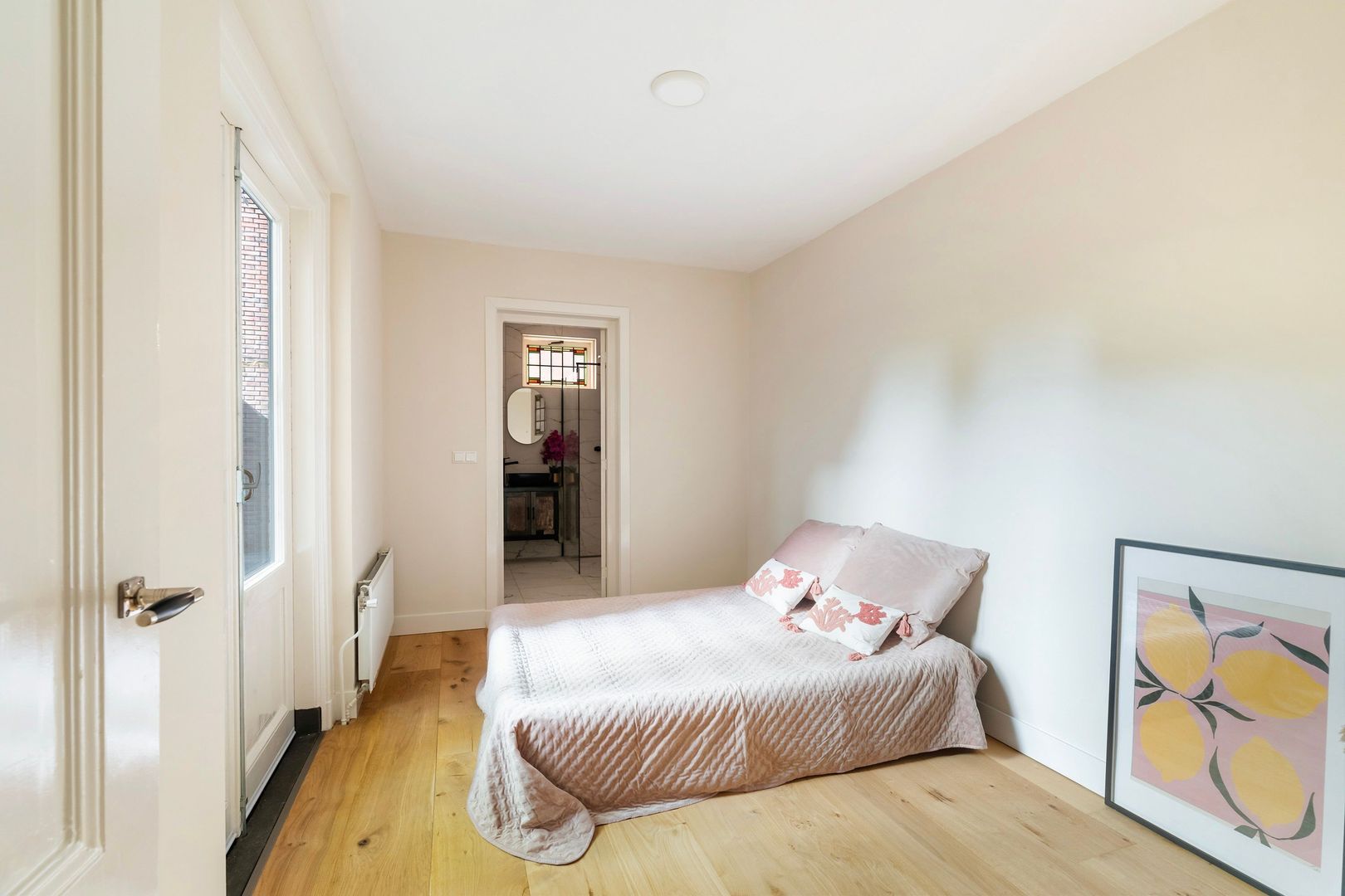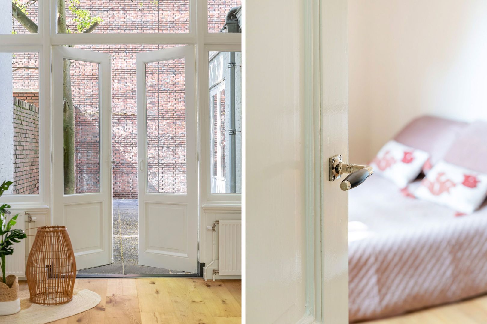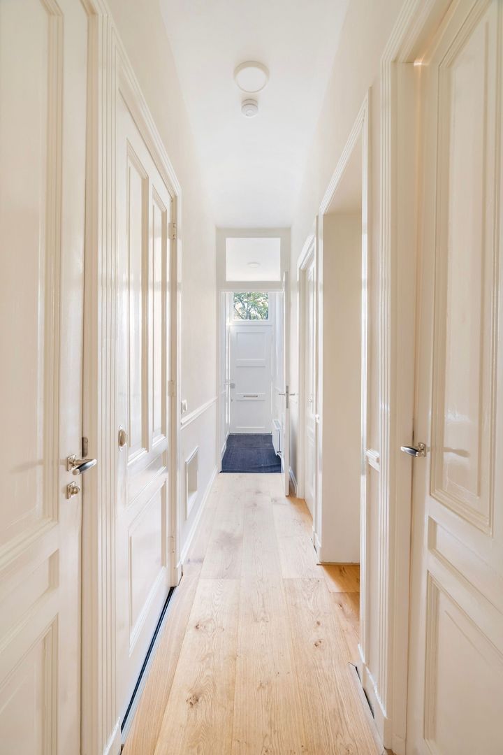 Woningentree; tochtportaal; gang met vaste kast; modern toilet (wandcloset) met fonteintje; sfeervolle woonkamer en suite met glas in lood schuifseparatie, 4 vaste kasten, fraaie schouwen en openslaande deuren naar de achtertuin; moderne keuken voorzien van een inductiekookplaat, afzuigkap, combimagnetron/-oven, vaatwasser, koel-vriescombinatie, wasmachine aansluiting en toegang tot de tuin; ruime slaapkamer met openslaande deuren naar de achtertuin en toegang tot de moderne badkamer met inloopdouche en wastafelmeubel;