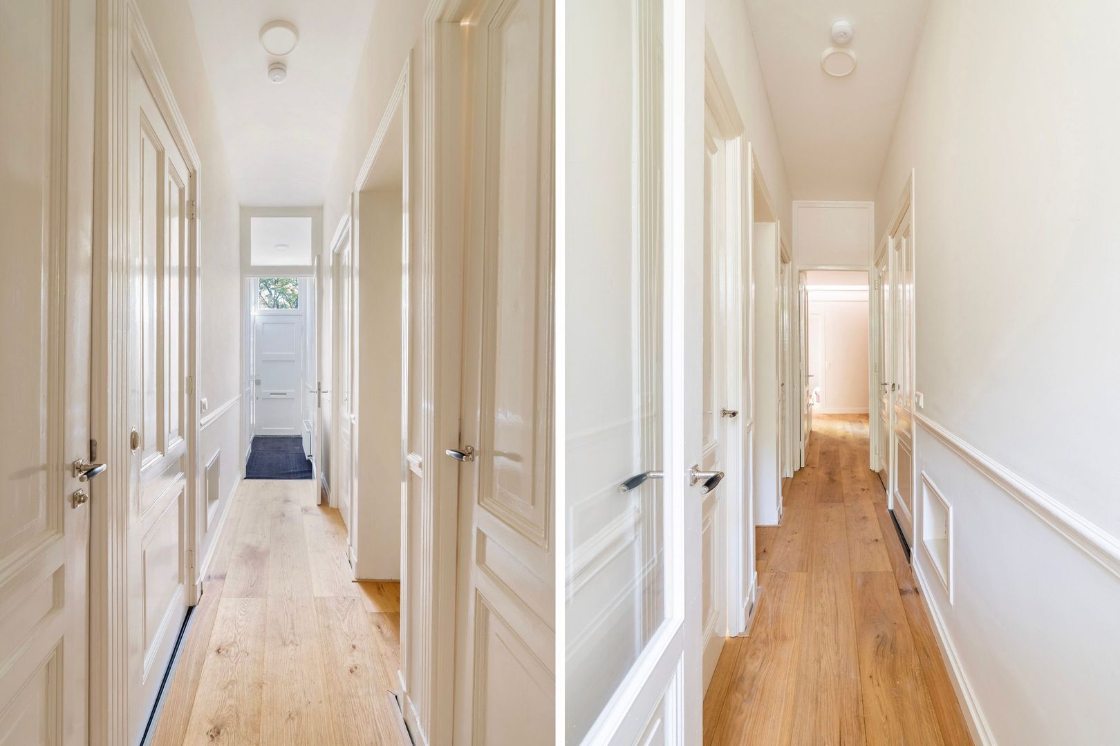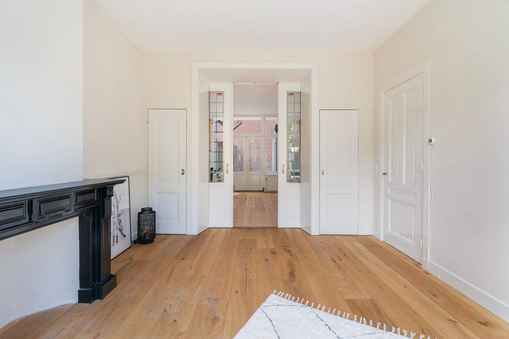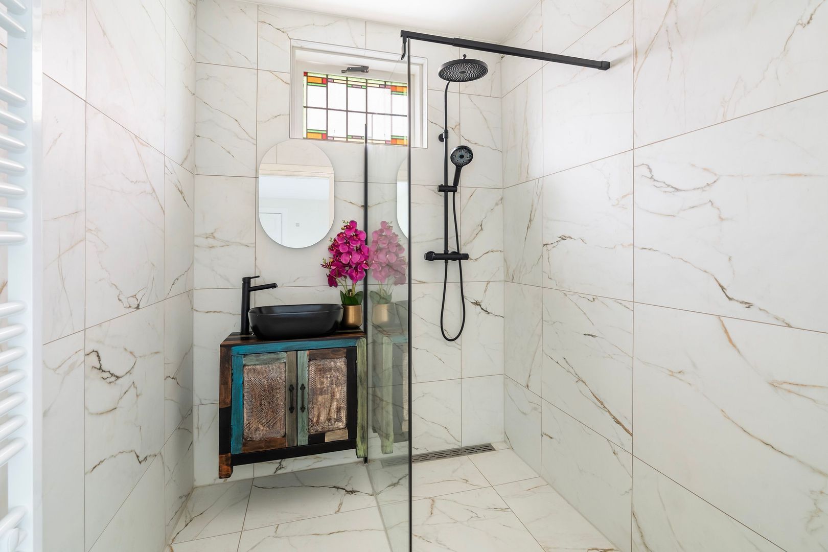 Woningentree; tochtportaal; gang met vaste kast; modern toilet (wandcloset) met fonteintje; sfeervolle woonkamer en suite met glas in lood schuifseparatie, 4 vaste kasten, fraaie schouwen en openslaande deuren naar de achtertuin; moderne keuken voorzien van een inductiekookplaat, afzuigkap, combimagnetron/-oven, vaatwasser, koel-vriescombinatie, wasmachine aansluiting en toegang tot de tuin; ruime slaapkamer met openslaande deuren naar de achtertuin en toegang tot de moderne badkamer met inloopdouche en wastafelmeubel;